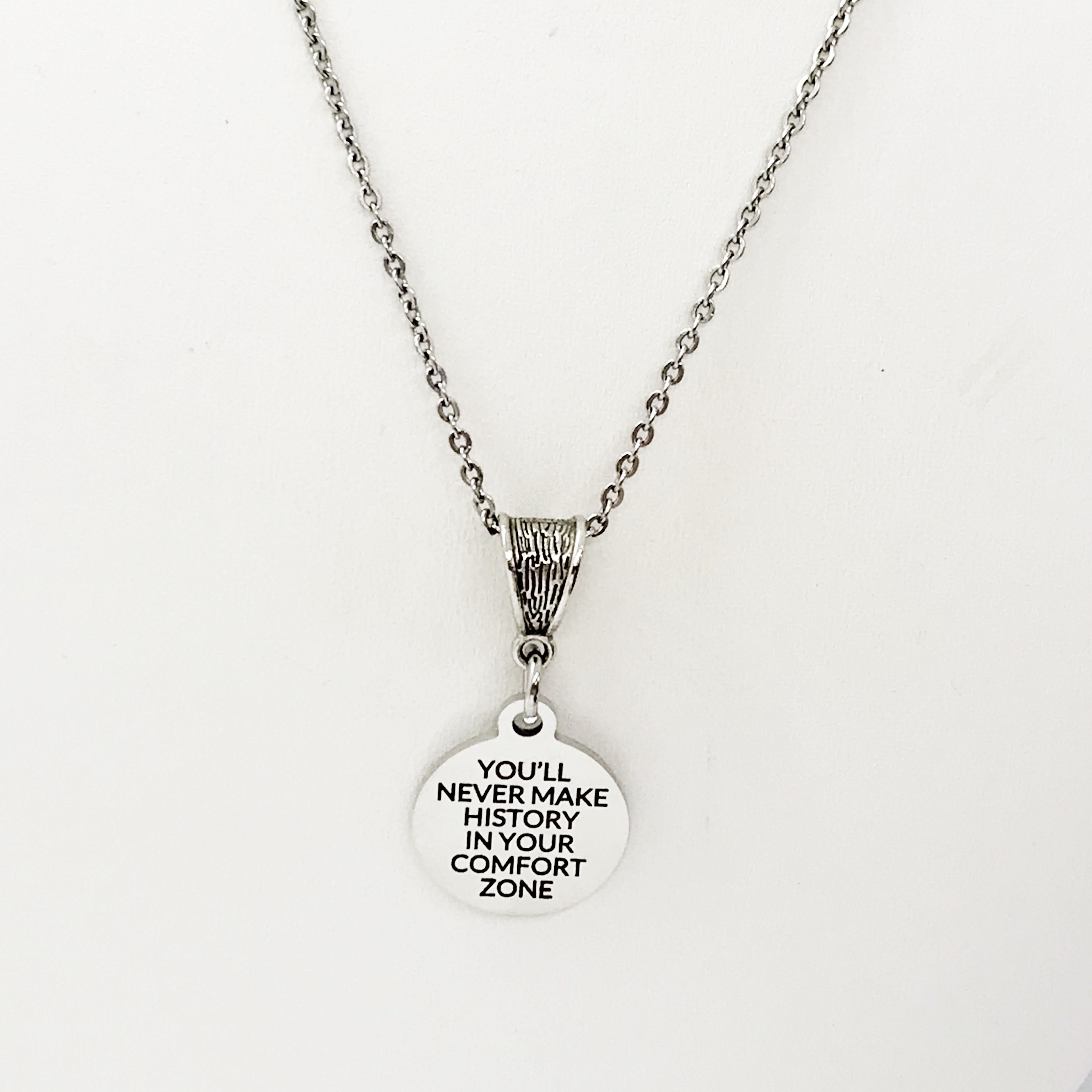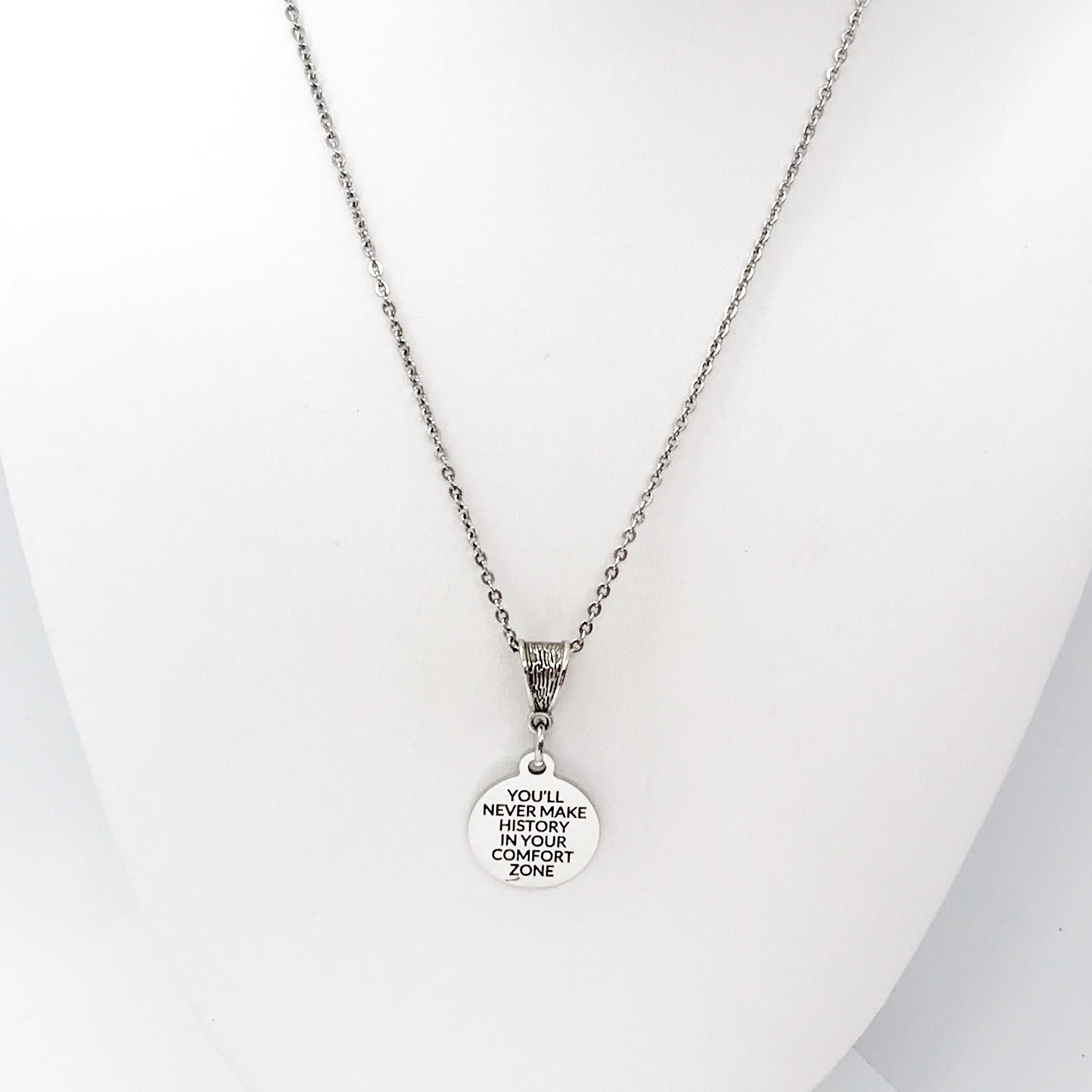 This beautiful necklace would make a great gift for a strong woman. The pendant is a stainless steel laser engraved charm with “You’ll never make history in the comfort zone” on it with a silver-tone bail.