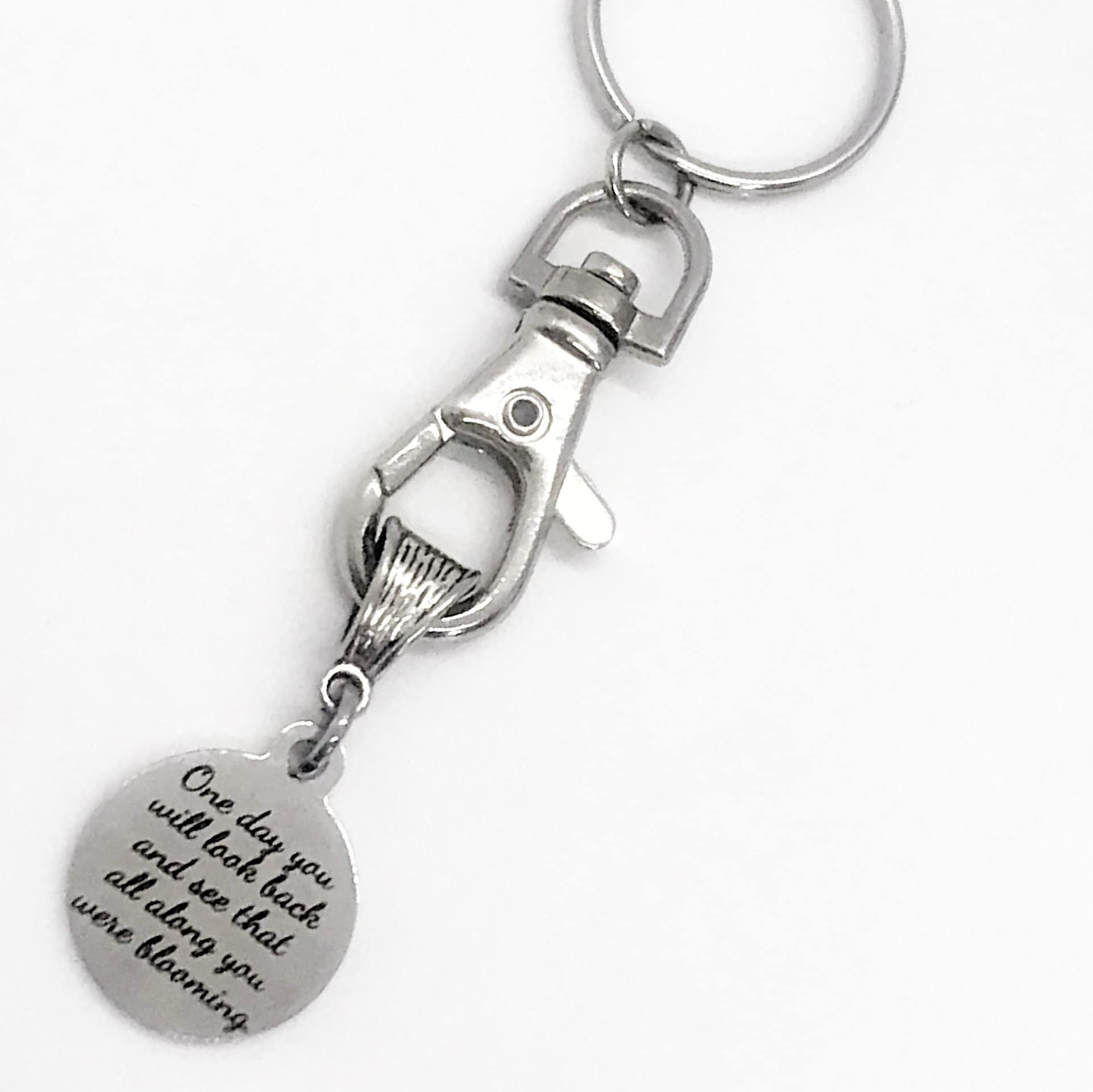 This keychain would make a great motivating keychain gift. It has a stainless steel laser engraved charm with “One day you will look back and see that all along you were blooming” on it.