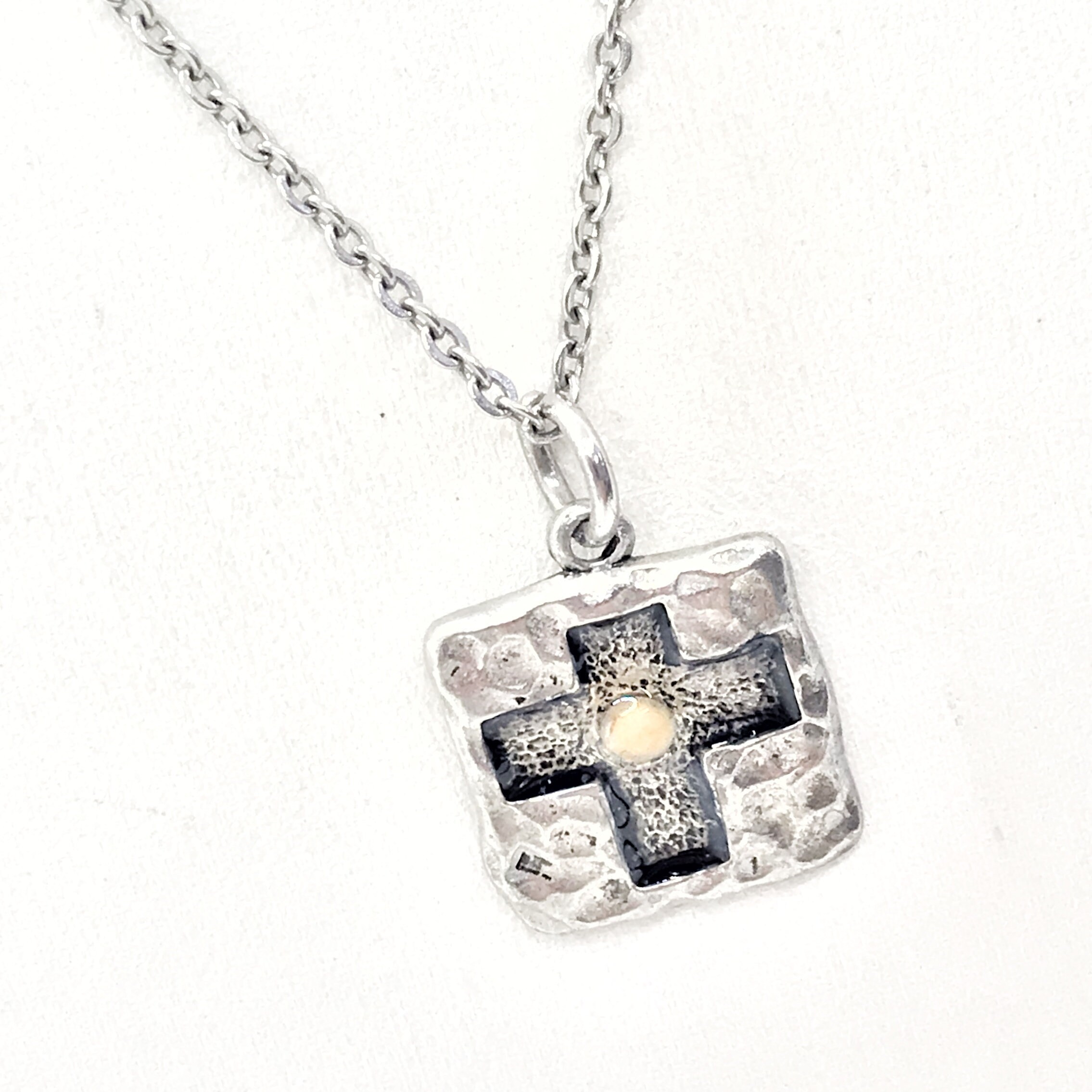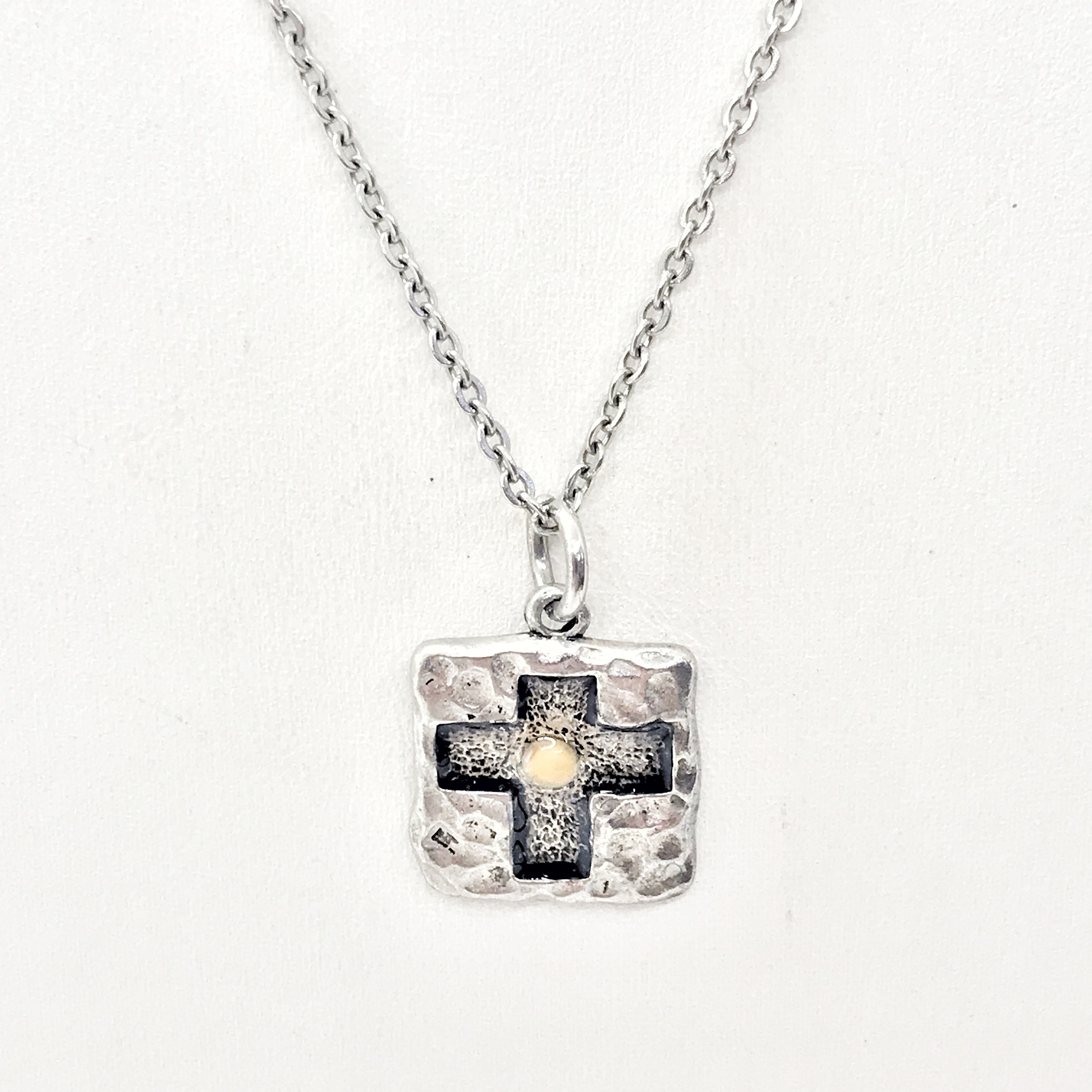 This simple but beautiful necklace has a stainless square charm with a cross inlay with a single mustard seed at the center. The mustard seed reminds us of the scripture verse of Matthew 17:20 that tells us that with the faith of a mustard seed we can move mountains.