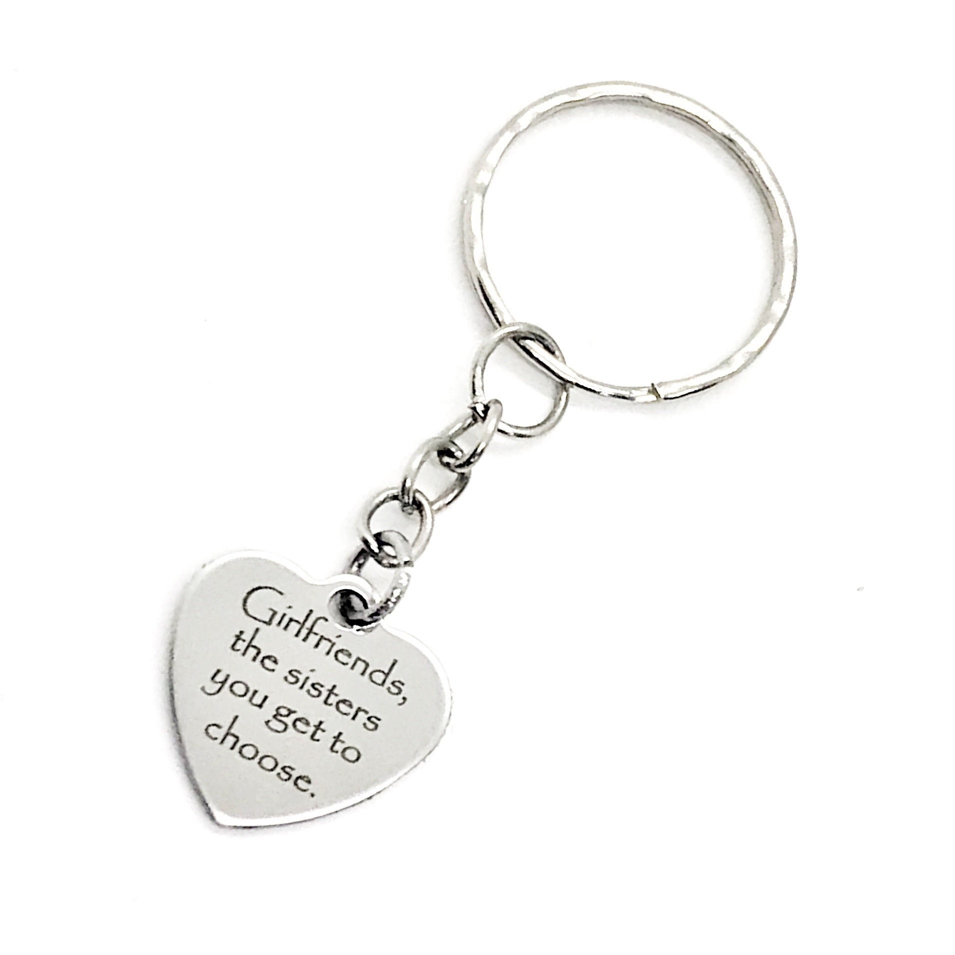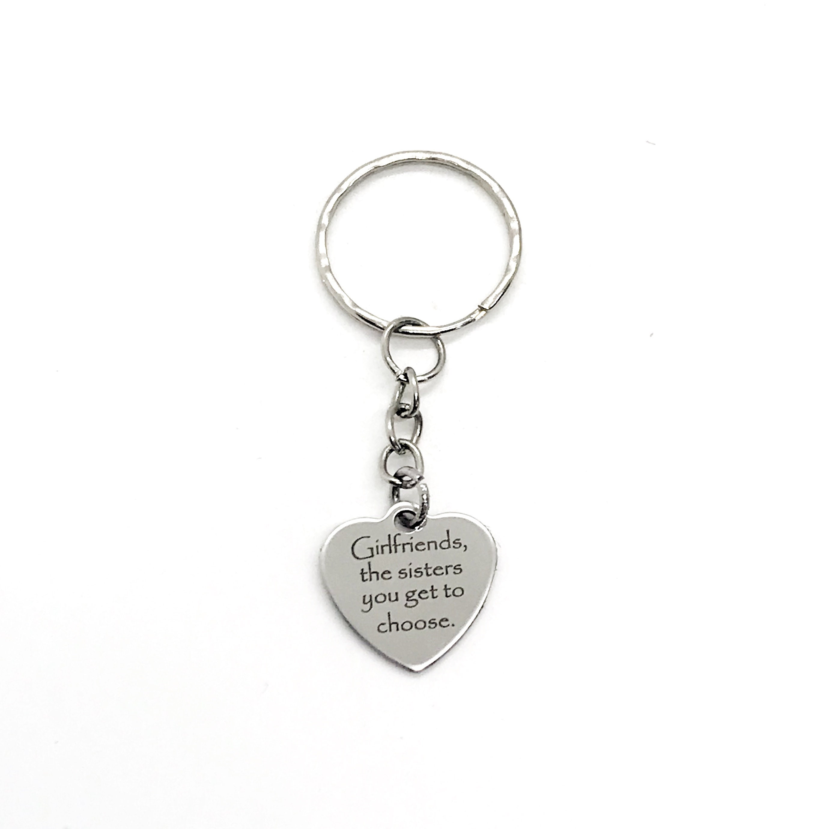 This is a wonderful girlfriend keychain gift! It has a stainless steel laser engraved charm with “Girlfriends are the sisters we get to choose" on it.