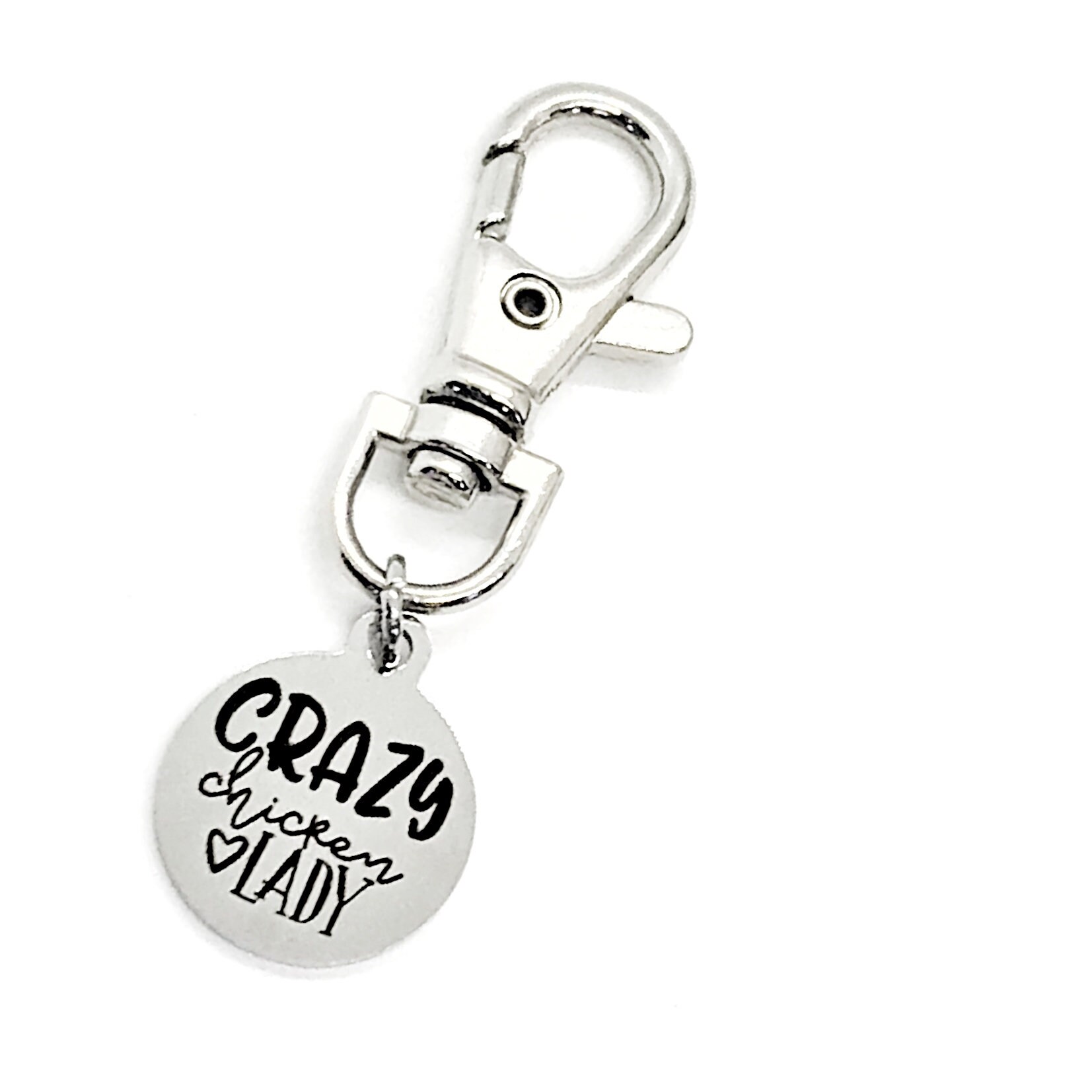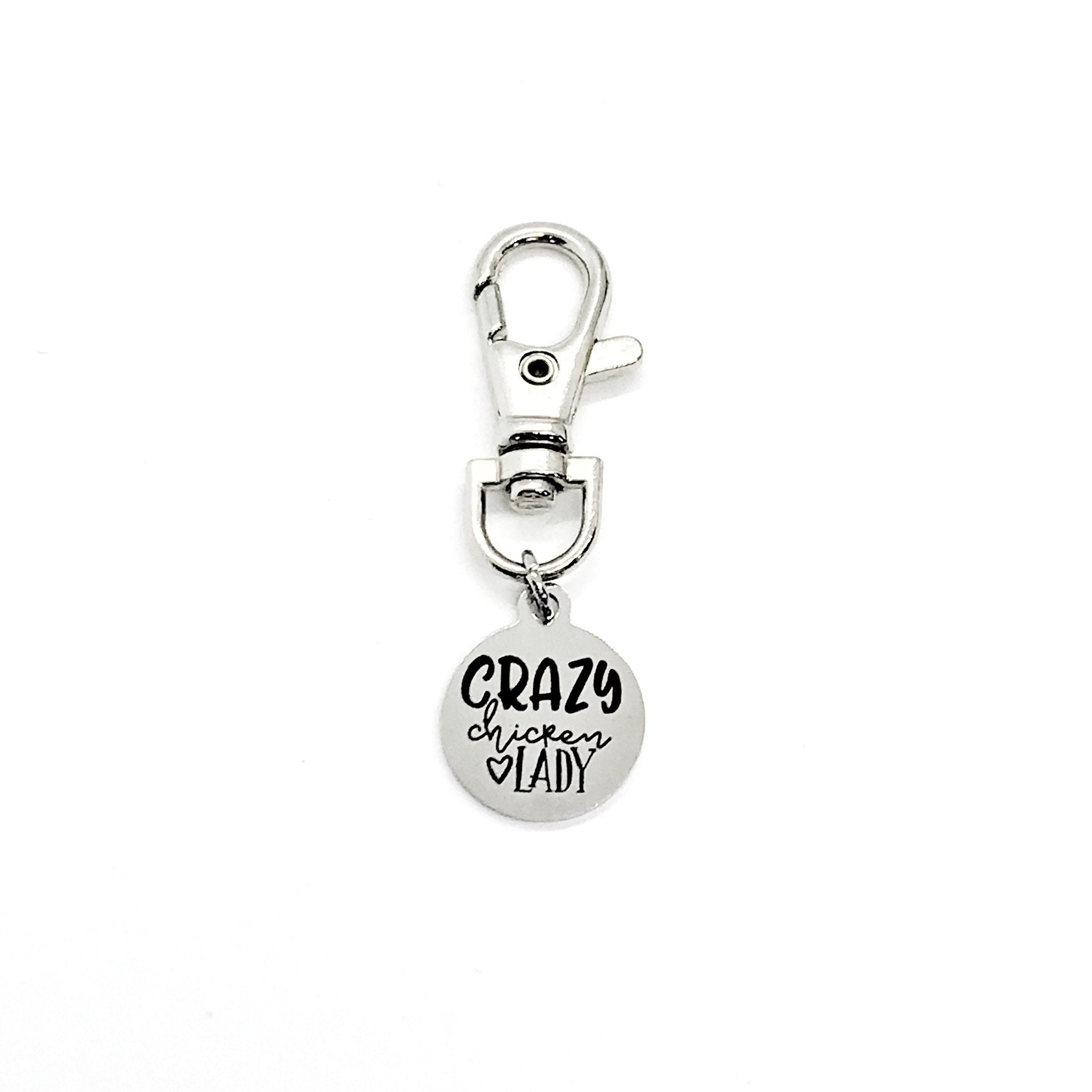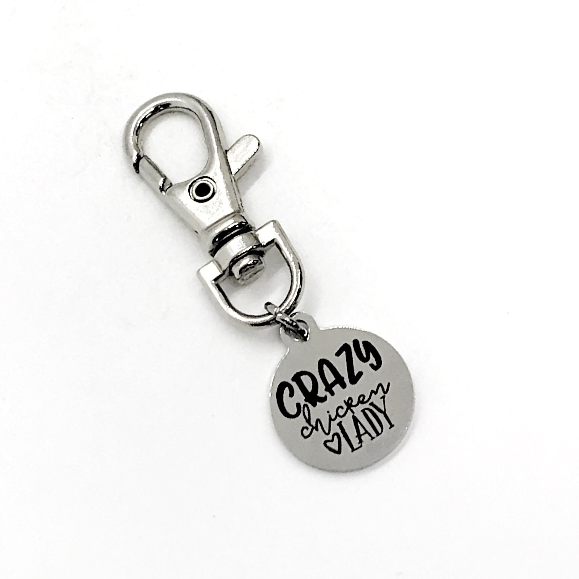 This is a great motivating zipper pull or bag charm. The charm measures approx 3/4 inch across. It has “Crazy chicken lady” on it.
