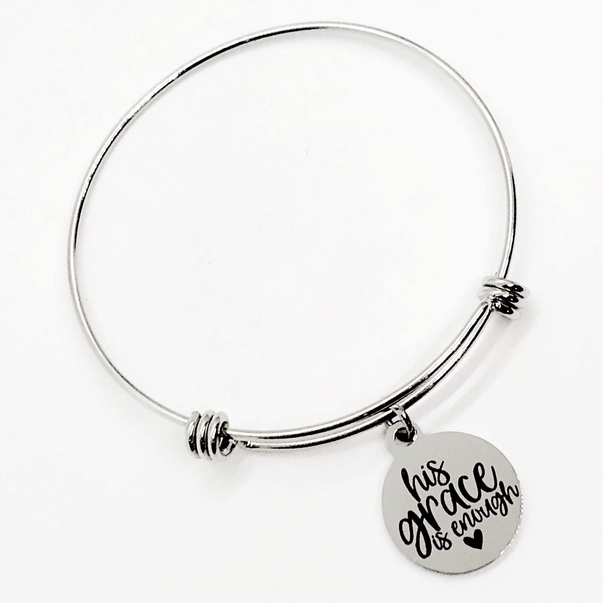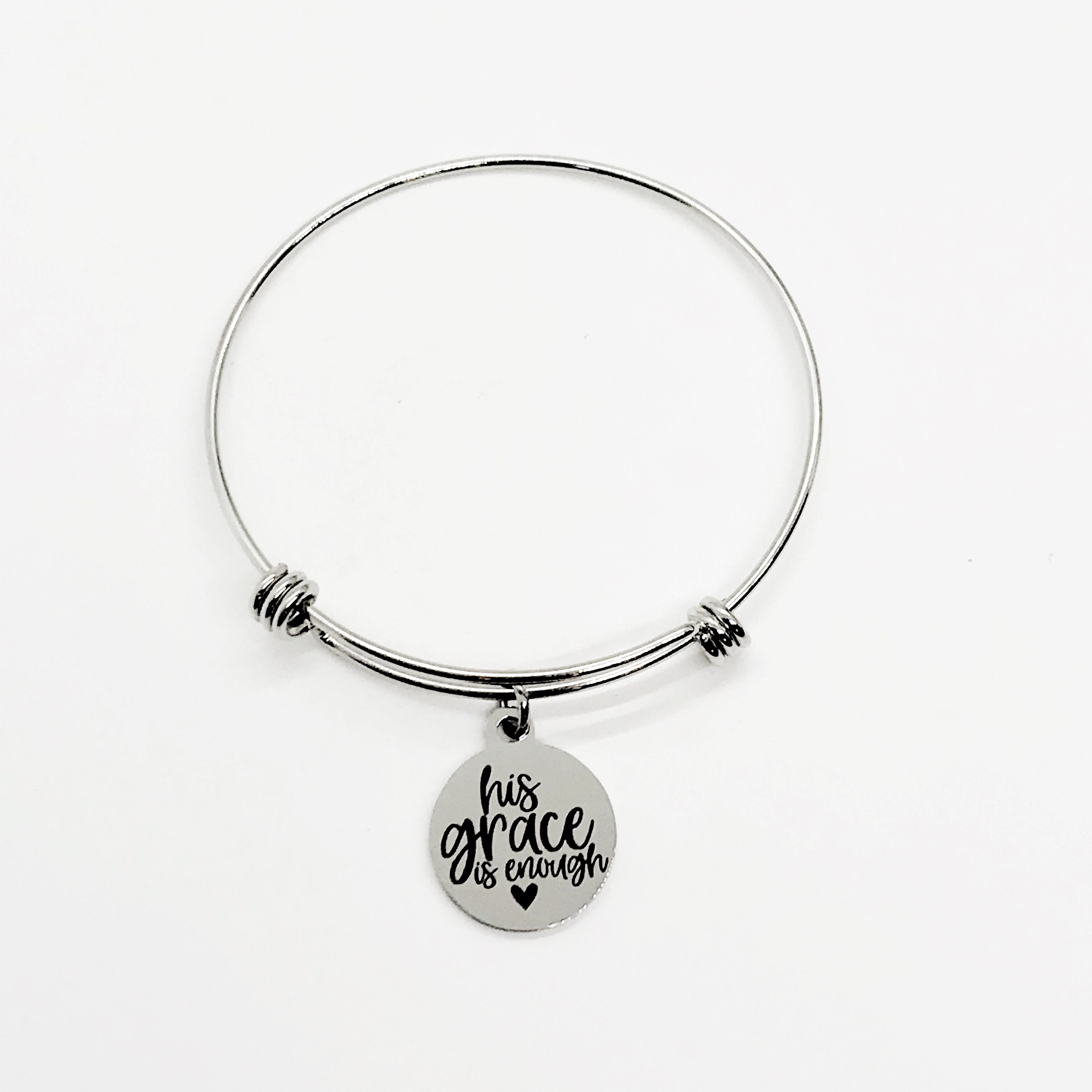 This is a beautiful bangle bracelet with a laser engraved stainless steel charm that has “God’s grace is enough” on it.