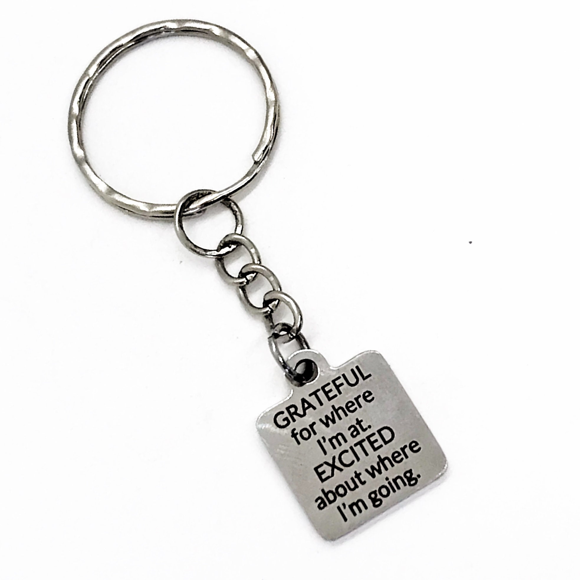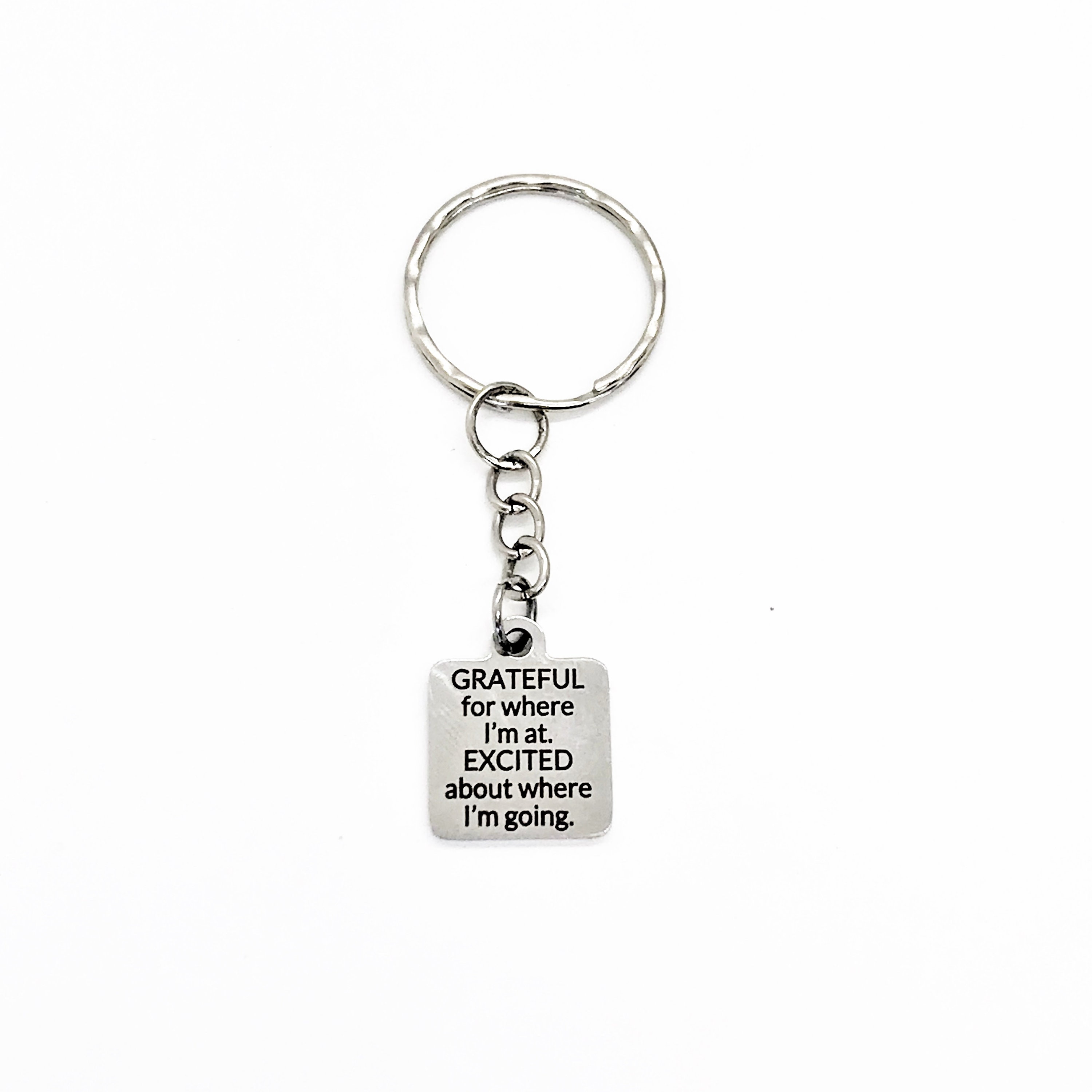 This is a great gift of encouragement! It has a stainless steel laser engraved charm with “GRATEFUL for where I’m at. EXCITED about where I’m going." on it.