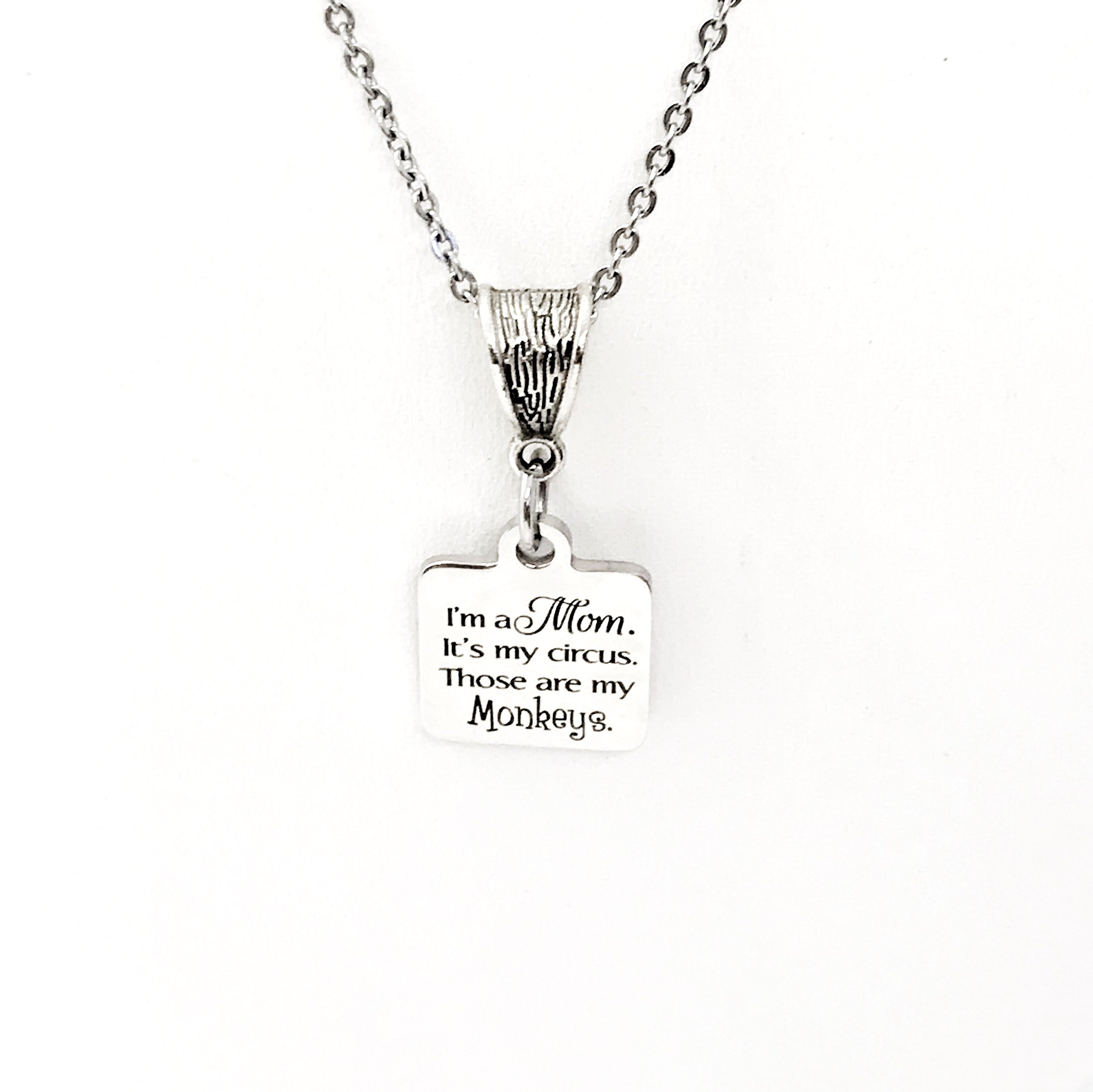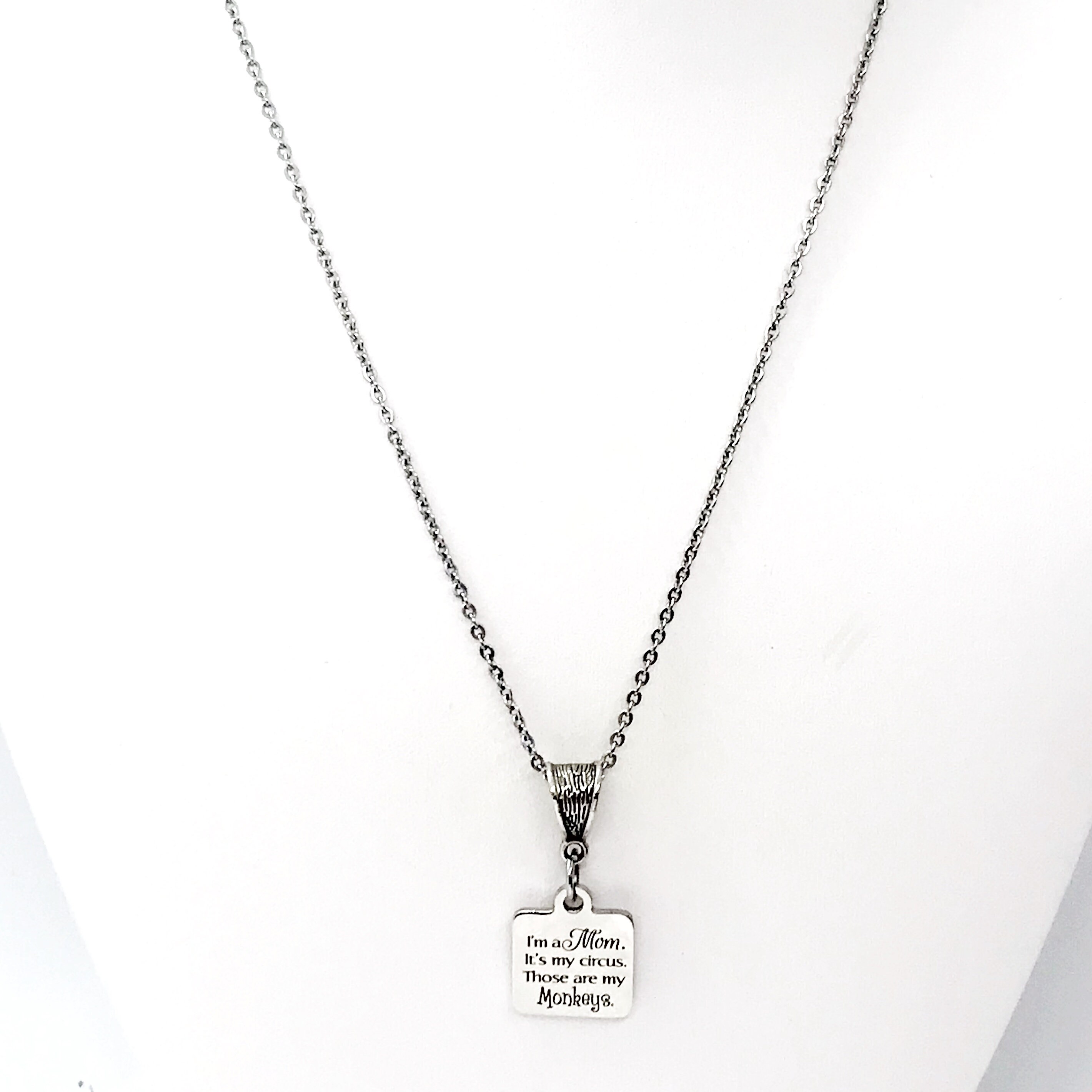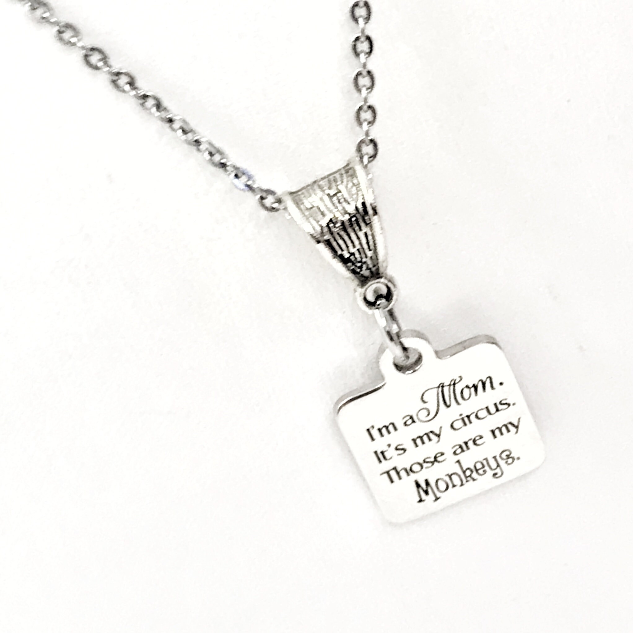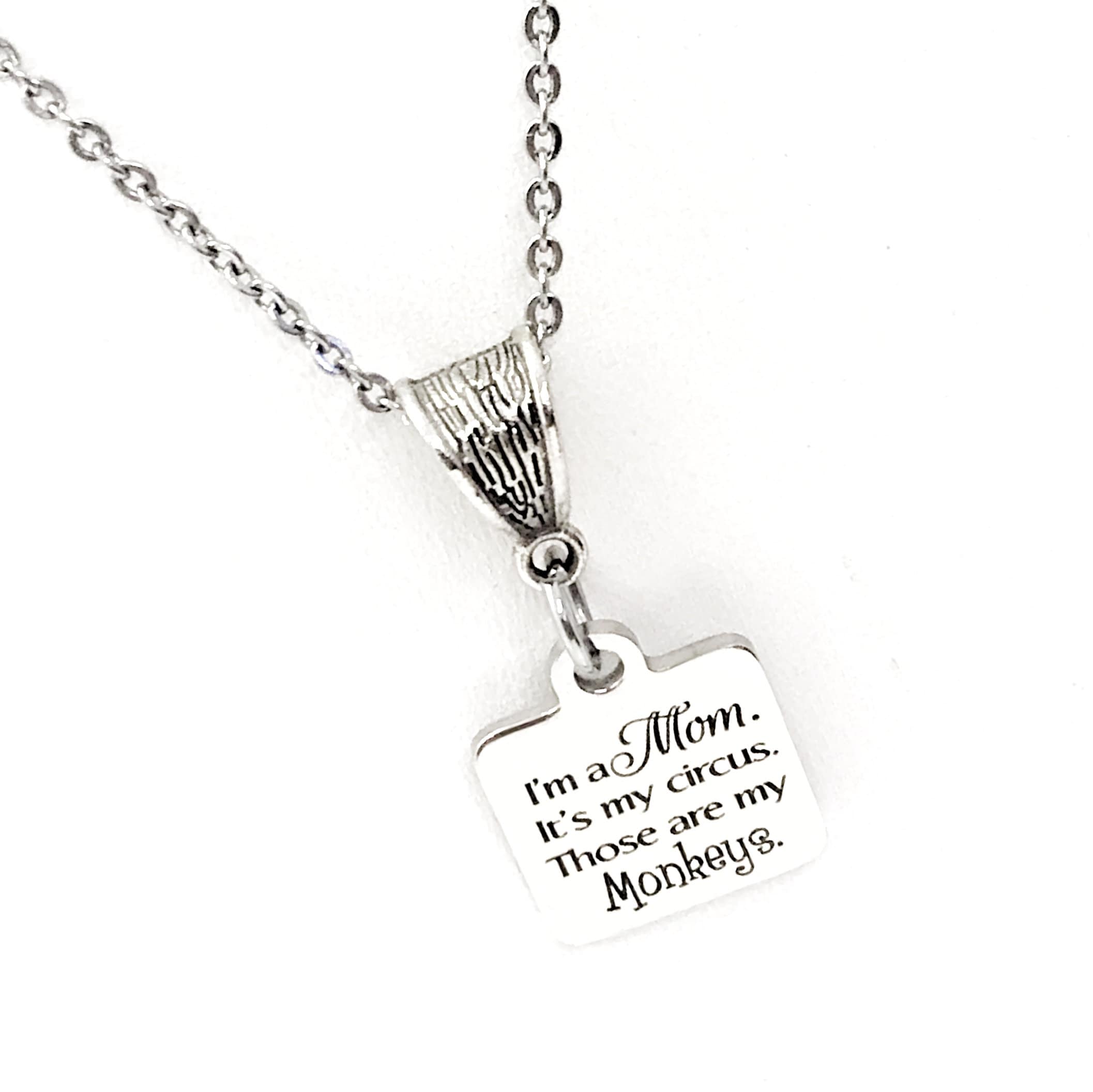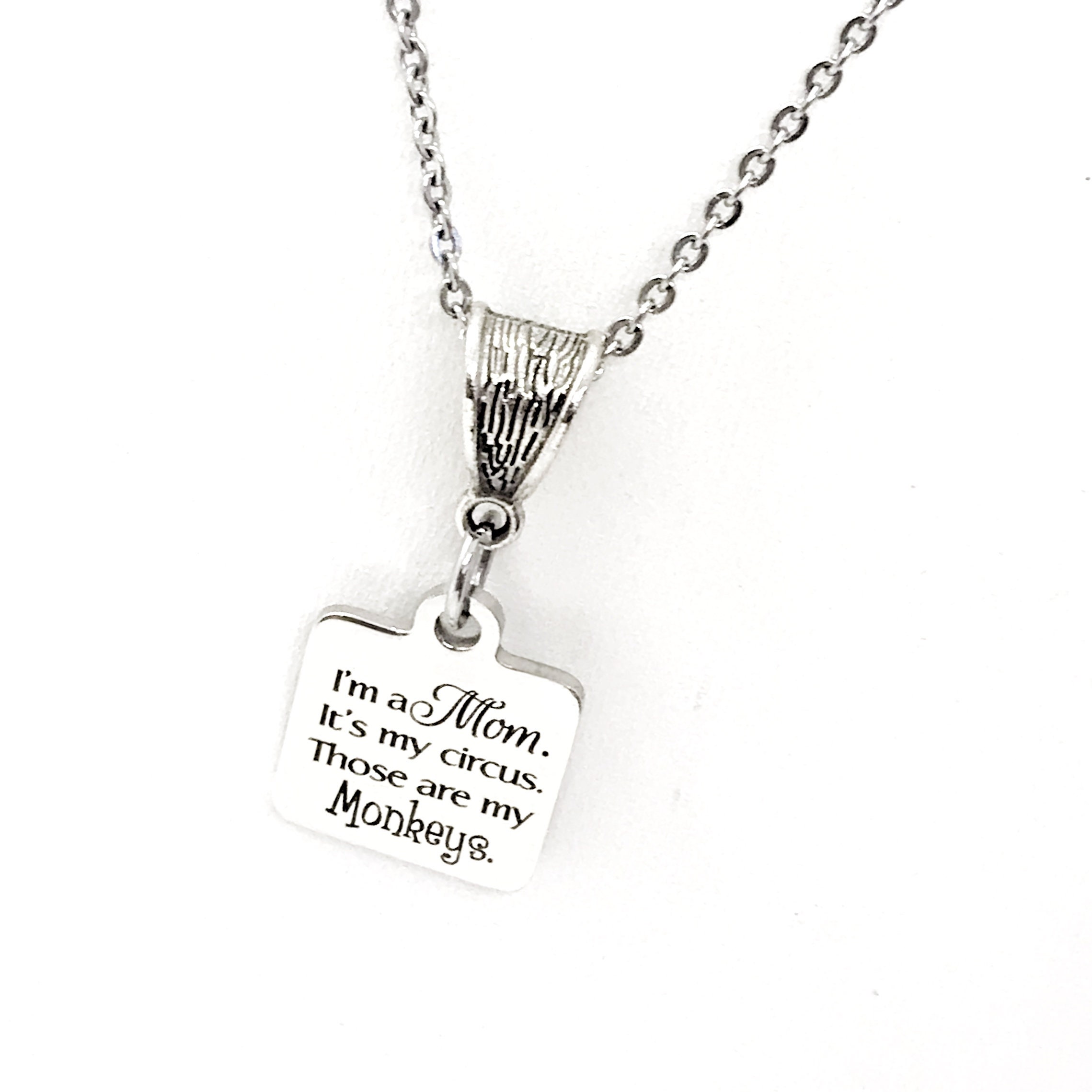 This beautiful necklace would make wonderful gift for a mom. It is a stainless steel laser engraved charm with “I’m a Mom. It’s my circus. Those are my monkeys.” on it with a silver-tone bail on a stainless steel necklace.