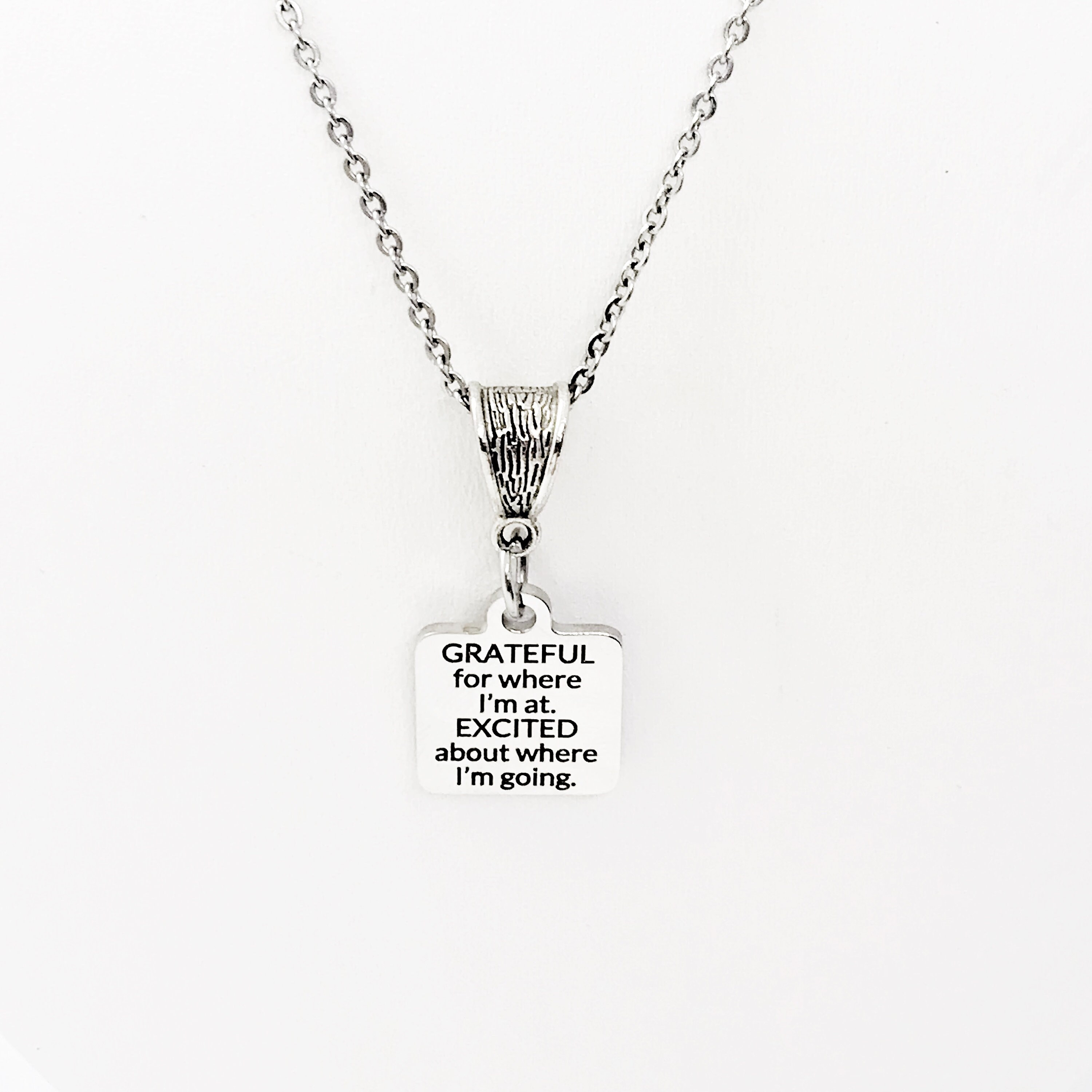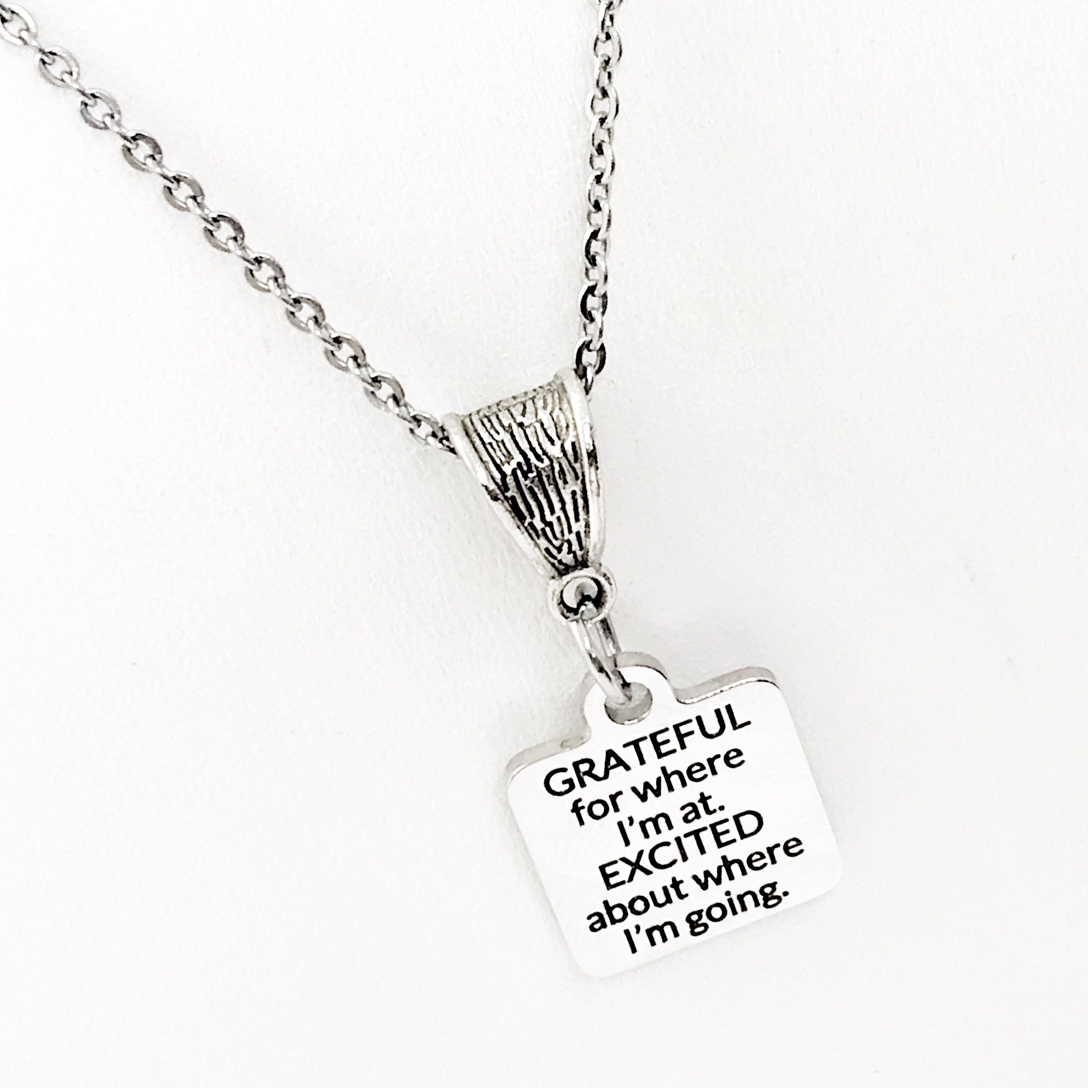 This beautiful necklace would make wonderful gift of encouragement. It is a stainless steel laser engraved charm with “GRATEFUL for where I’m at, EXCITED about where I’m going” on it with a silver-tone bail on a stainless steel necklace.