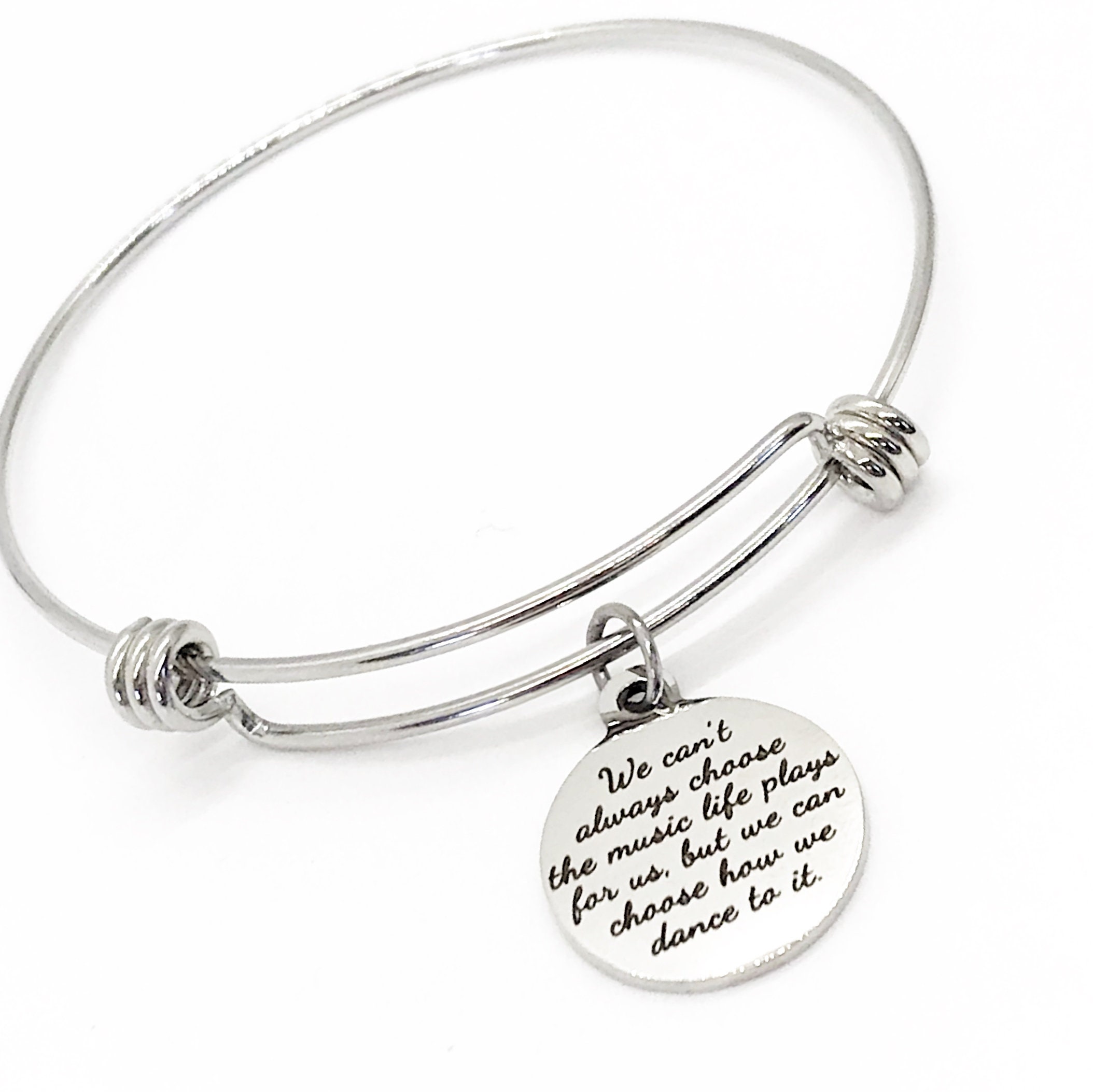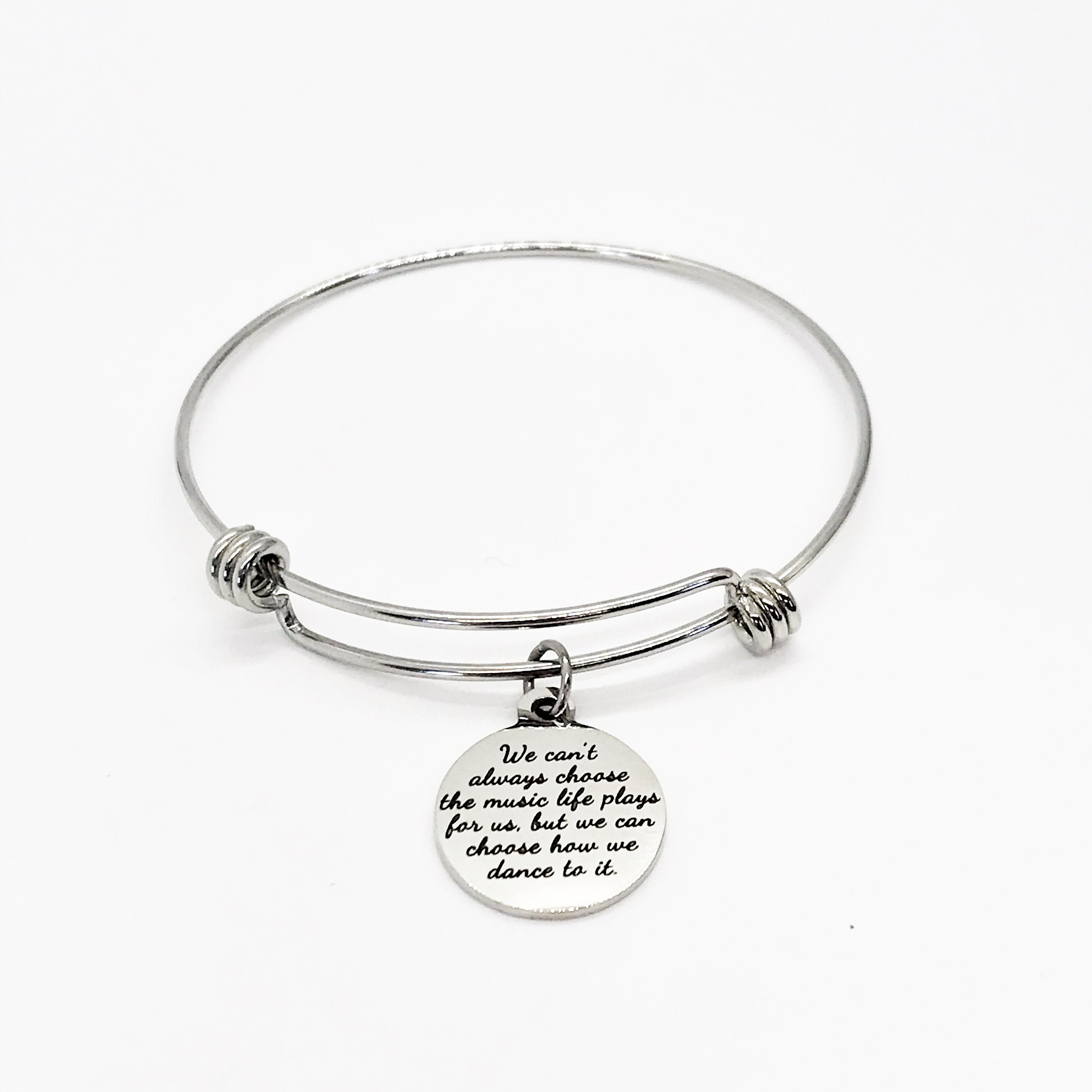 This is a beautiful bangle bracelet with a laser engraved stainless steel charm that has “We can’t always choose the music life plays for us, but we can choose how we dance to it.” on it.