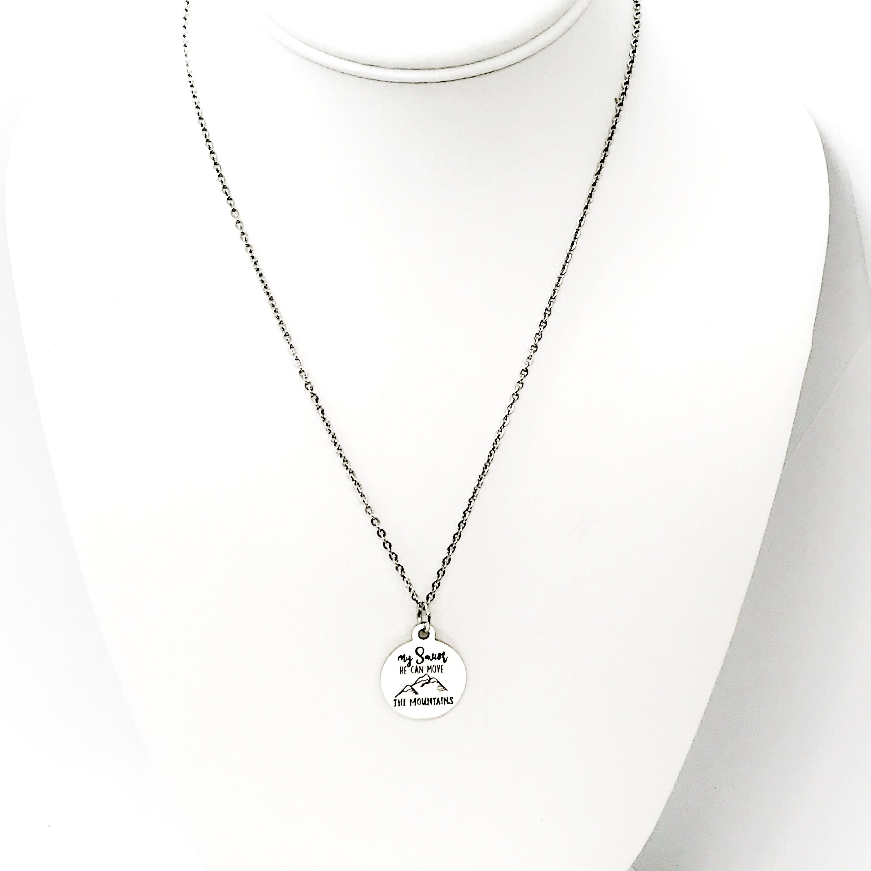 This necklace would be a great jewelry gift to remind the wearer that our Savior is the one that can move the mountains out of our way. The pendant is a stainless steel laser engraved pendant with “My Savior, He can move the mountains” on it.
