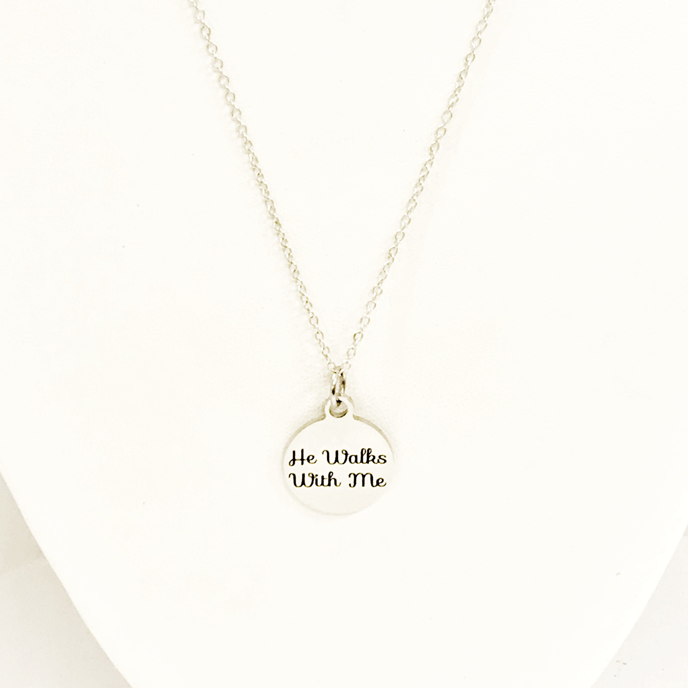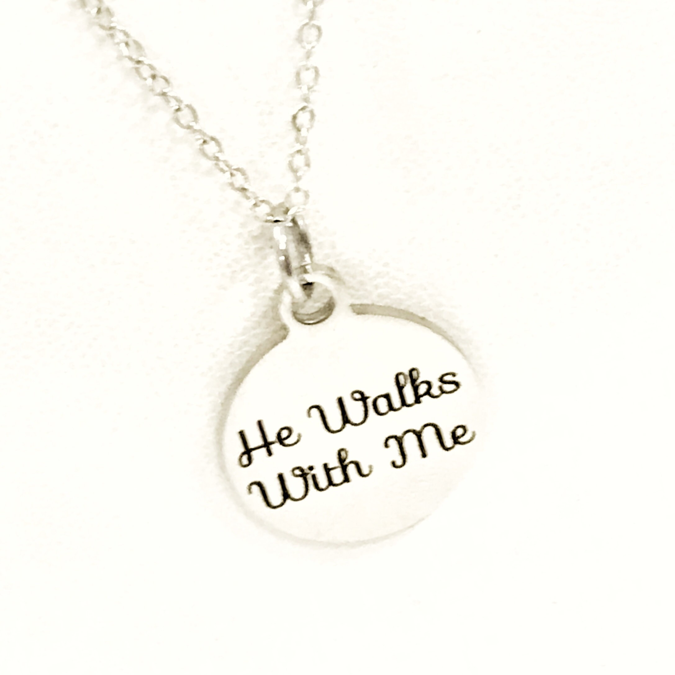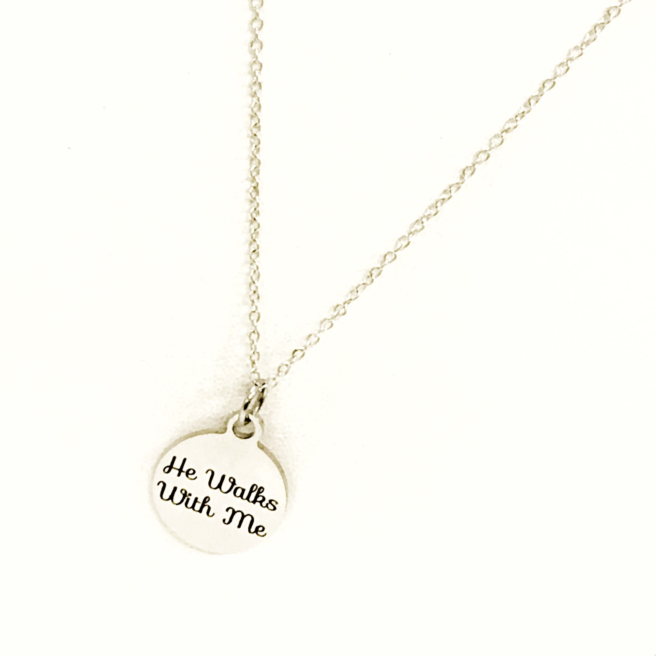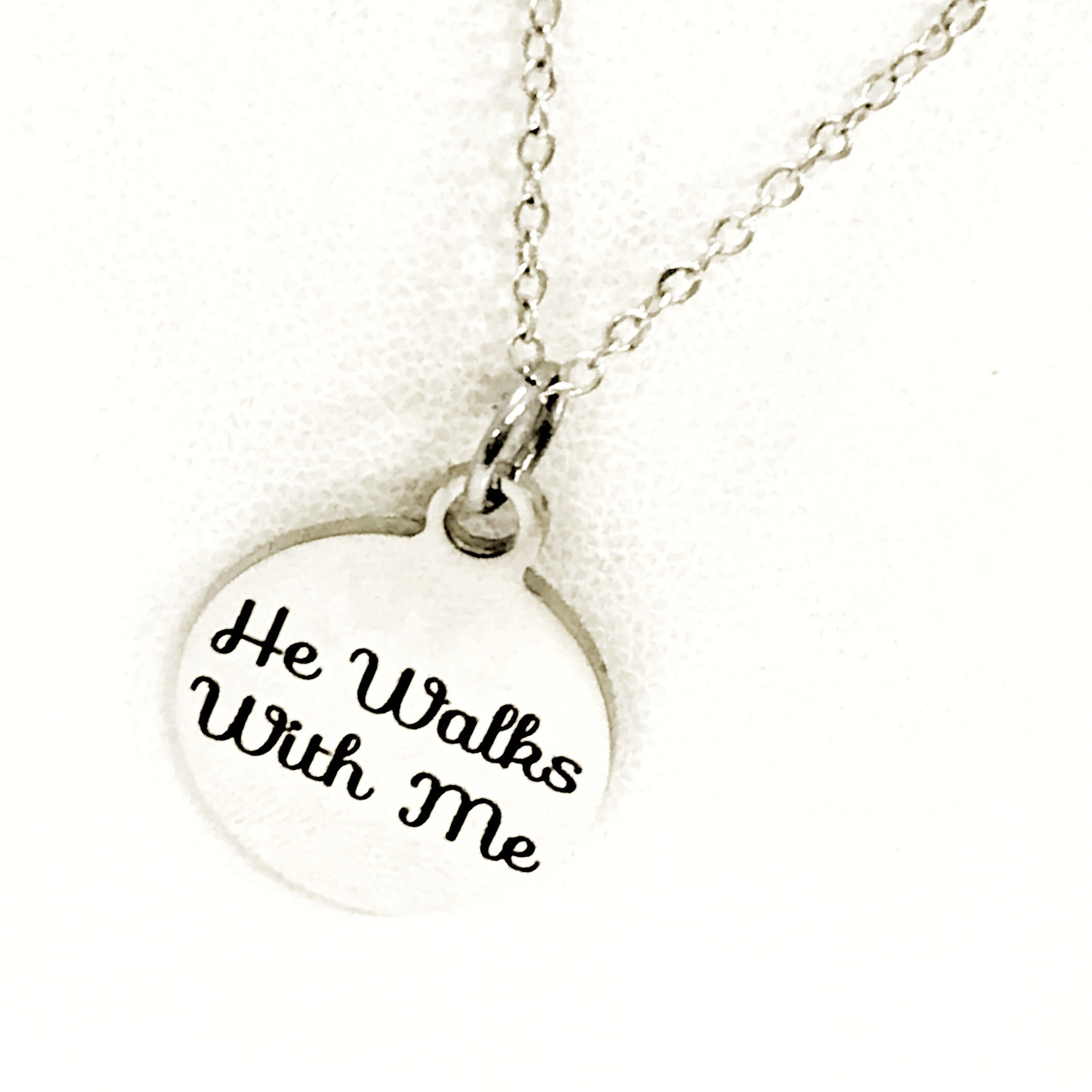 This motivating necklace would make a great gift to remind a Christian woman in your life that God is with her. The pendant is a stainless steel laser engraved pendant with “He Walks With Me” on it.
