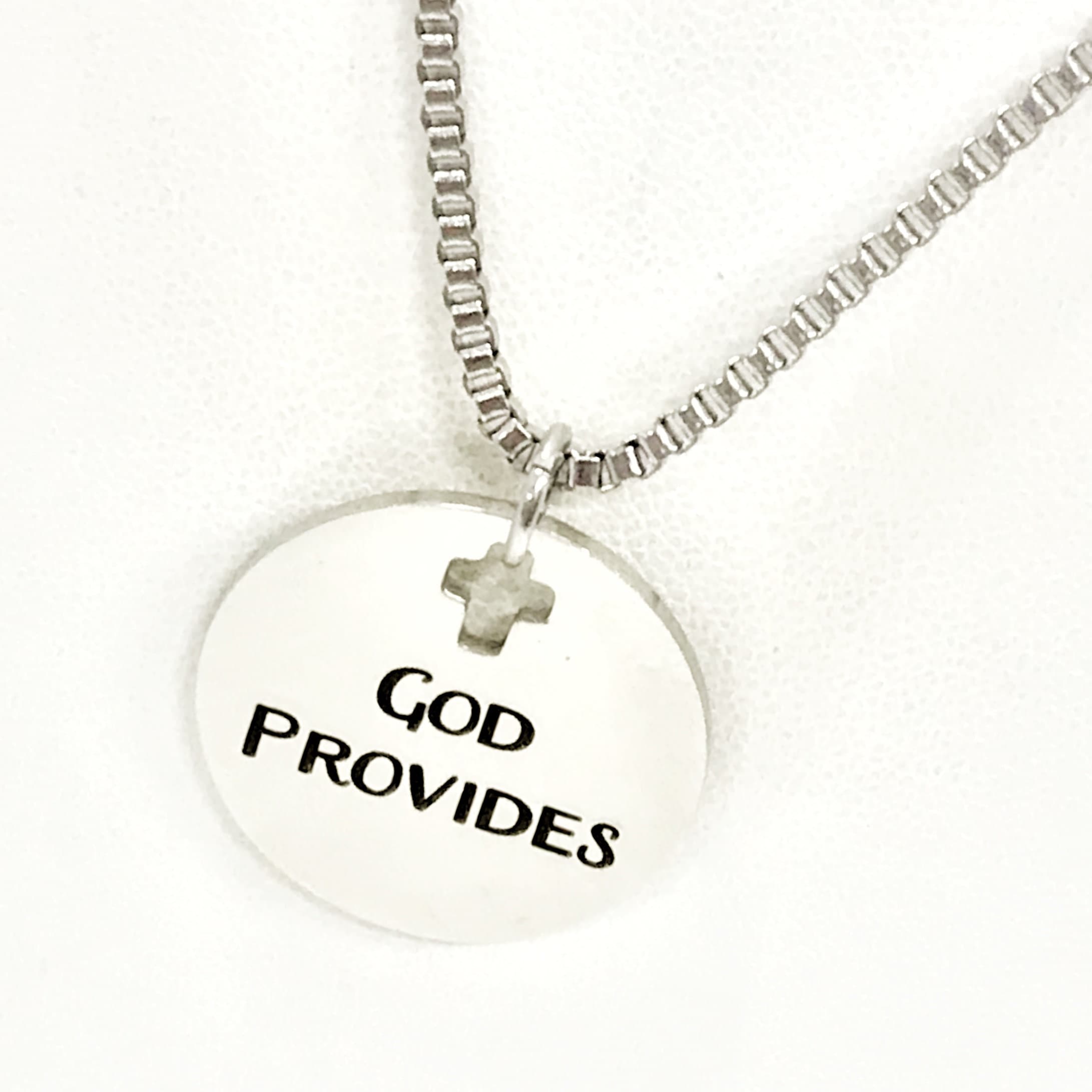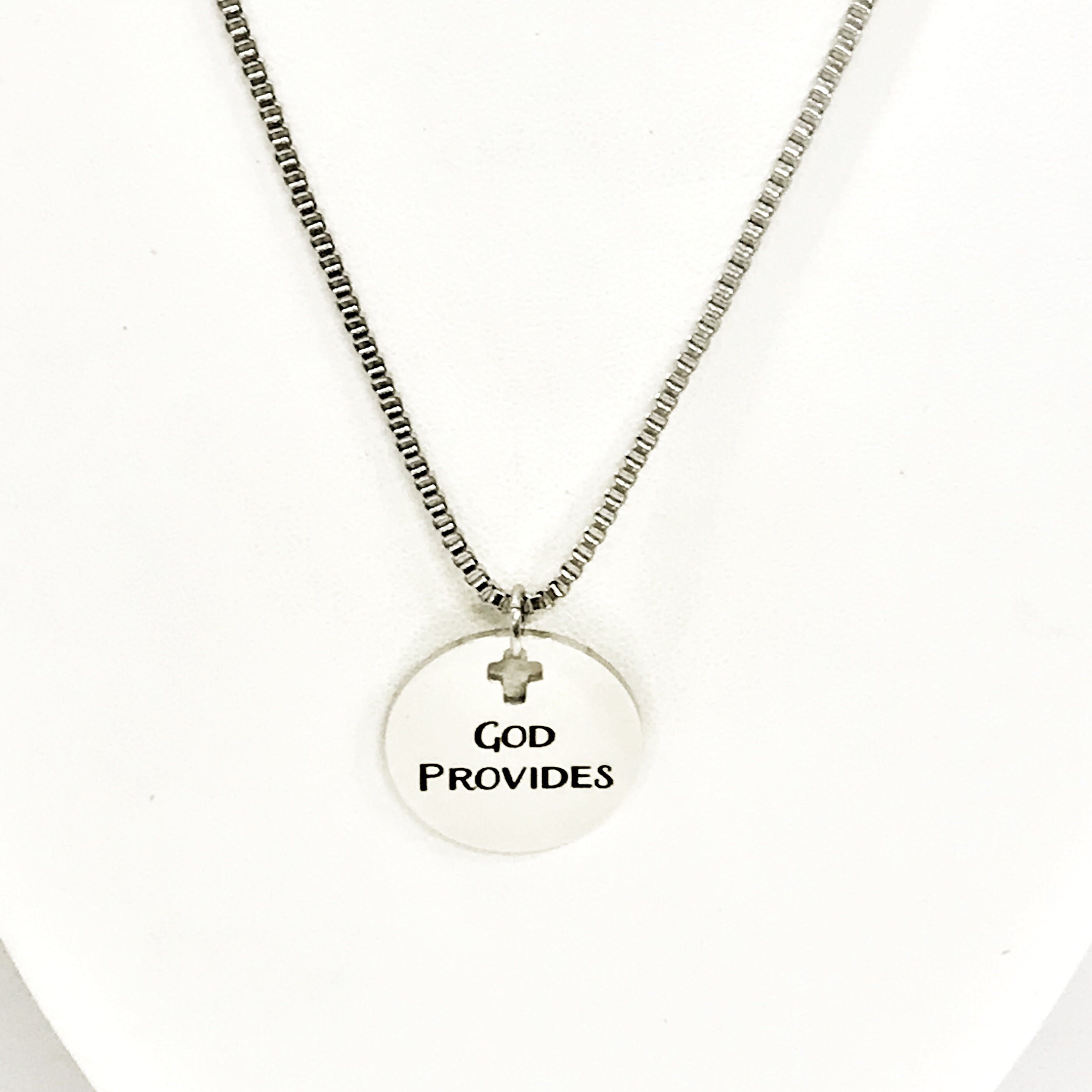This is Christian gift necklace that would work well for men. This necklace comes with a stainless steel laser engraved charm pendant on a 22 inch stainless steel box chain. The pendant is also available for individual purchase if you have another chain on which you would like to wear it. The pendant has "God Provides" on it.