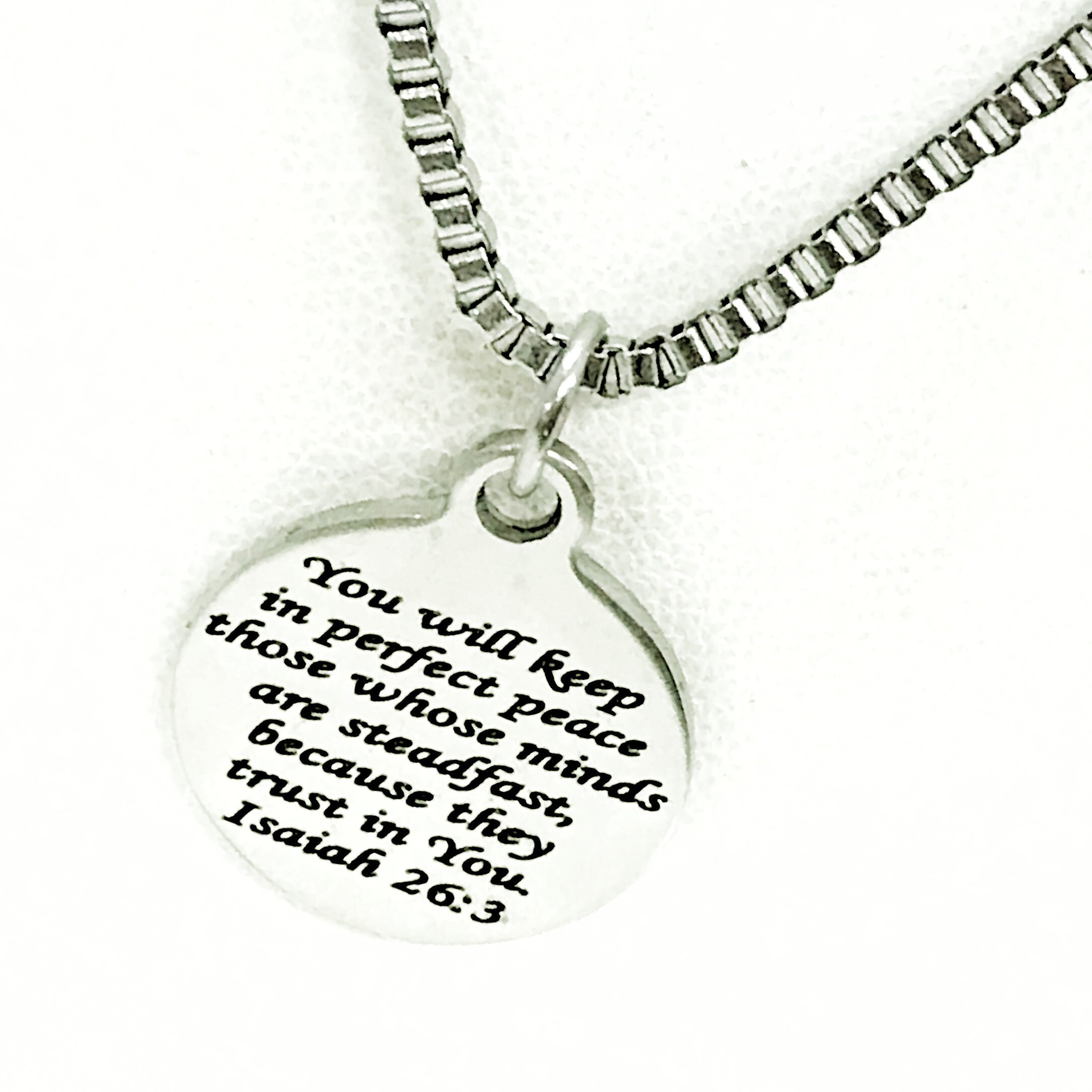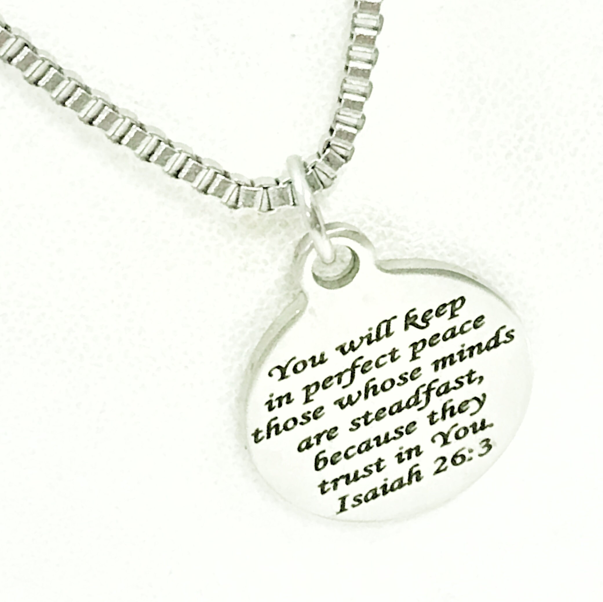 This is Christian gift necklace that would work well for men. This necklace comes with a stainless steel laser engraved charm pendant on a 22 inch stainless steel box chain. The pendant is also available for individual purchase if you have another chain on which you would like to wear it. The pendant has "You will keep in perfect peace those whose minds are steadfast because they trust in you" from Isaiah 26:3 on it.