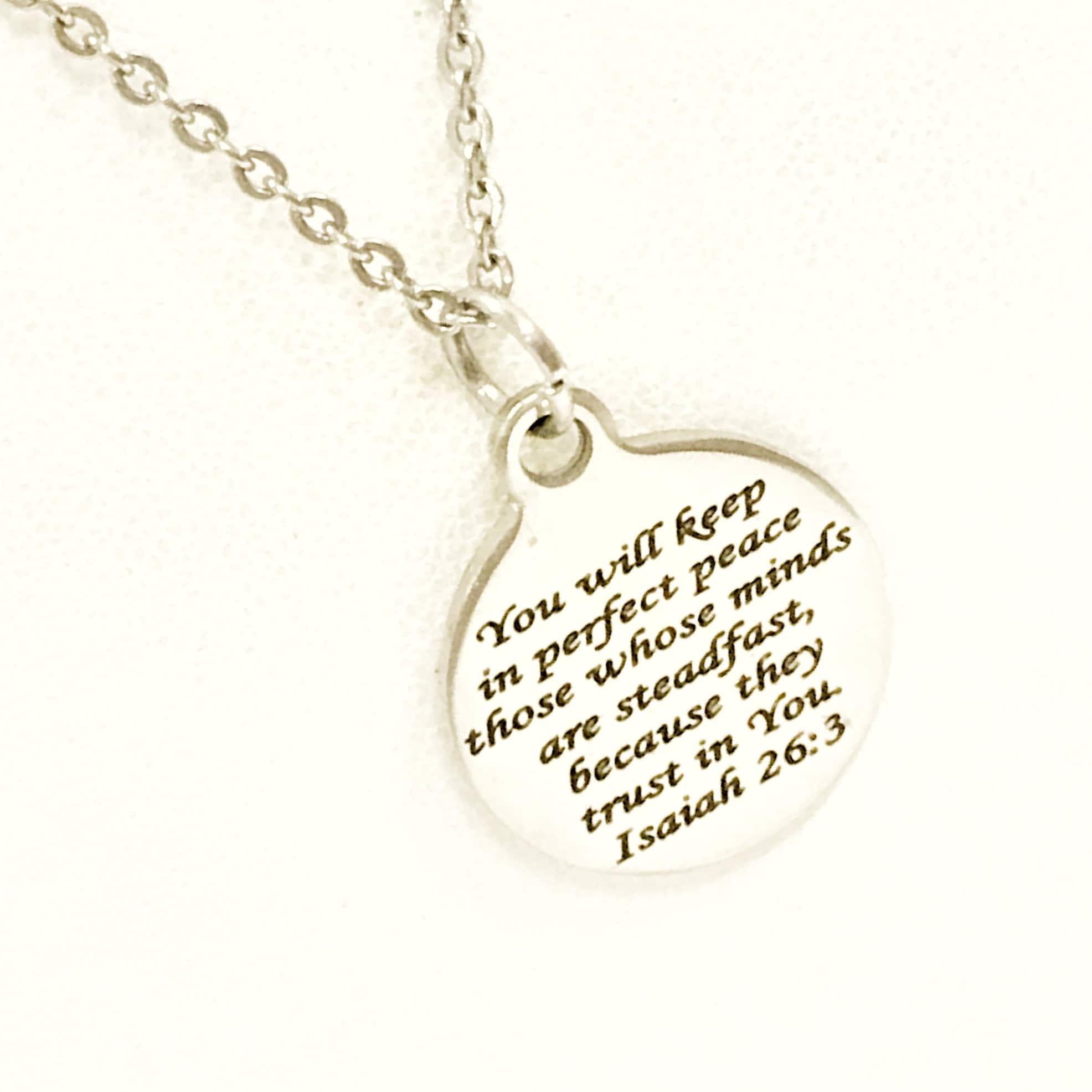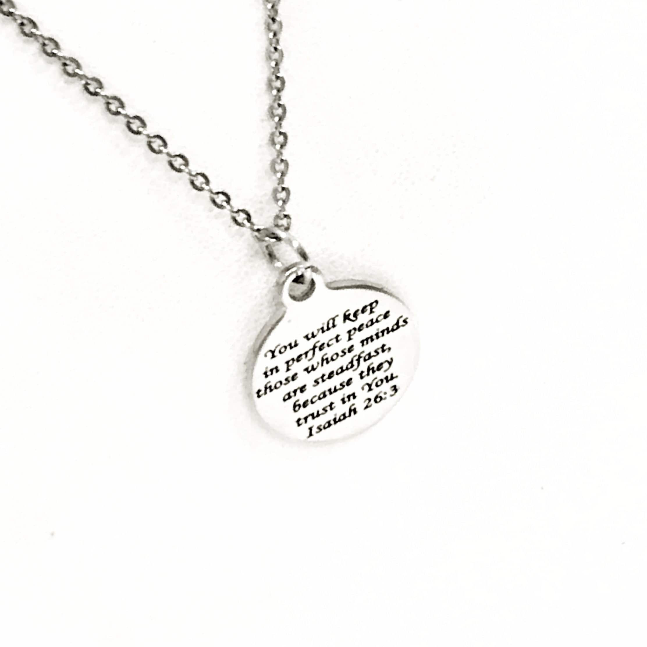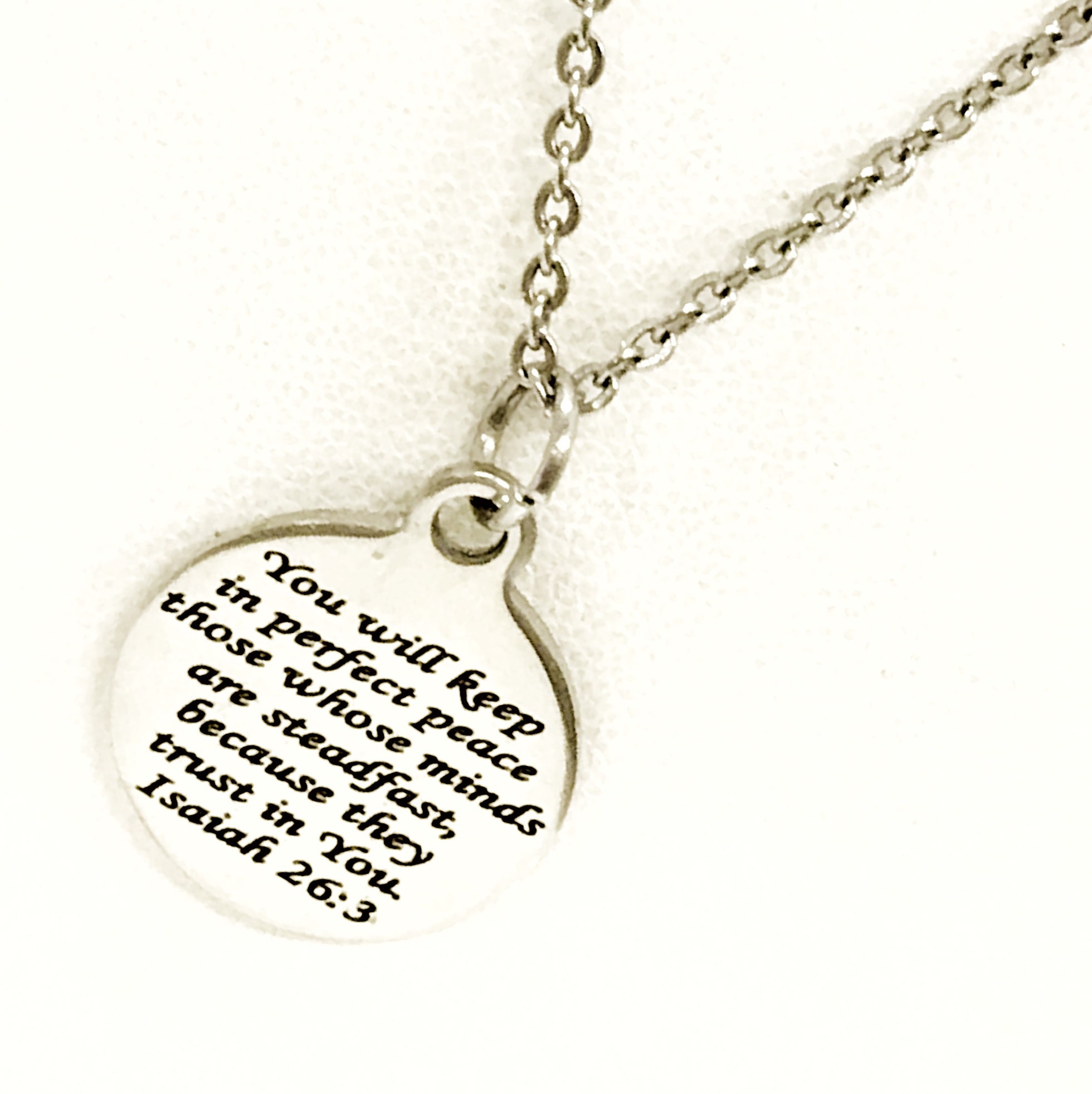 This motivating necklace would make a great gift to remind a Christian woman in your life that God provides our every need. The pendant is a stainless steel laser engraved pendant with “You will keep in perfect peace those whose minds are steadfast because they trust in you” from Isaiah 26:3 on it.