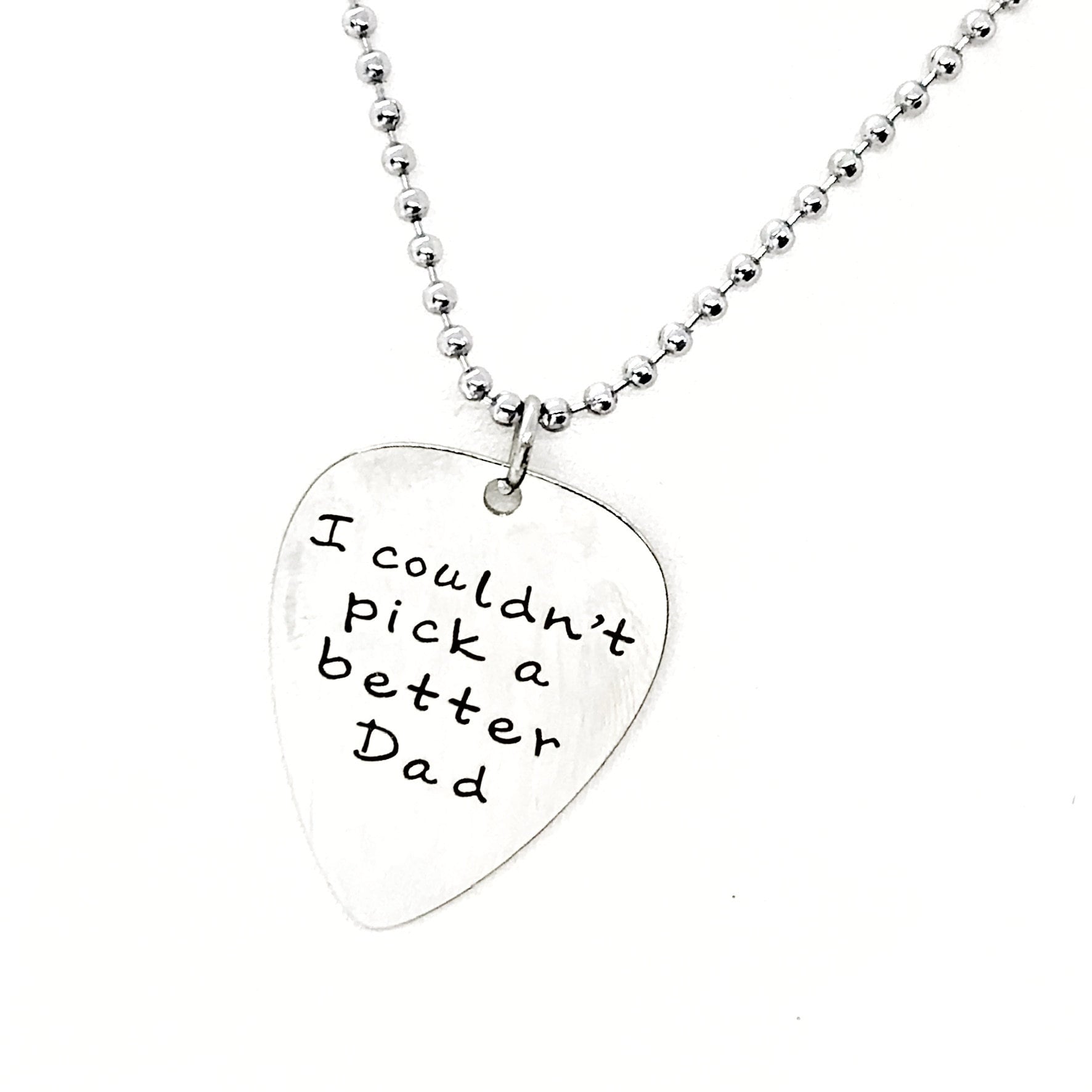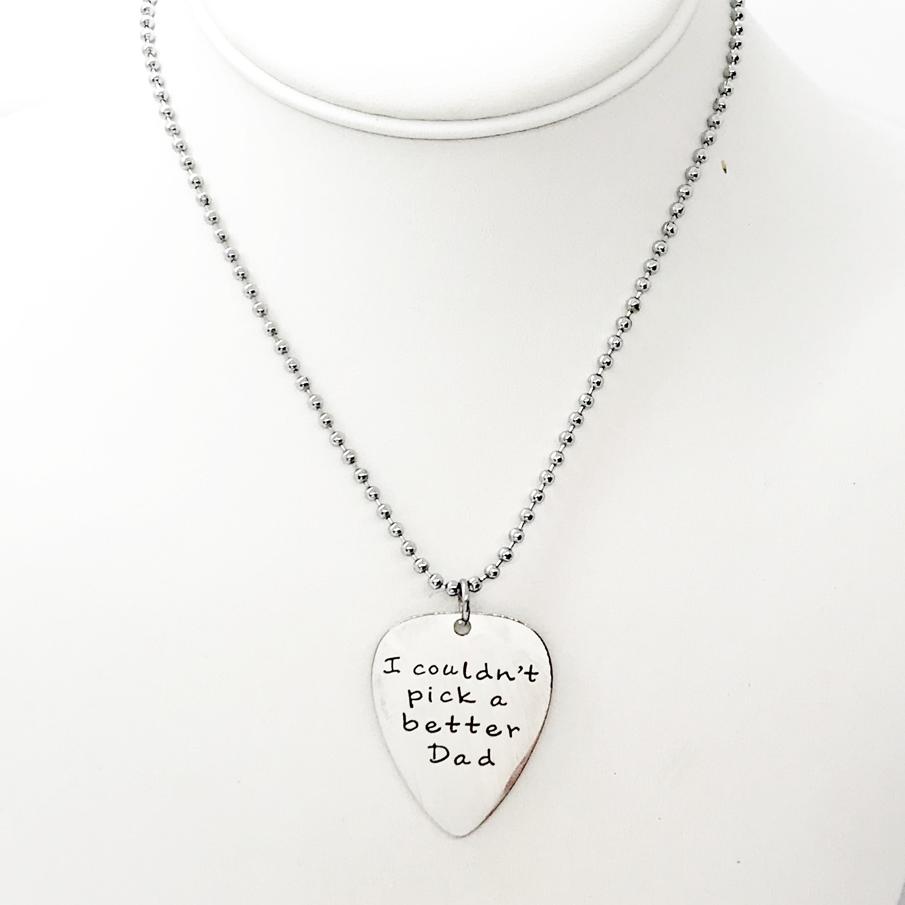 The pendant is a stainless steel laser engraved charm on a 24 inch ball chain. It would make a wonderful gift for Dad. The charm has the following on it: I couldn't pick a better dad