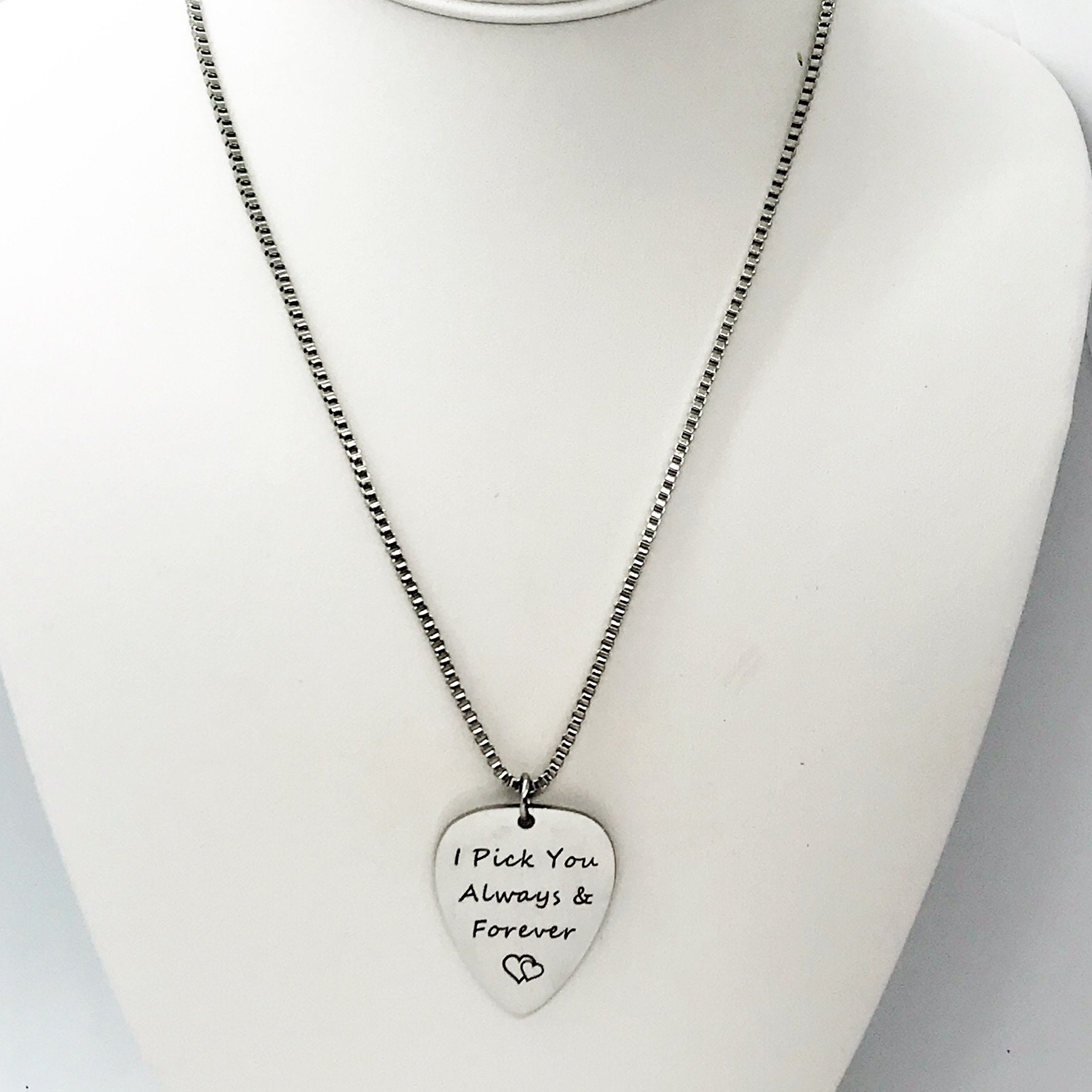 This is gift necklace that would work well for men or women. This necklace comes with a engraved guitar pick charm pendant on a 22 inch stainless steel box chain. The pendant is also available for individual purchase if you have another chain on which you would like to wear it. The pendant has “I pick you always & forever" on it.