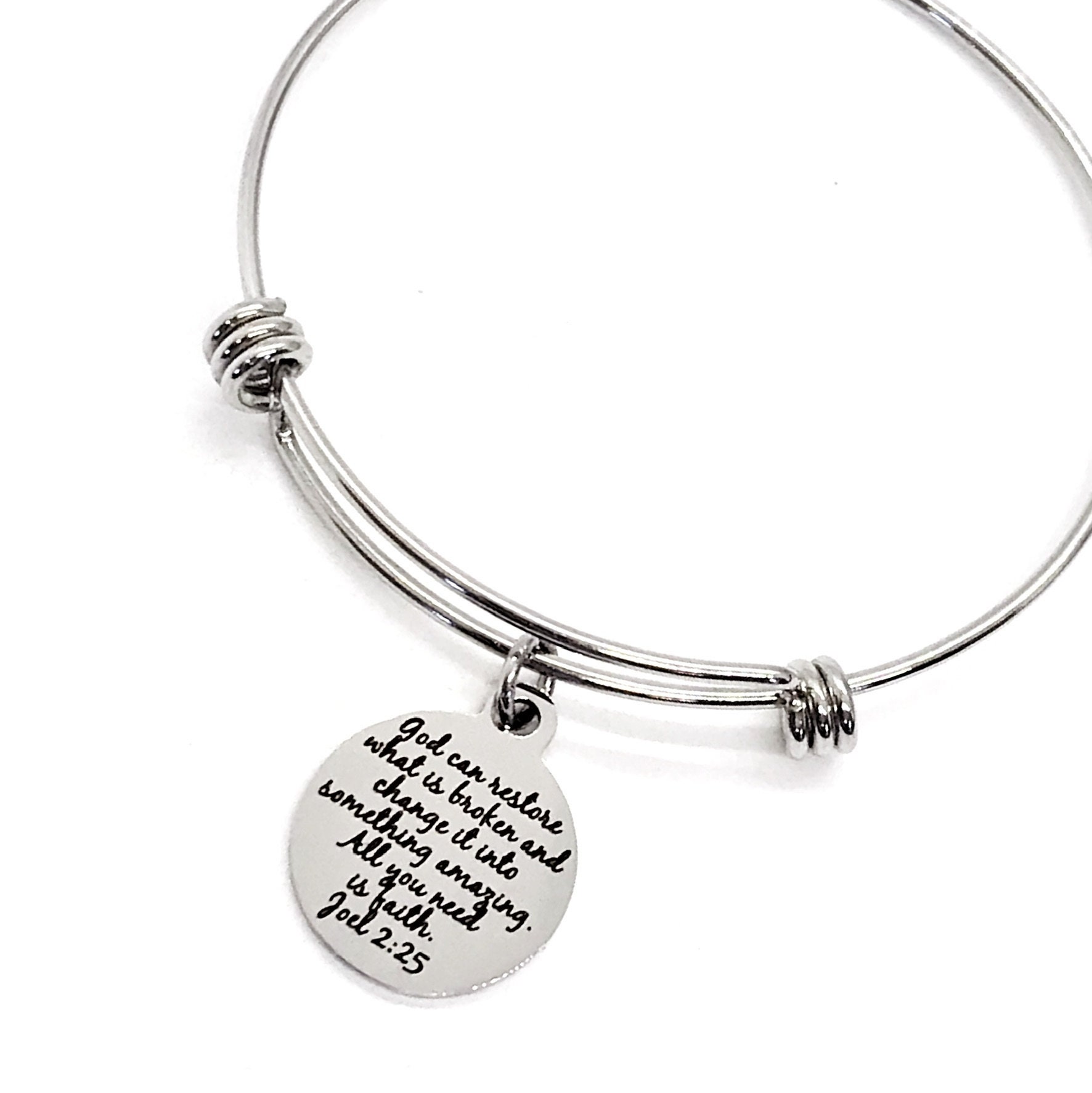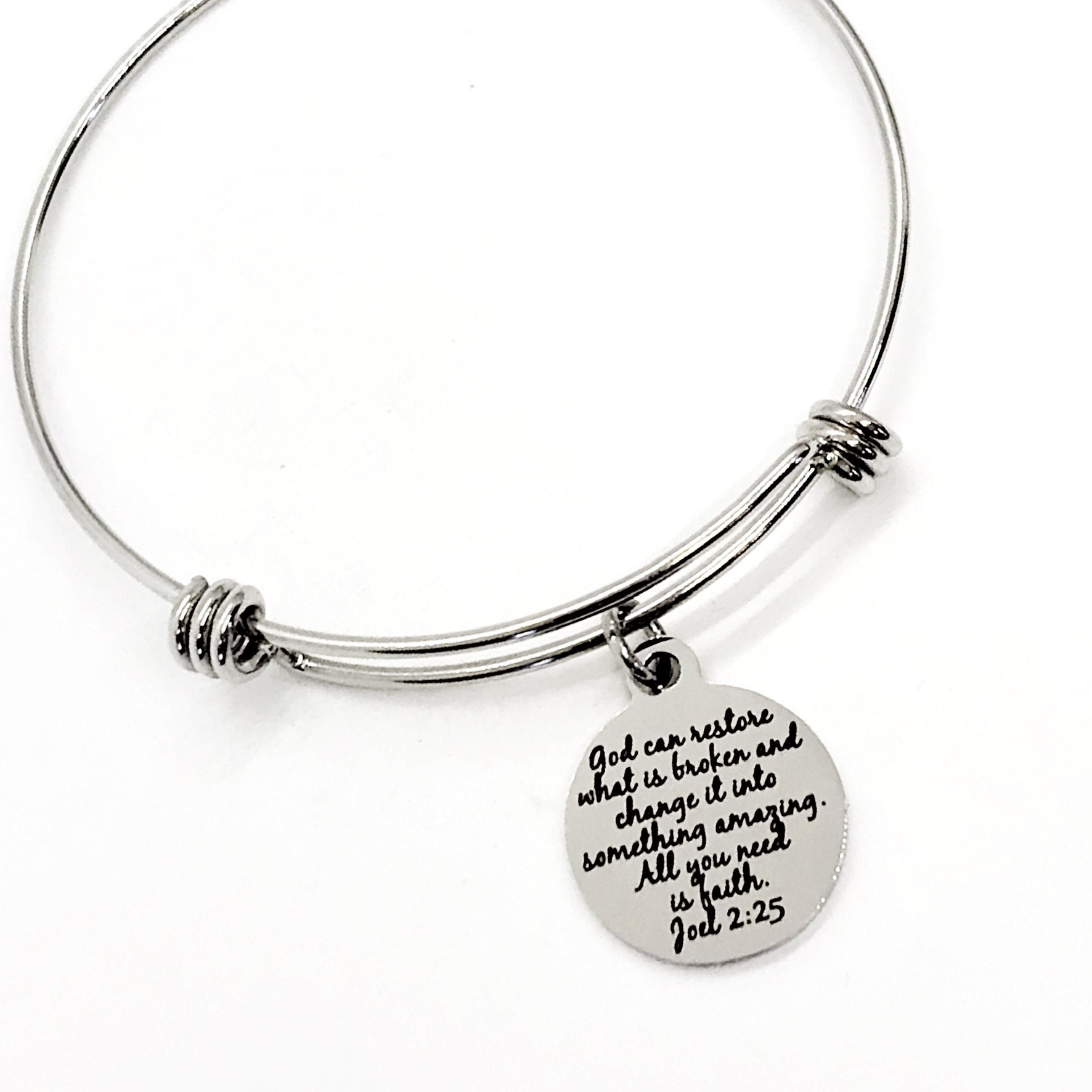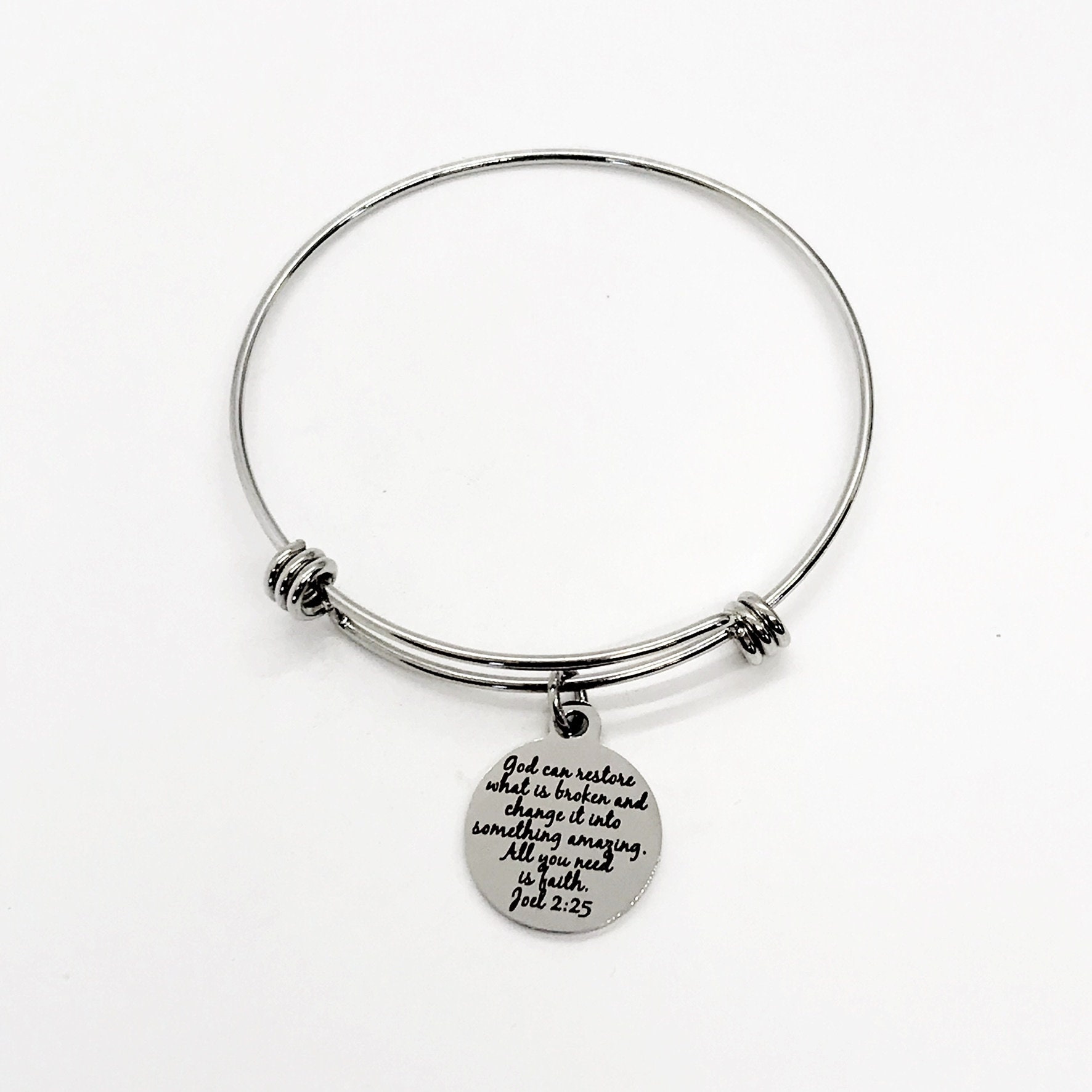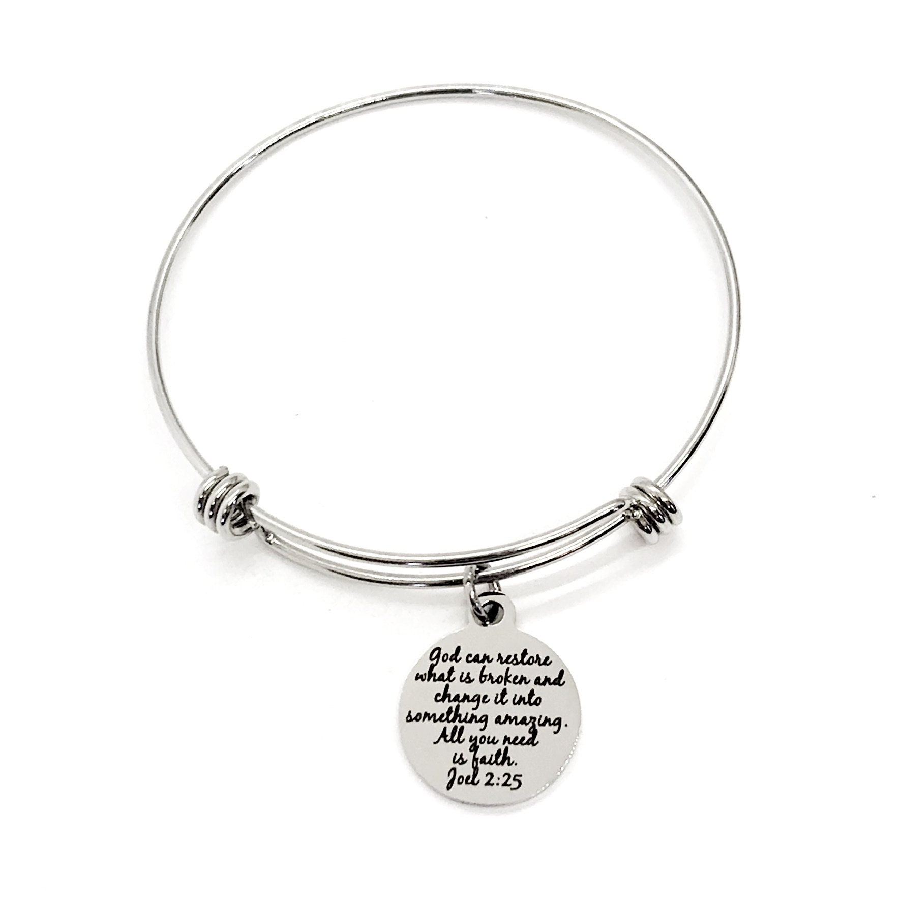 This is a beautiful bangle bracelet with a laser engraved stainless steel charm that has “God can restore what is broken and change it into something amazing. All you need is faith. ” to remind us of what Joel 2:25 says on it.