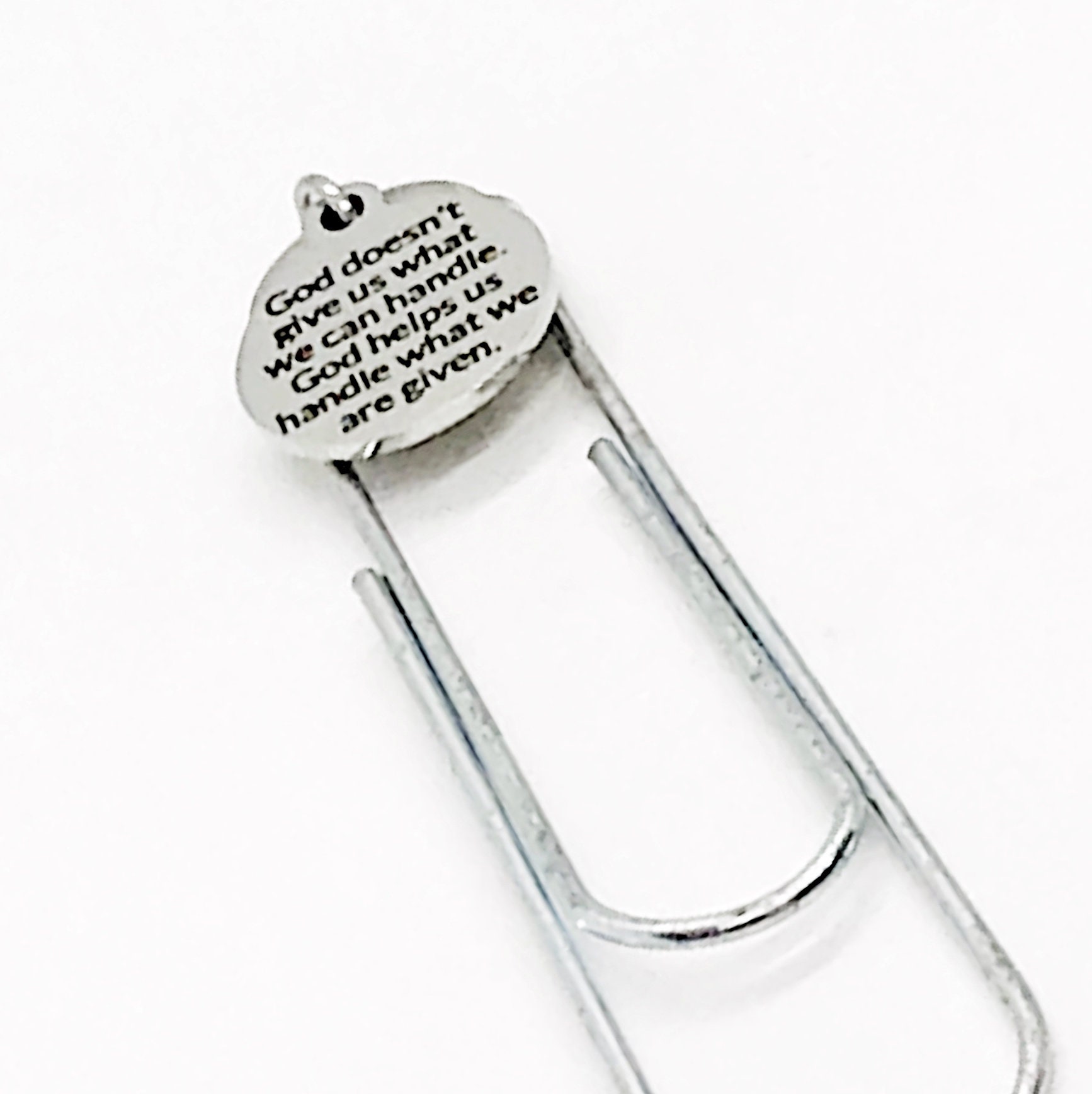 This bookmark has a stainless steel laser engraved charm that says “God doesn’t give us what we can handle. God helps us handle what we are given.”.