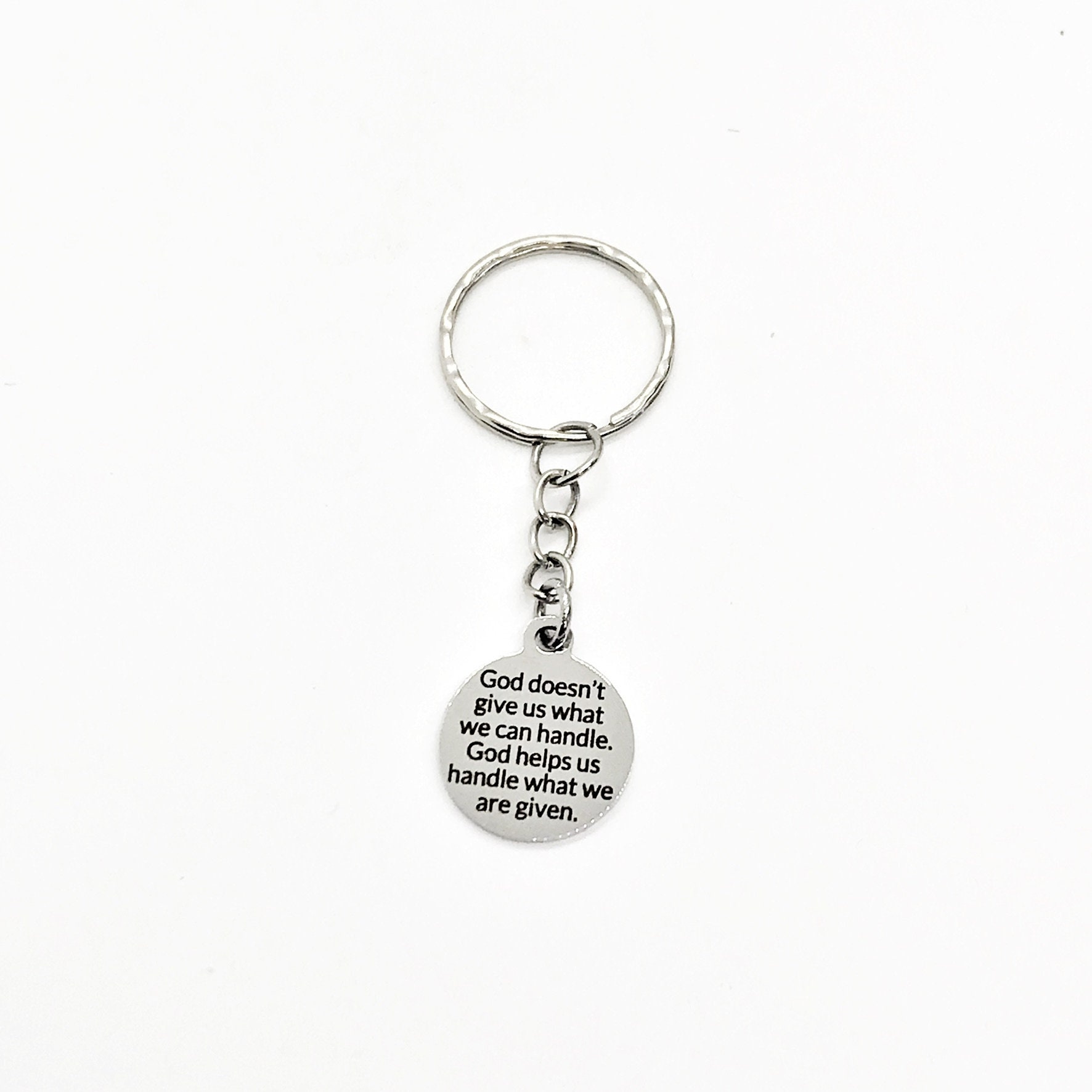 This is a great Christian keychain gift! It has a stainless steel laser engraved charm with “God doesn’t give us what we can handle. God helps us handle what we are given." on it. The charm measures approx. 3/4” across.