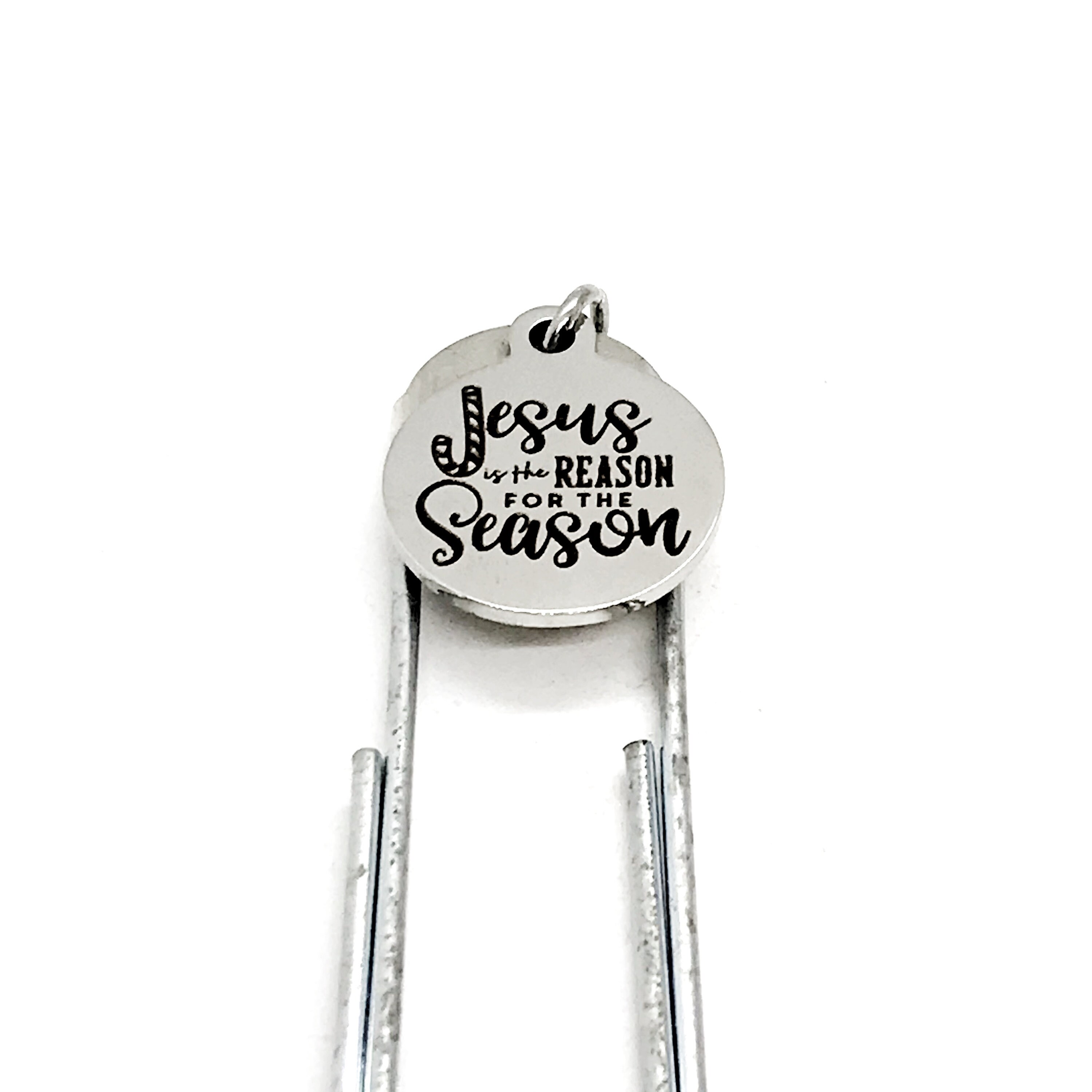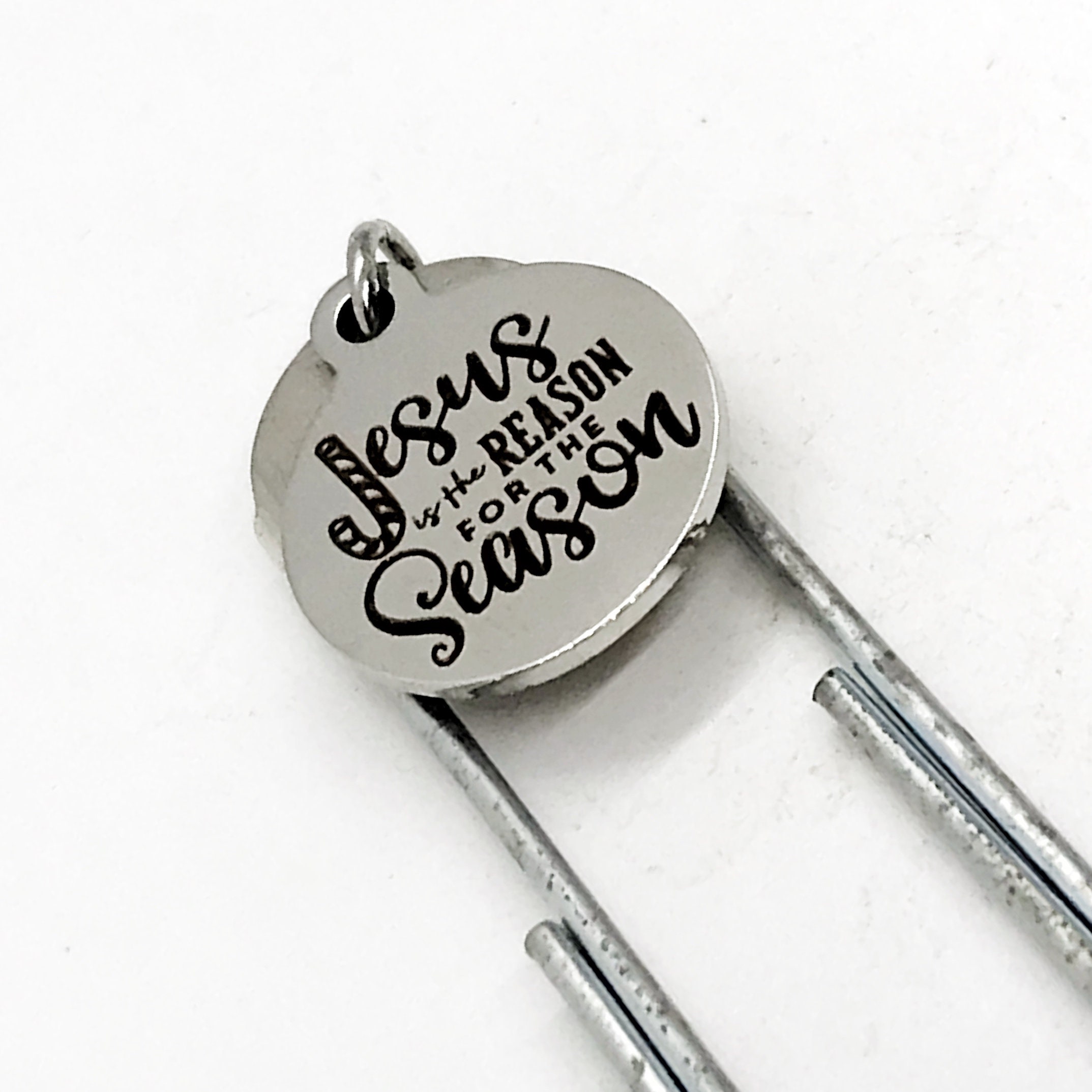 This bookmark has a stainless steel laser engraved charm with "Jesus is the reasons for the season" on it. It can be used as a bookmark, page marker, or planner book mark.