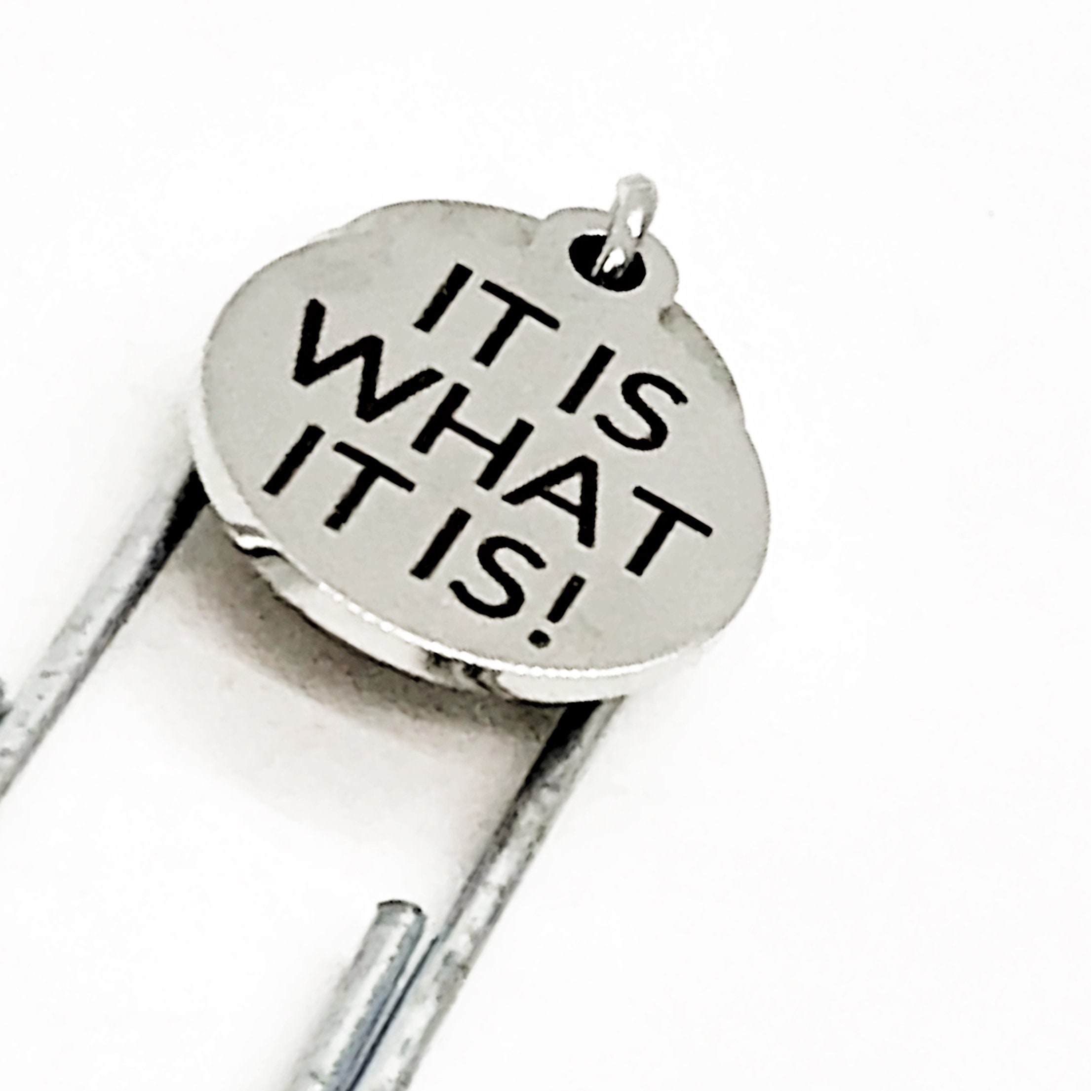 This bookmark has a stainless steel laser engraved charm with "It is what it is!” on it. It can be used as a bookmark, page marker, or planner book mark.