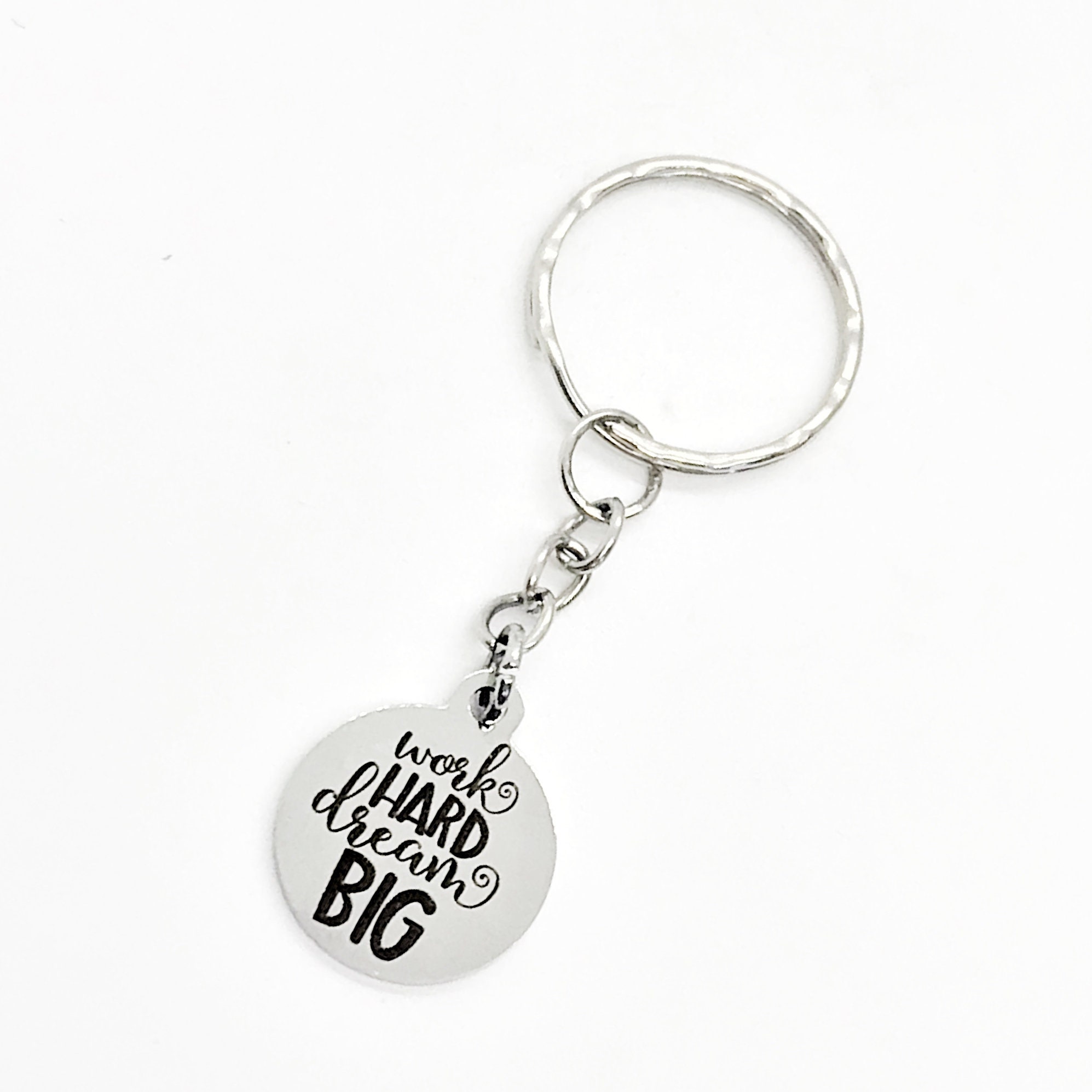 This is a wonderful motivational keychain gift! It has a stainless steel laser engraved charm with “Work hard Dream big" on it.