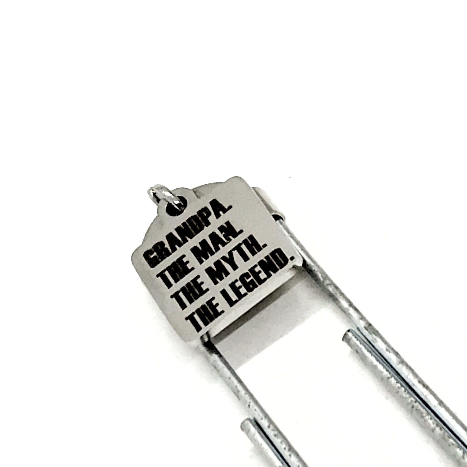 This bookmark has a stainless steel laser engraved charm with "Grandpa. The Man. The Myth. The Legend.” on it. It can be used as a bookmark, page marker, or planner book mark. It would be a great way to celebrate your Grandpa, or to announce to your dad that he is going to be a Grandpa!