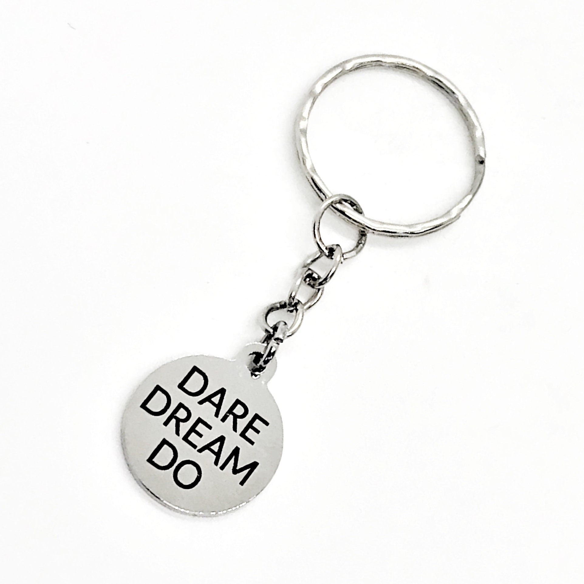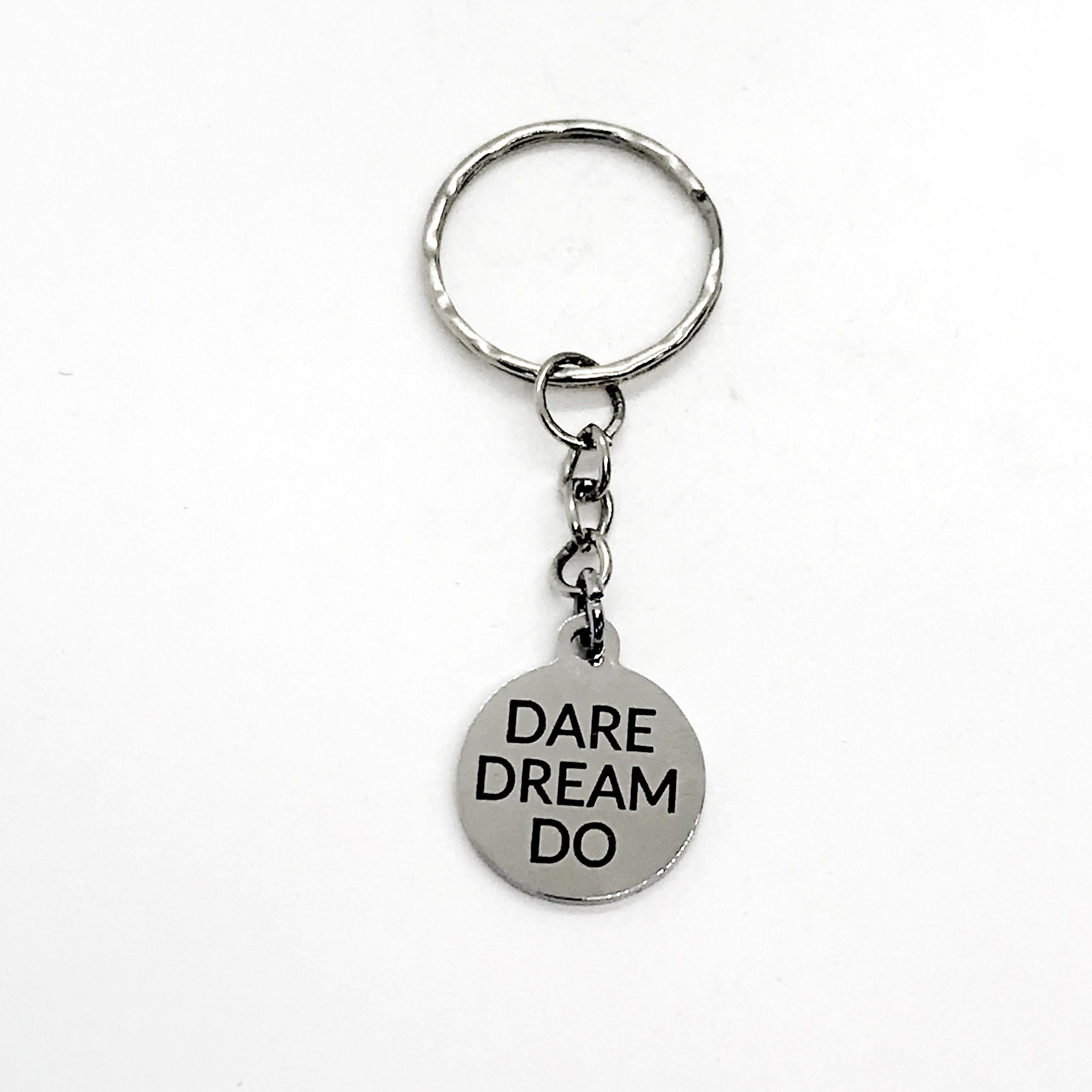 This is a wonderful motivational keychain gift! It has a stainless steel laser engraved charm with “Dare Dream Do" on it.