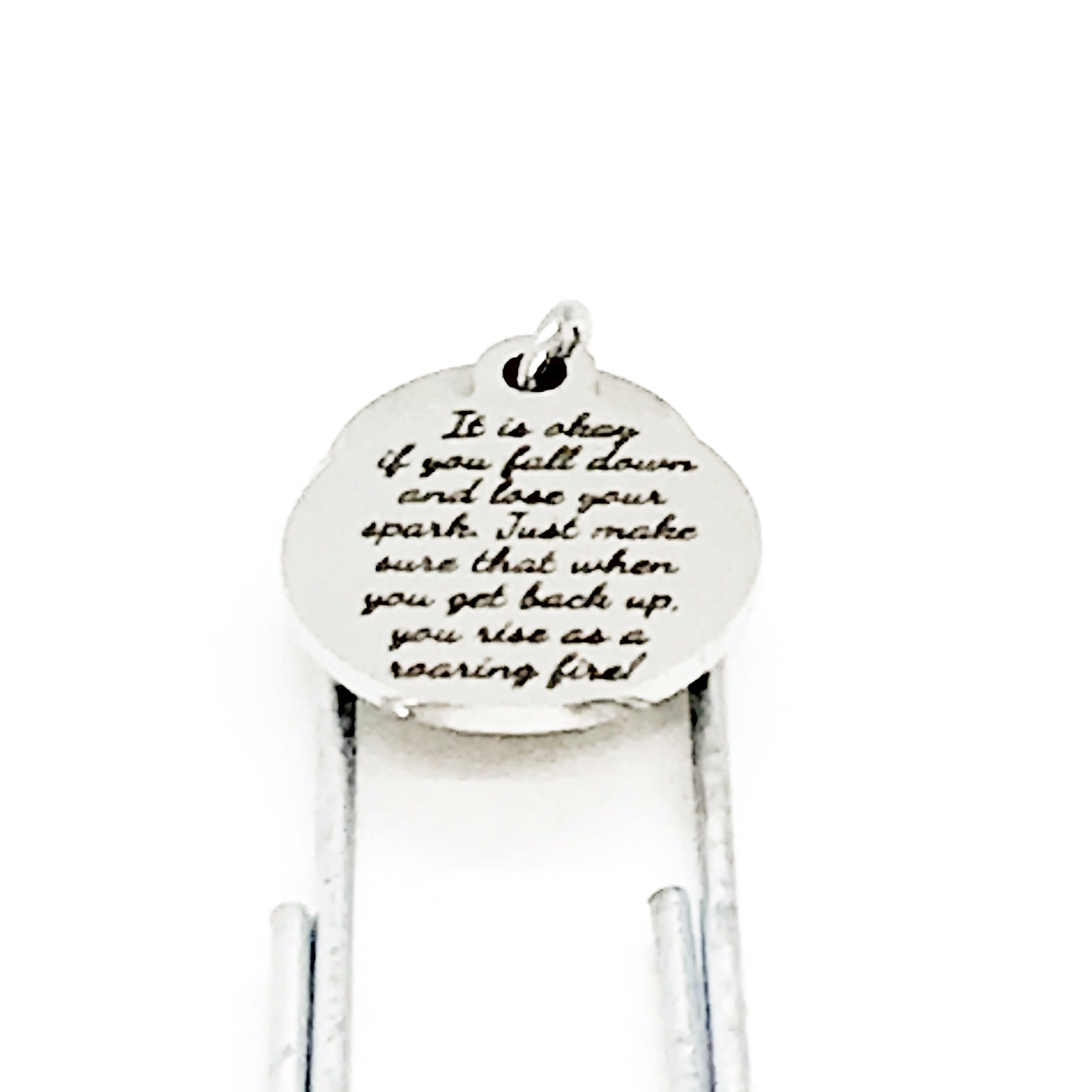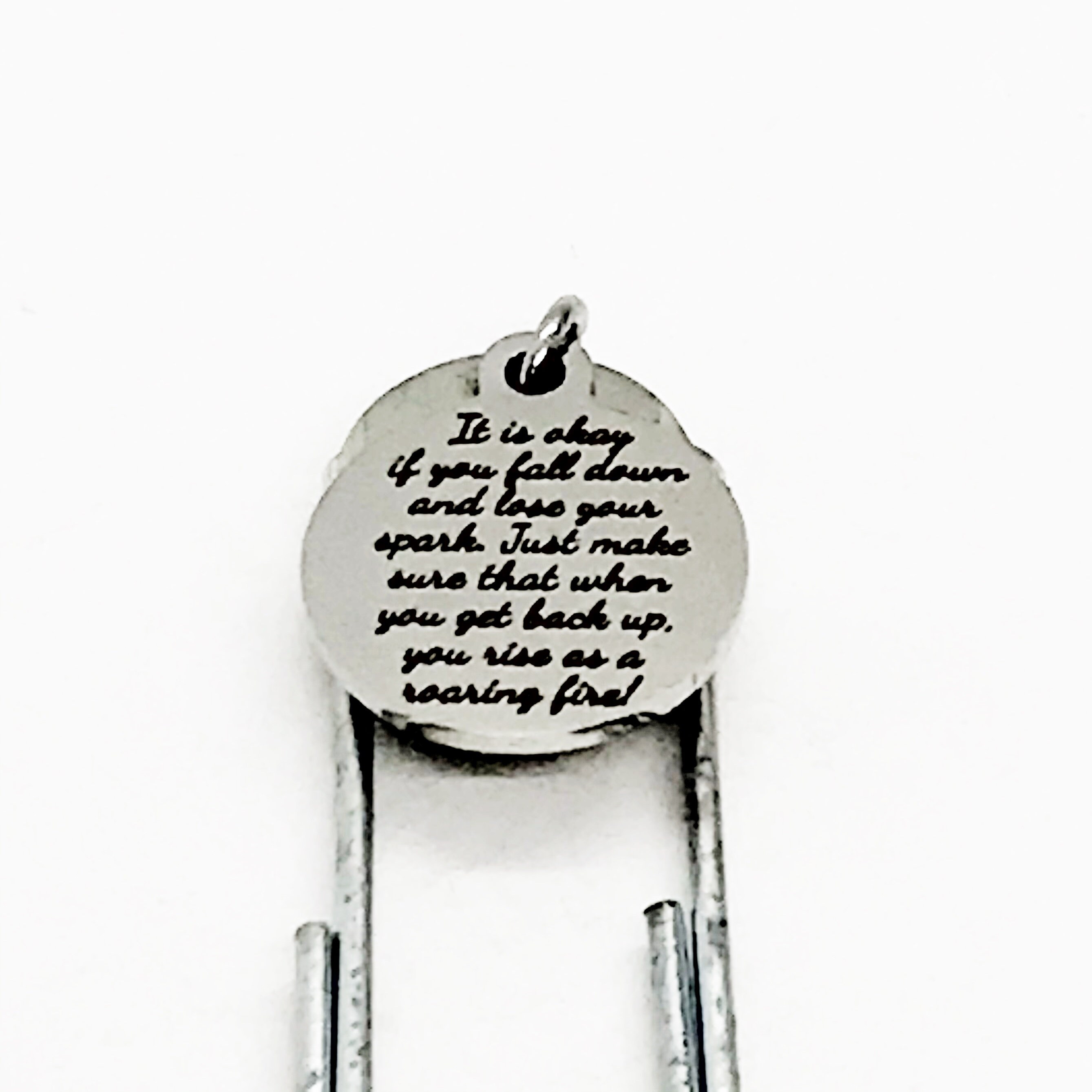 This bookmark has a stainless steel laser engraved charm with “It is okay if you fall down and lose your spark. Just make sure that when you get back. Up, you rise as a roaring fire!” on it. It can be used as a bookmark, page marker, or planner book mark.