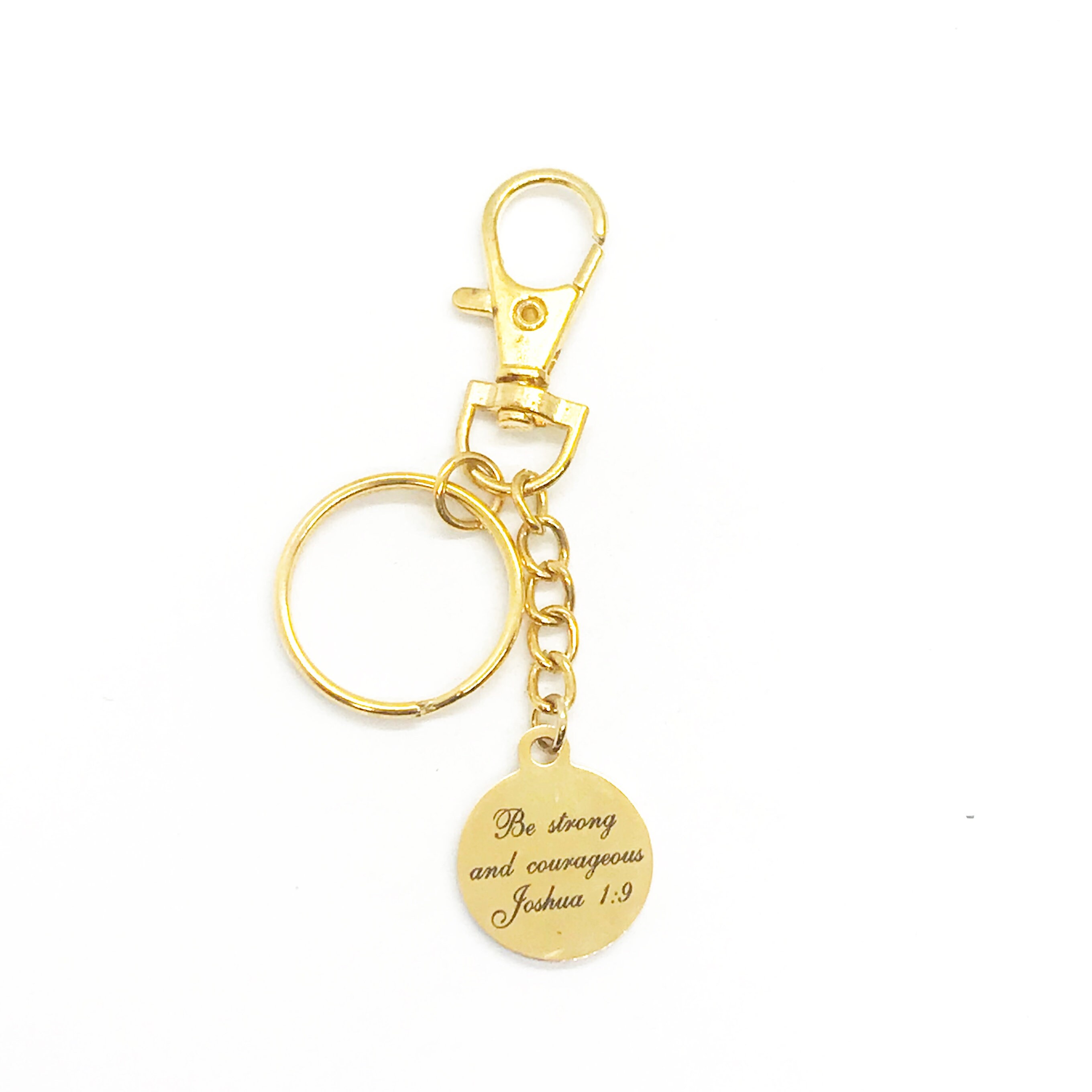 This is a great goldtone keychain gift . The keyring can be clipped onto your bag to make it easy to access without digging to the bottom of the bag. It has a goldplated stainless steel charm with “Be strong and courageous” from Joshua 1:9 on it.