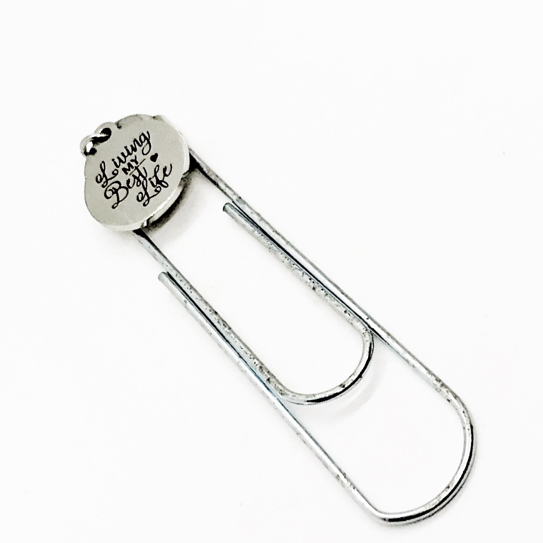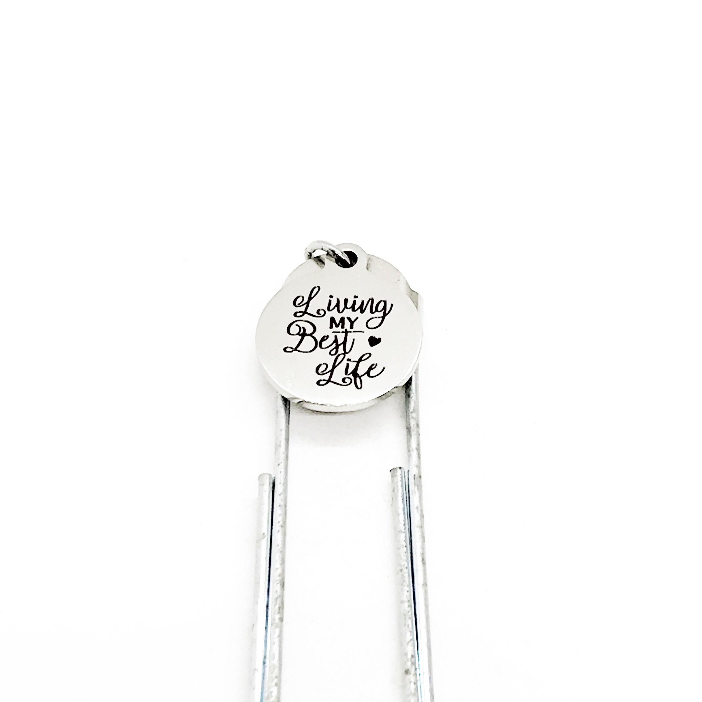 This bookmark has a stainless steel laser engraved charm with “Living my best life” on it. It can be used as a bookmark, page marker, or planner book mark.