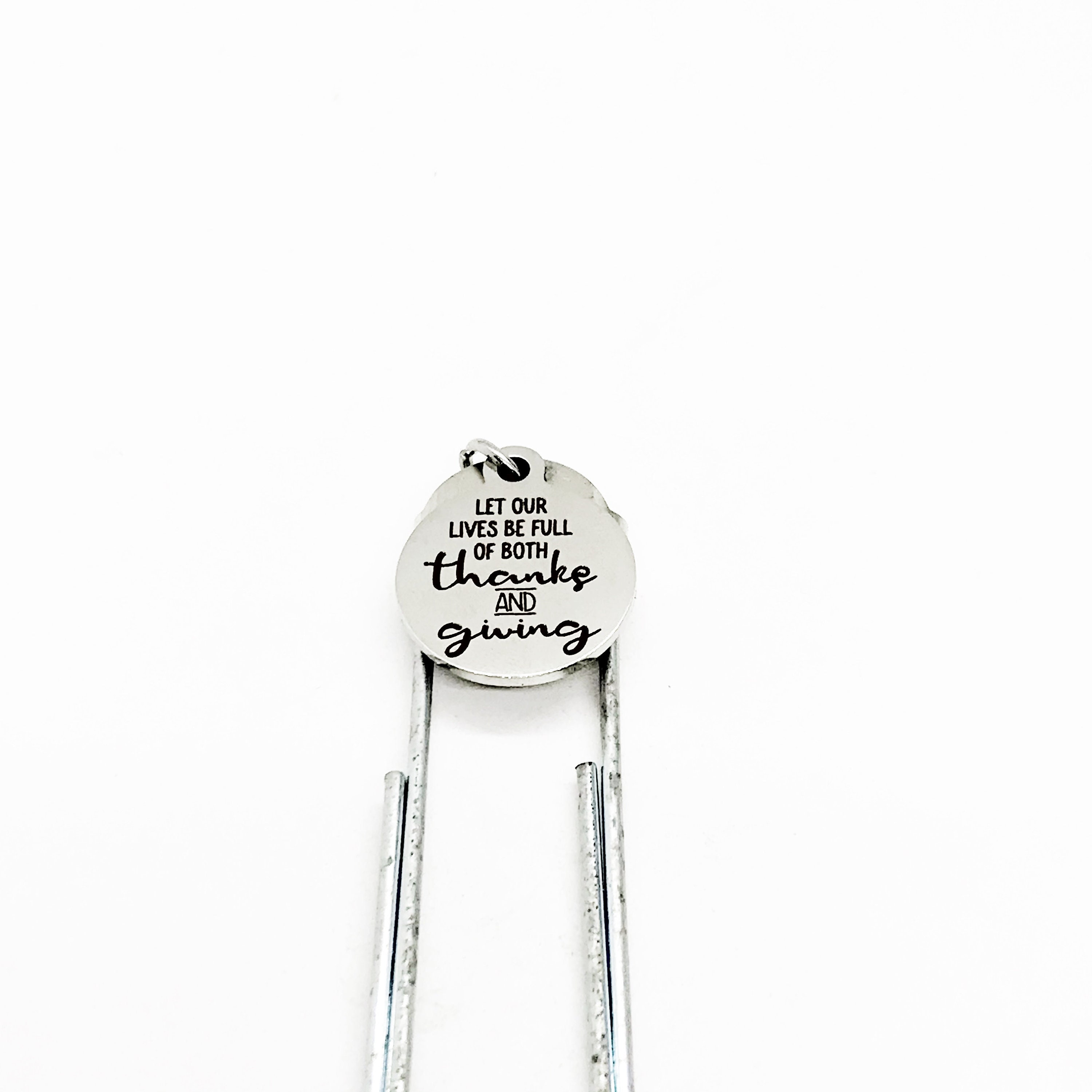 This bookmark has a stainless steel laser engraved charm with “Let our lives be full of both Thanks and Giving” on it. It can be used as a bookmark, page marker, or planner book mark.