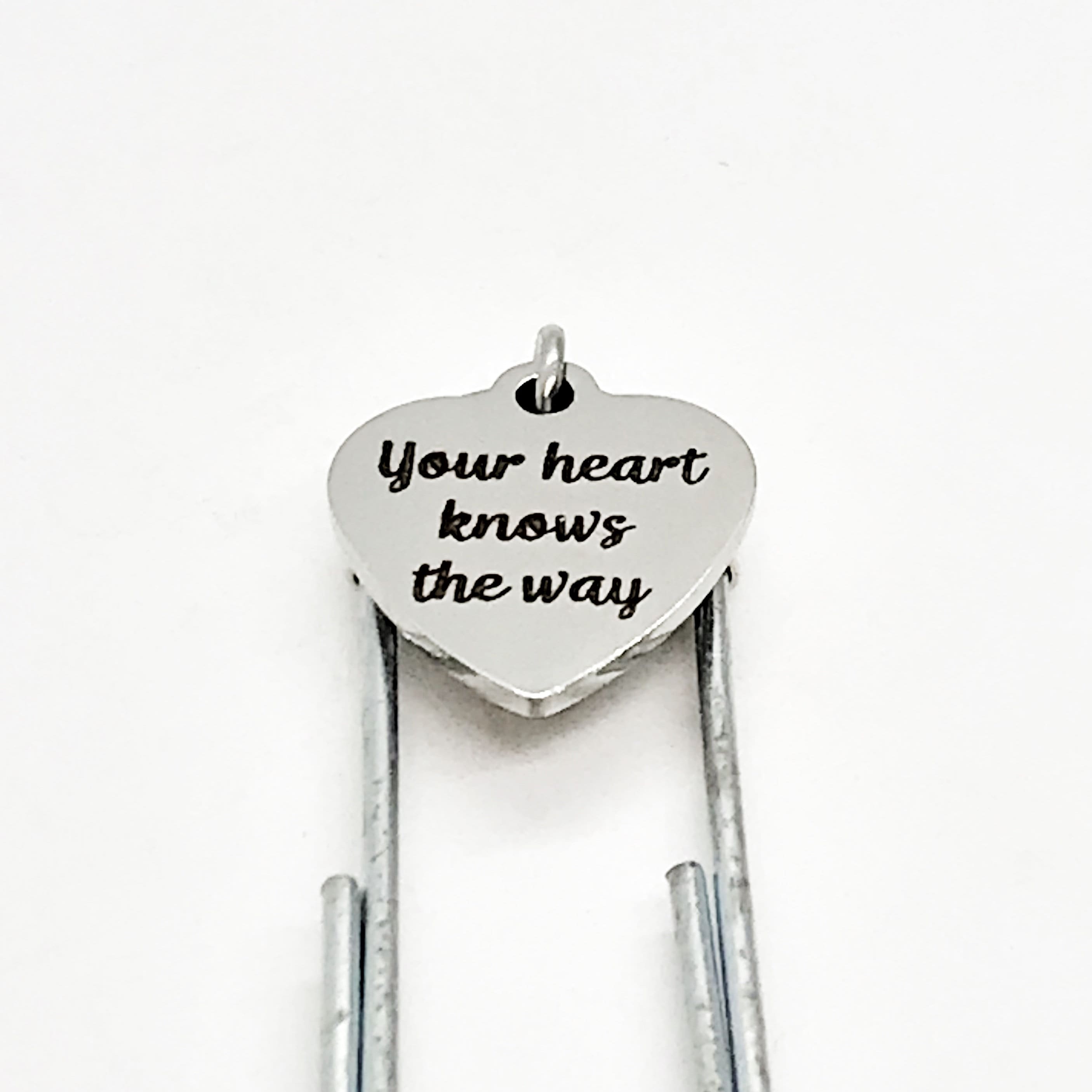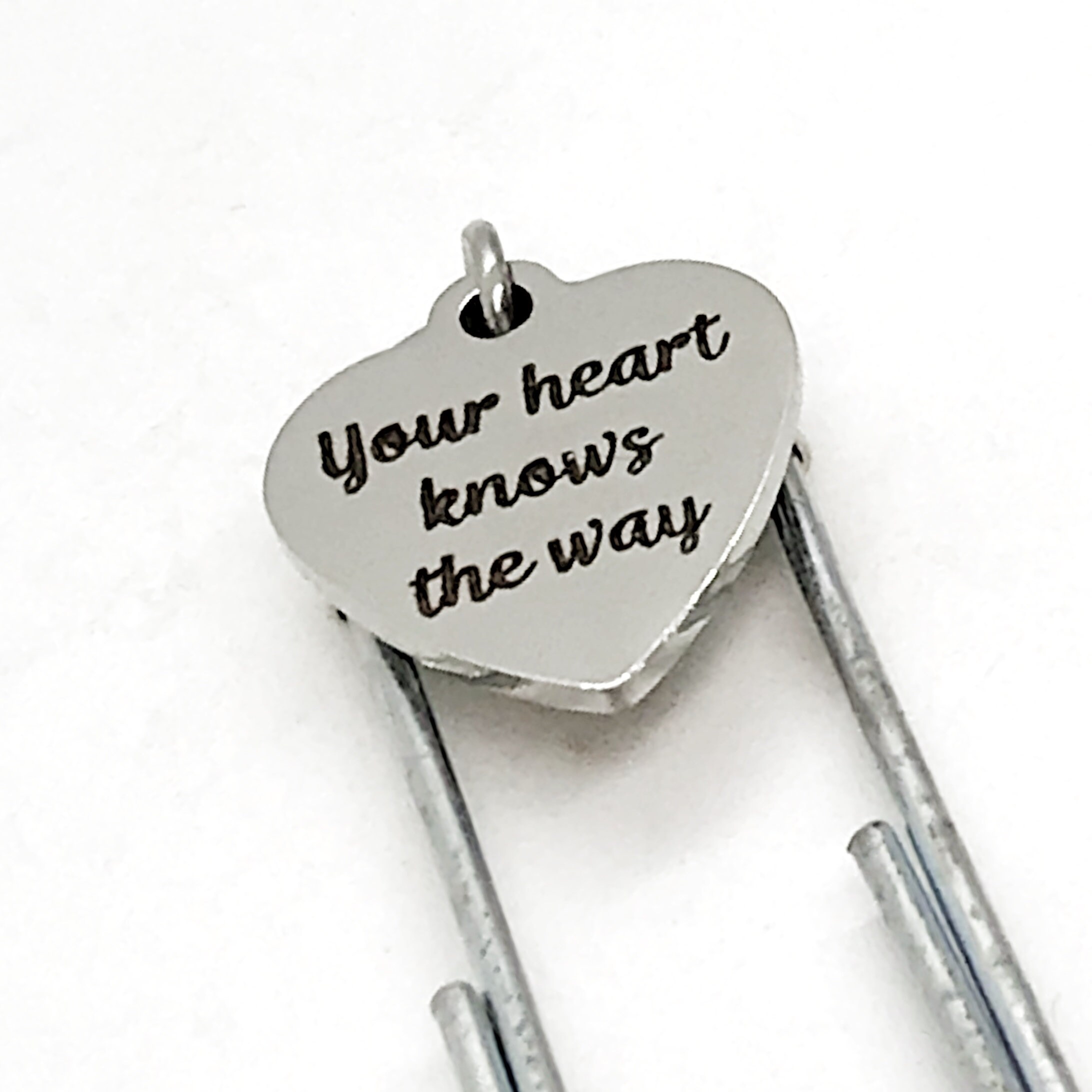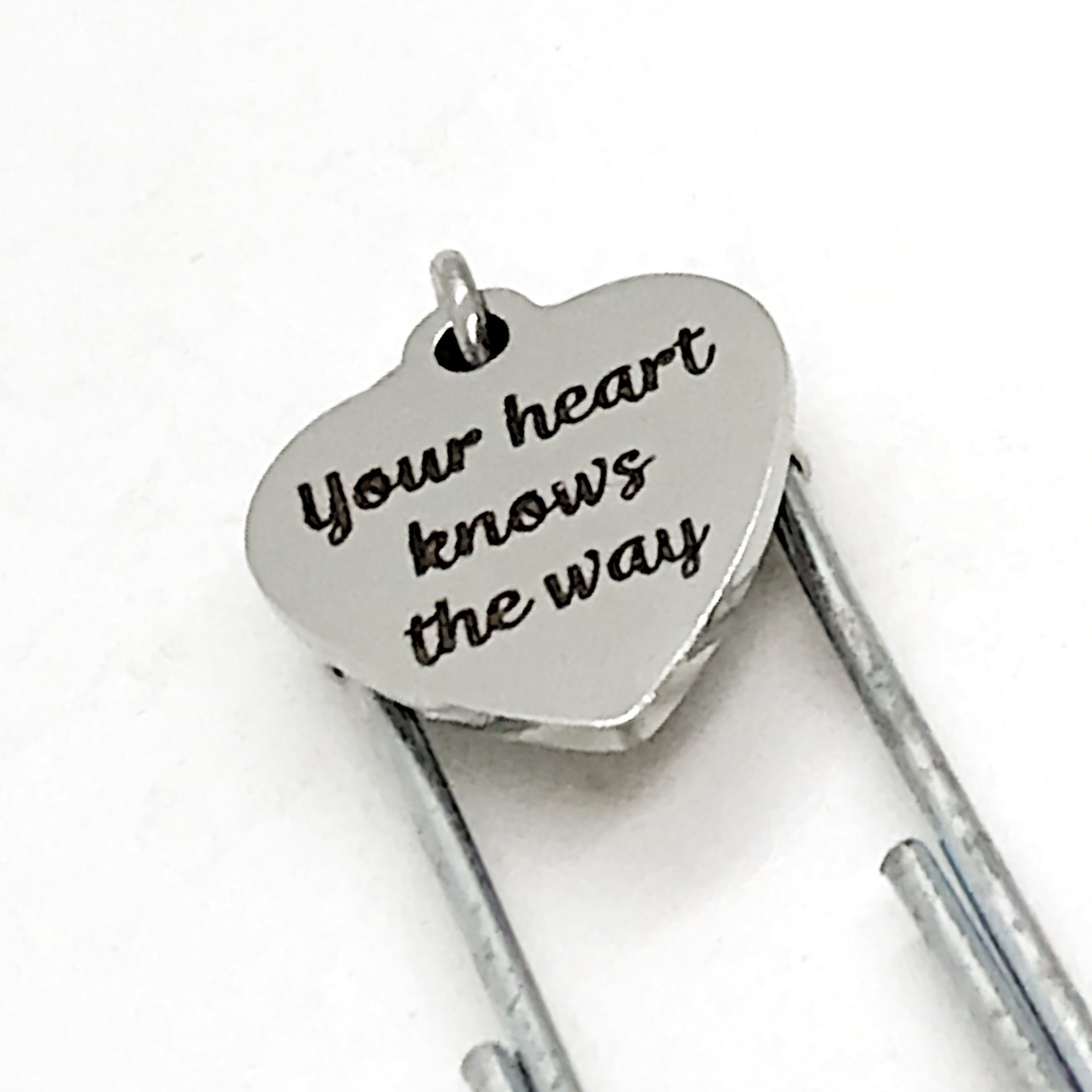 This bookmark has a stainless steel laser engraved charm that says “Your heart knows the way”.