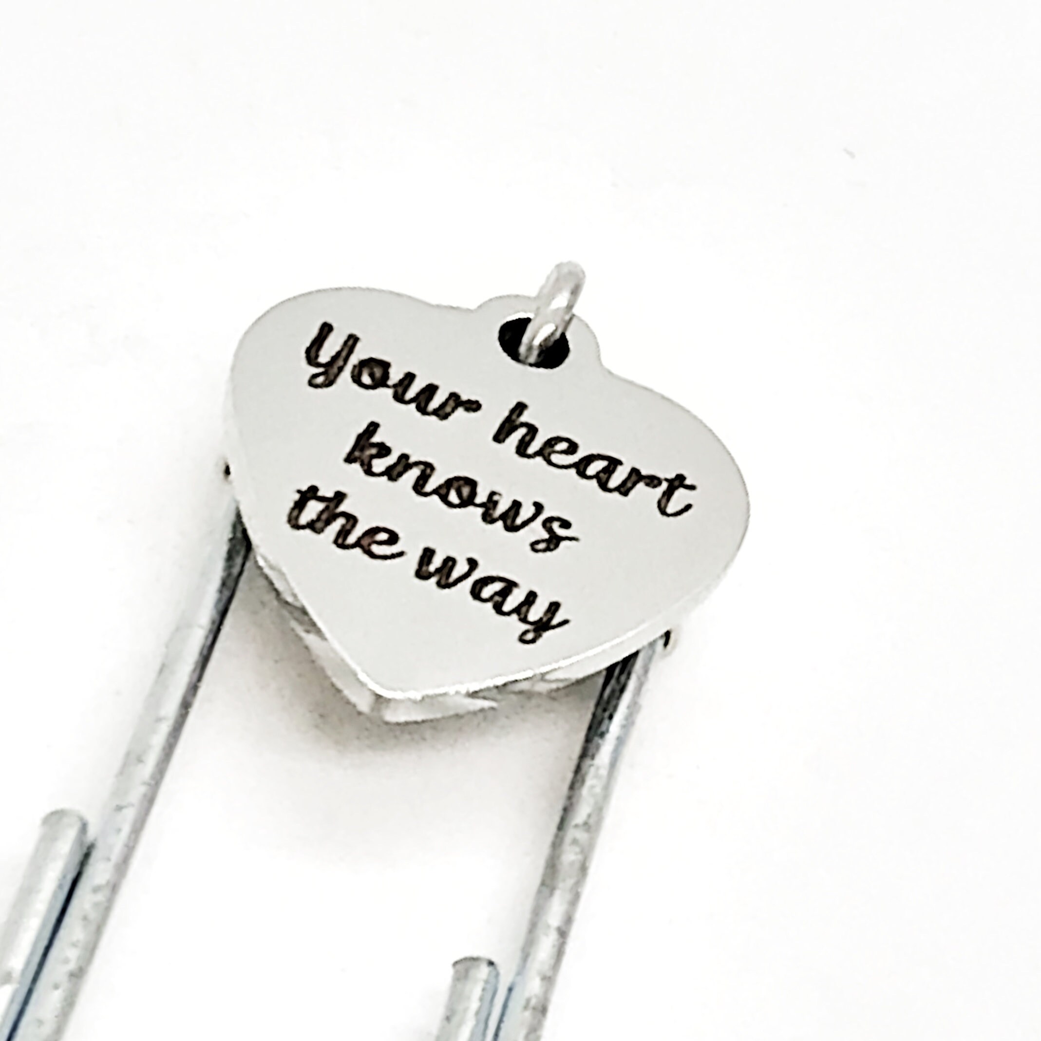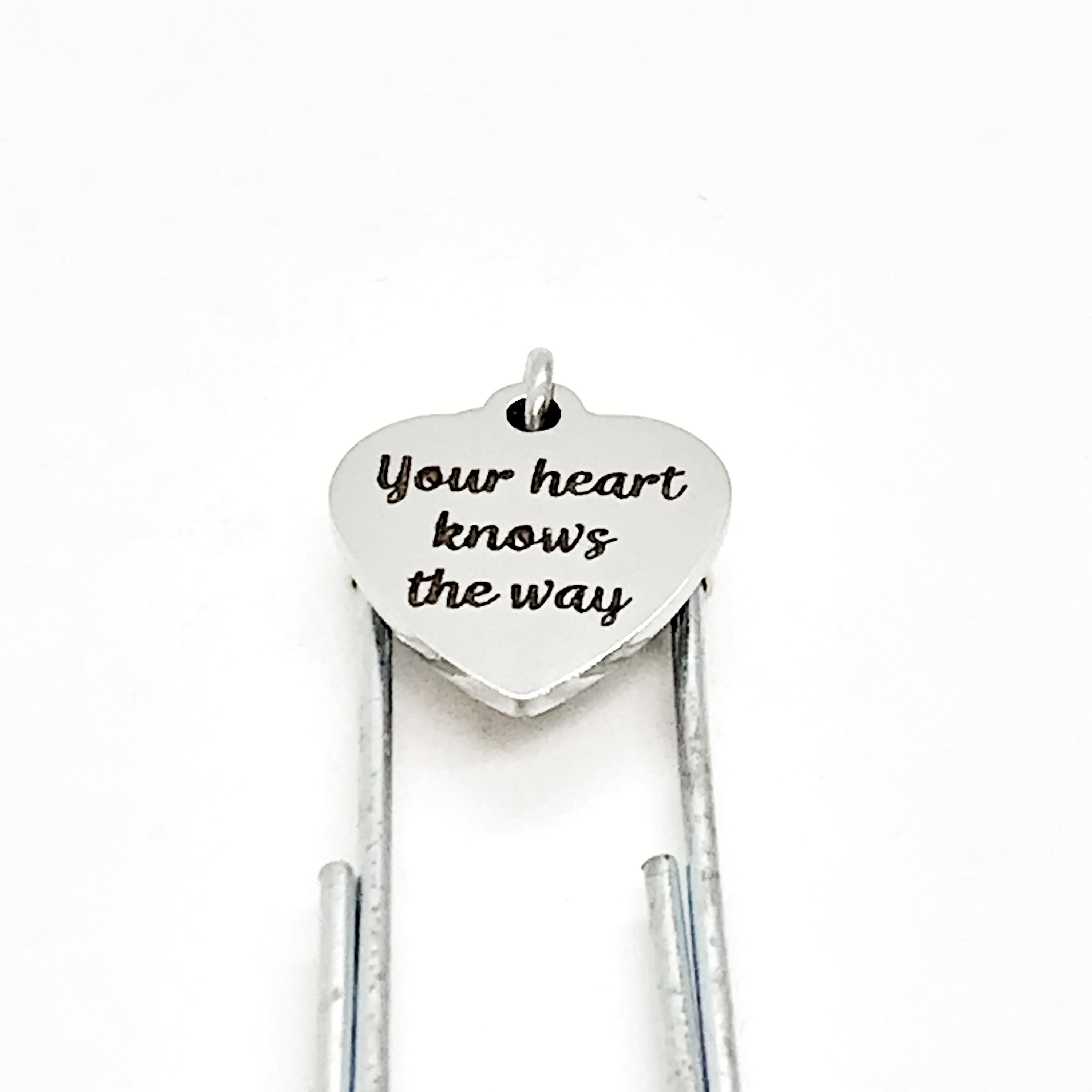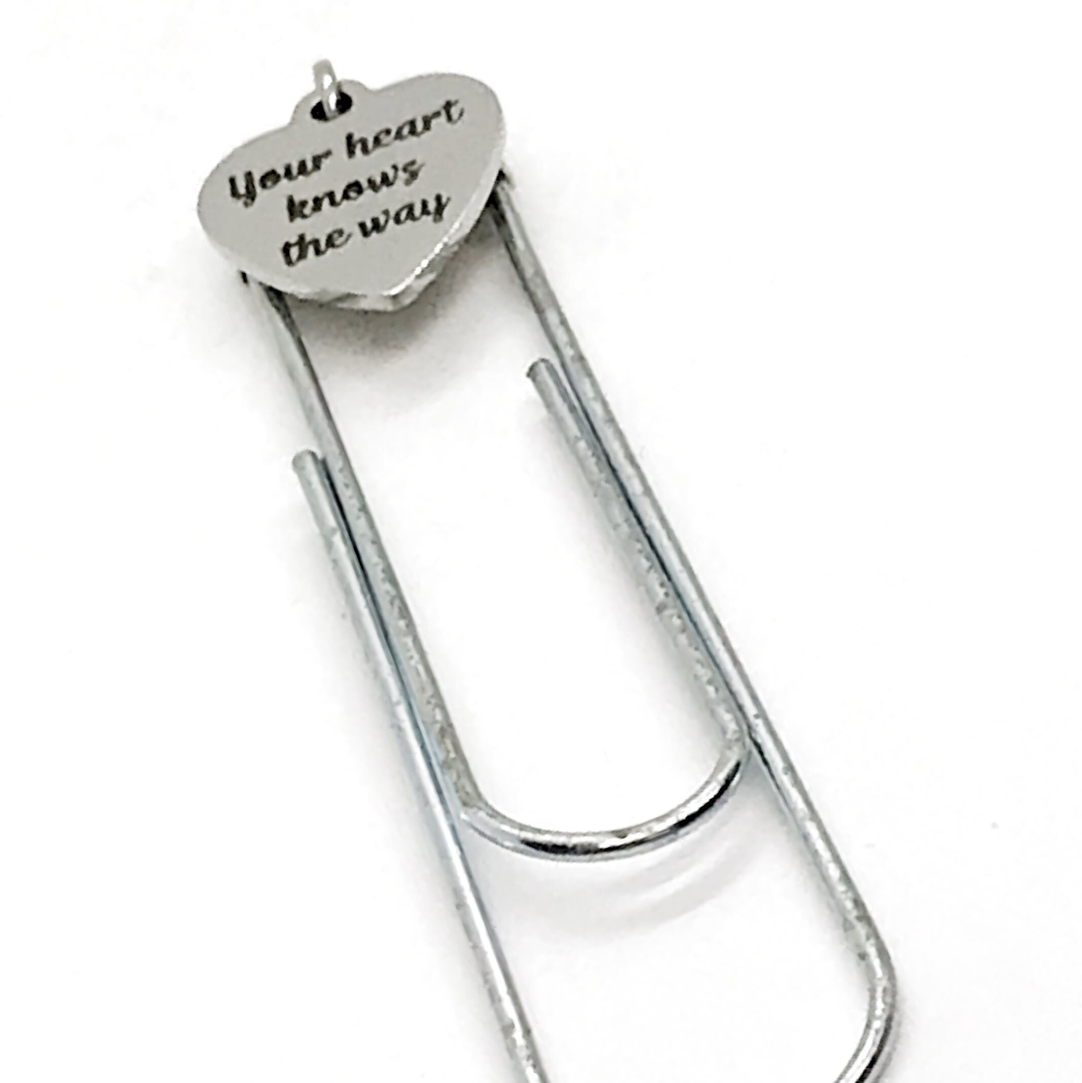 This bookmark has a stainless steel laser engraved charm that says “Your heart knows the way”.