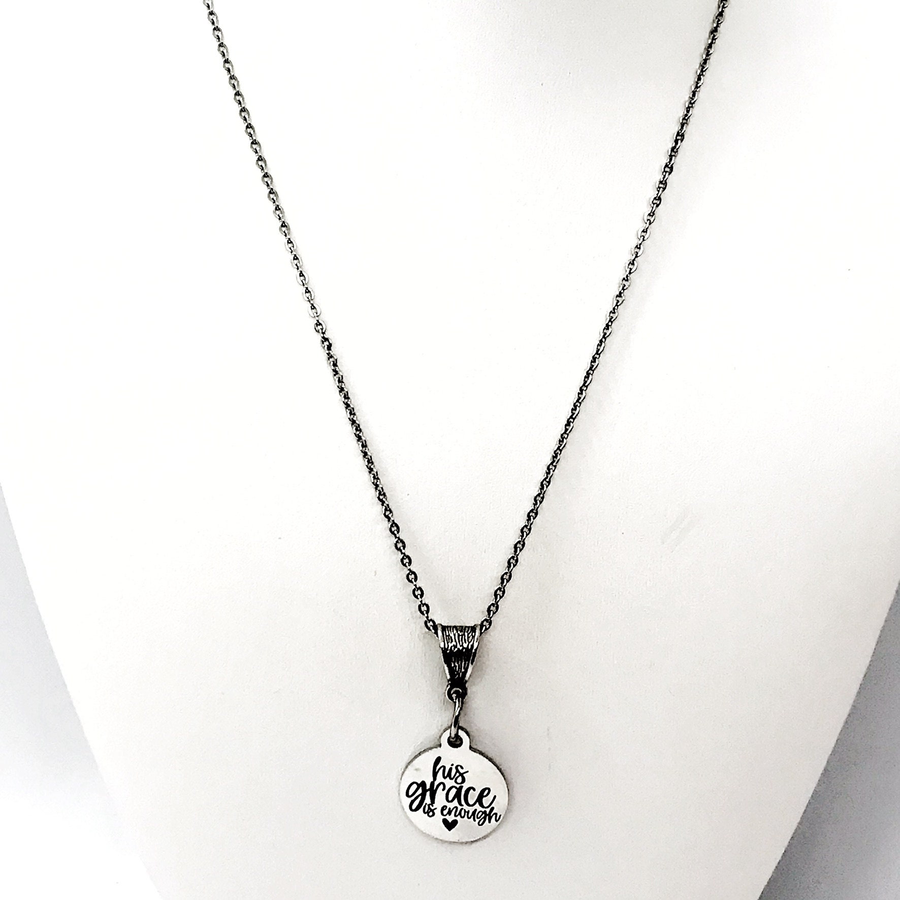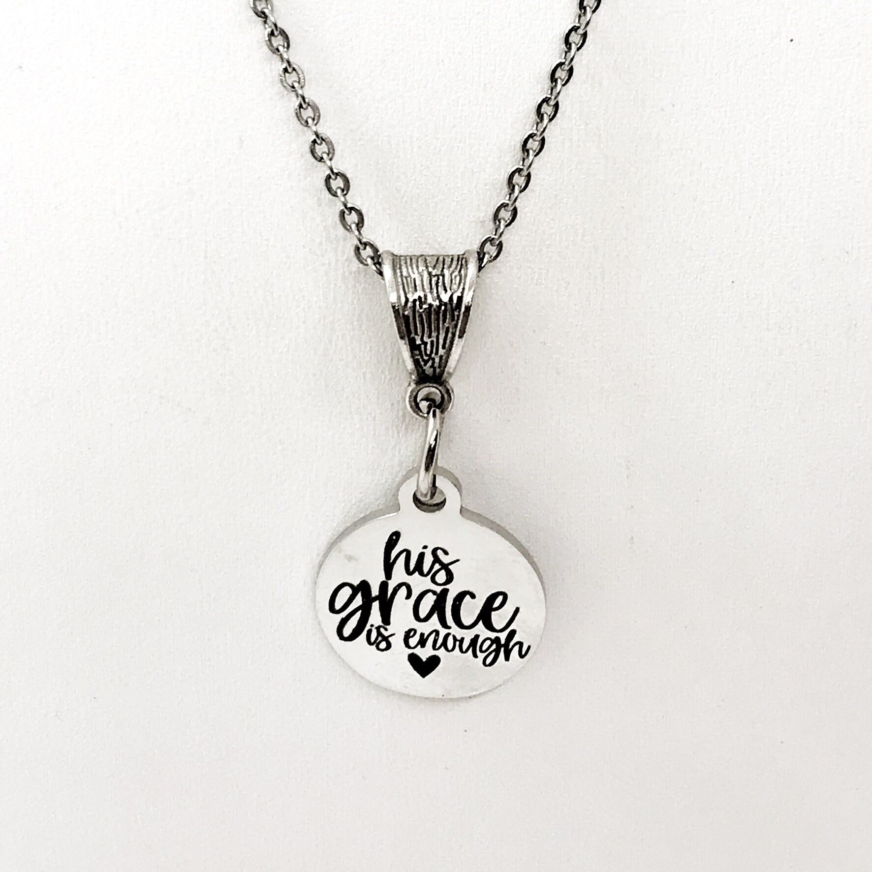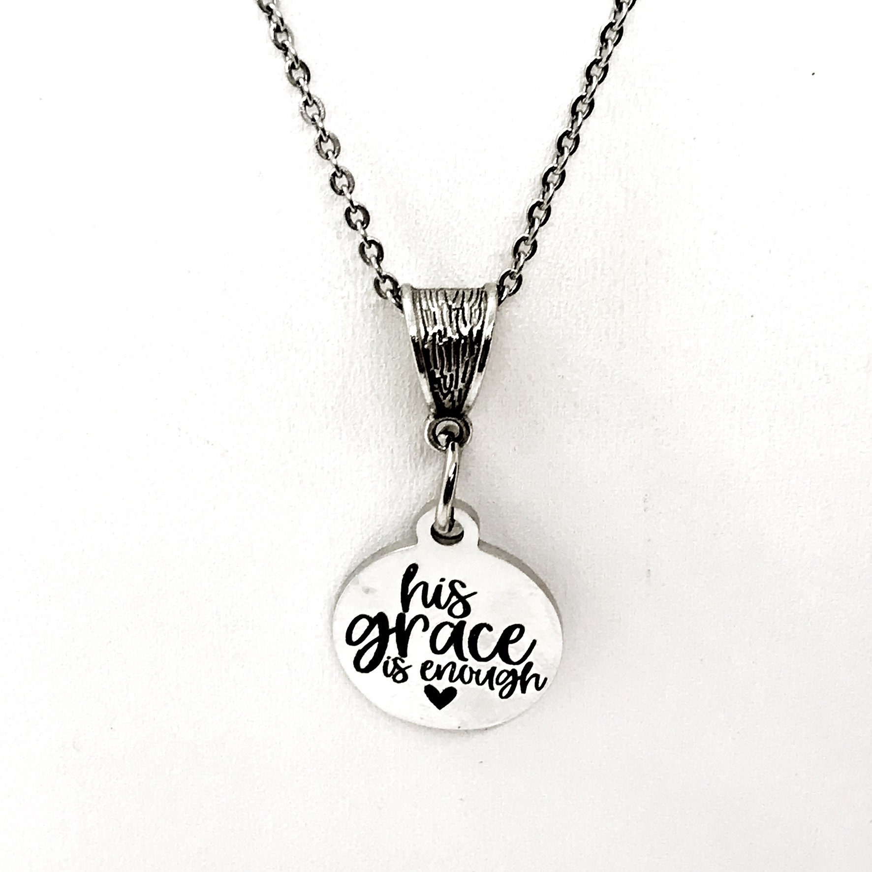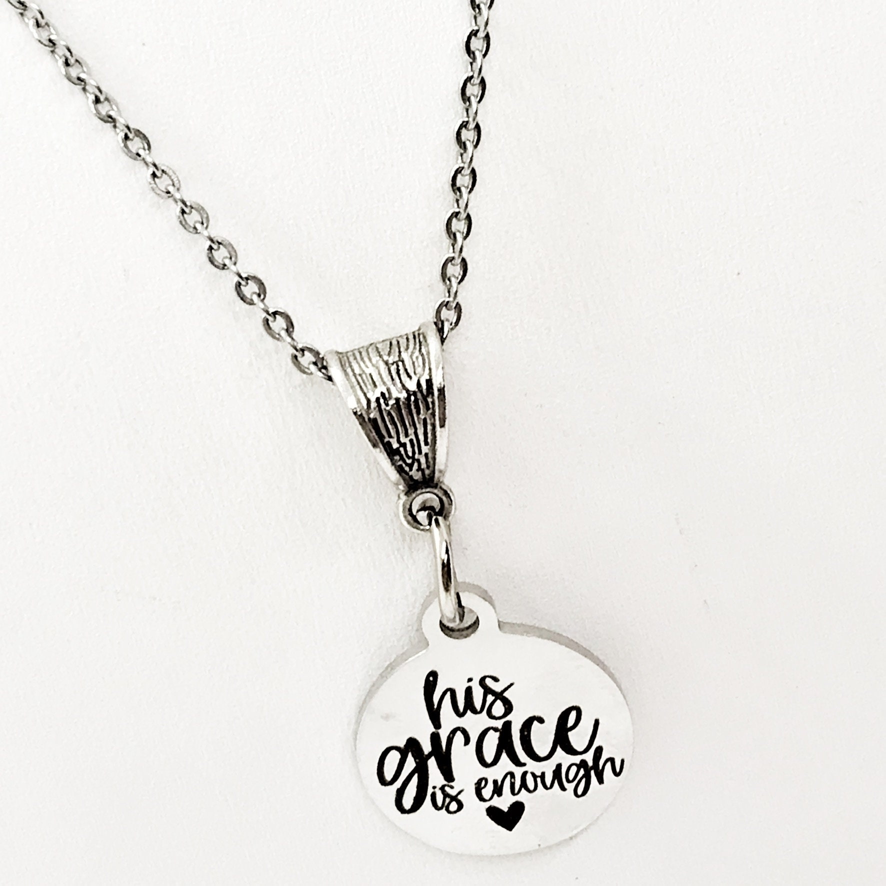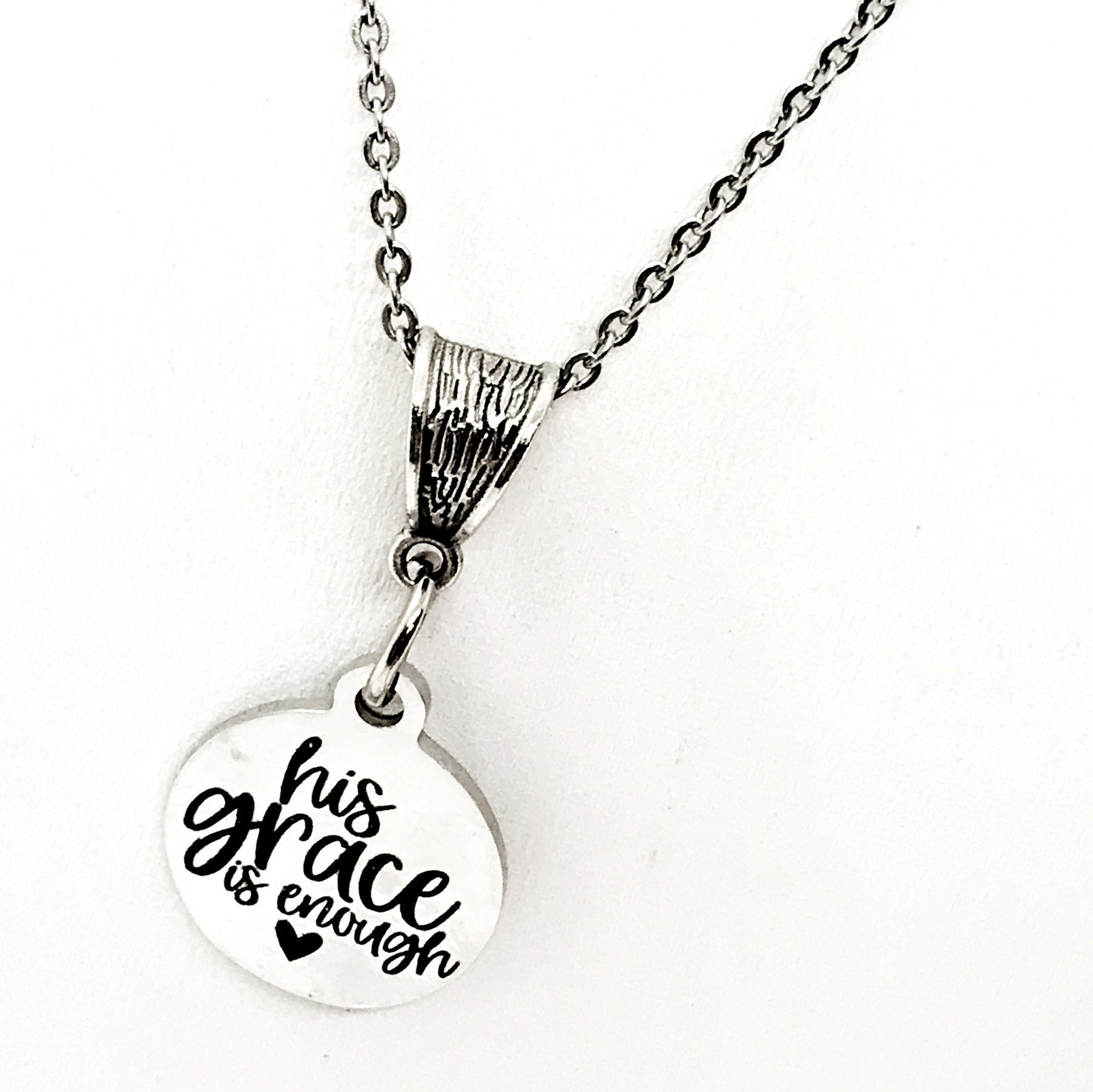 This beautiful necklace would make a great Christian jewelry piece. The pendant is a stainless steel laser engraved charm with “His grace is enough” on it with a silver-tone bail.
