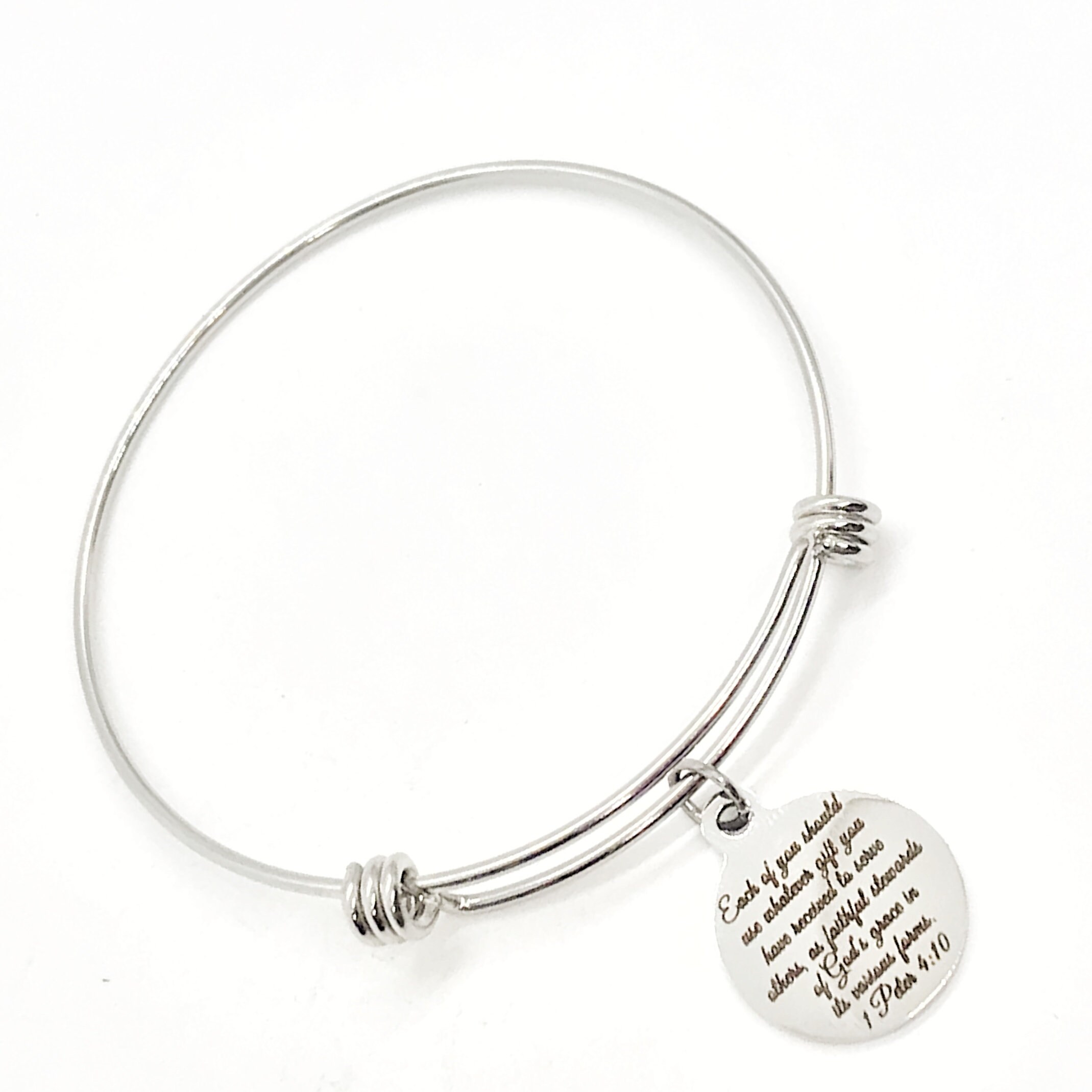 This is a beautiful bangle bracelet with a laser engraved stainless steel charm that has "Each of you should use whatever gift you have received to serve others, as faithful stewards of God’s grace in its various forms." from 1 Peter 4:10 on it.