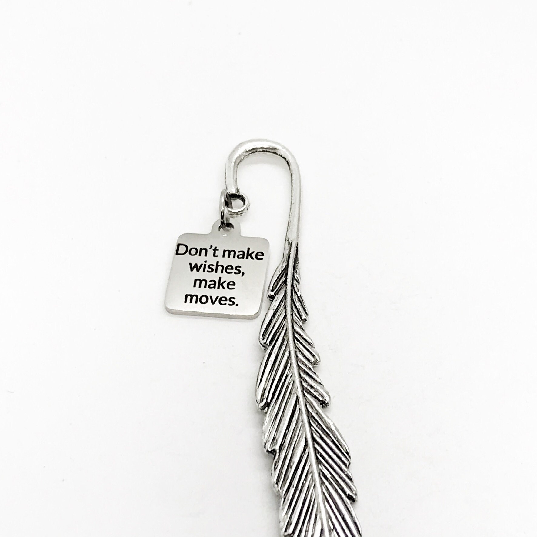 This bookmark would be a great encouragement planner gift bookmark or reader gift. It has a stainless steel laser engraved charm with “Don’t make wishes, make moves.” on it.