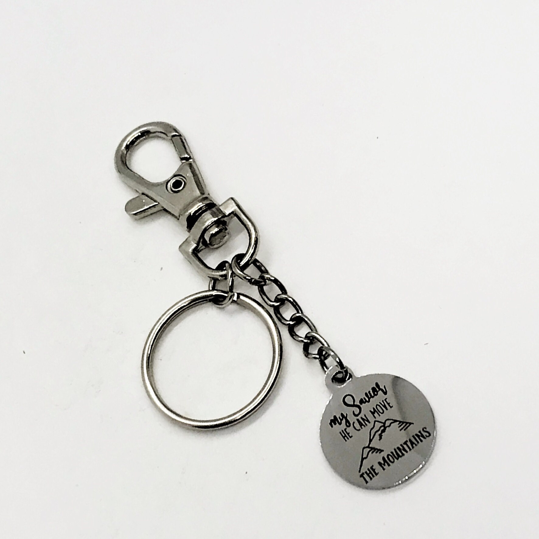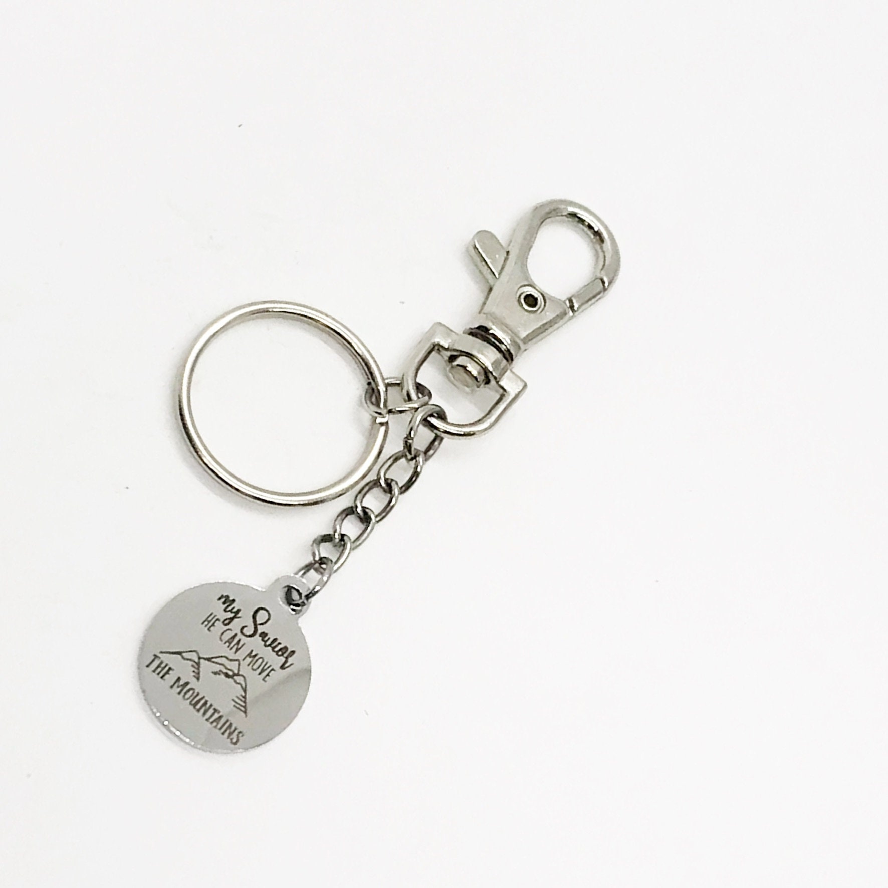 This is a great keychain to express faith. It has a stainless steel laser engraved charm with “My Savior He can move the mountains” on it. The keyring can be clipped onto your bag to make it easy to access without digging to the bottom of the bag.