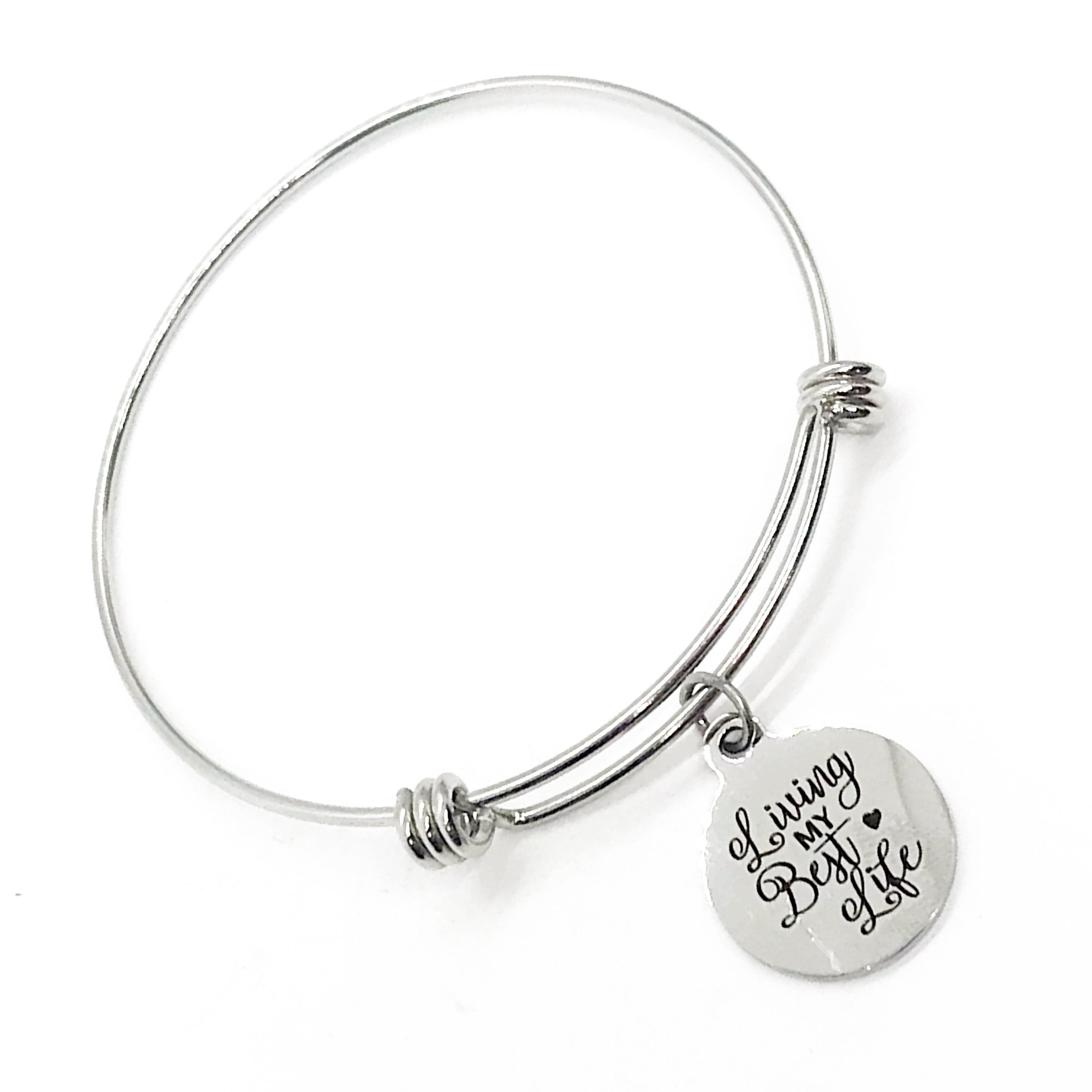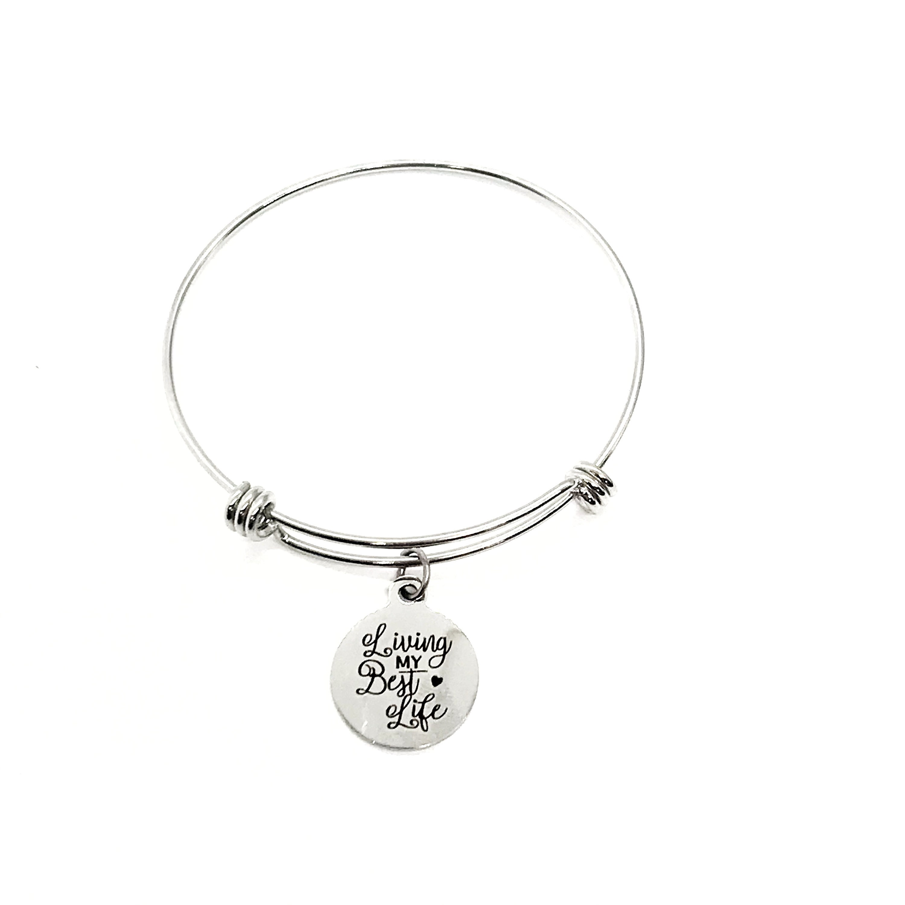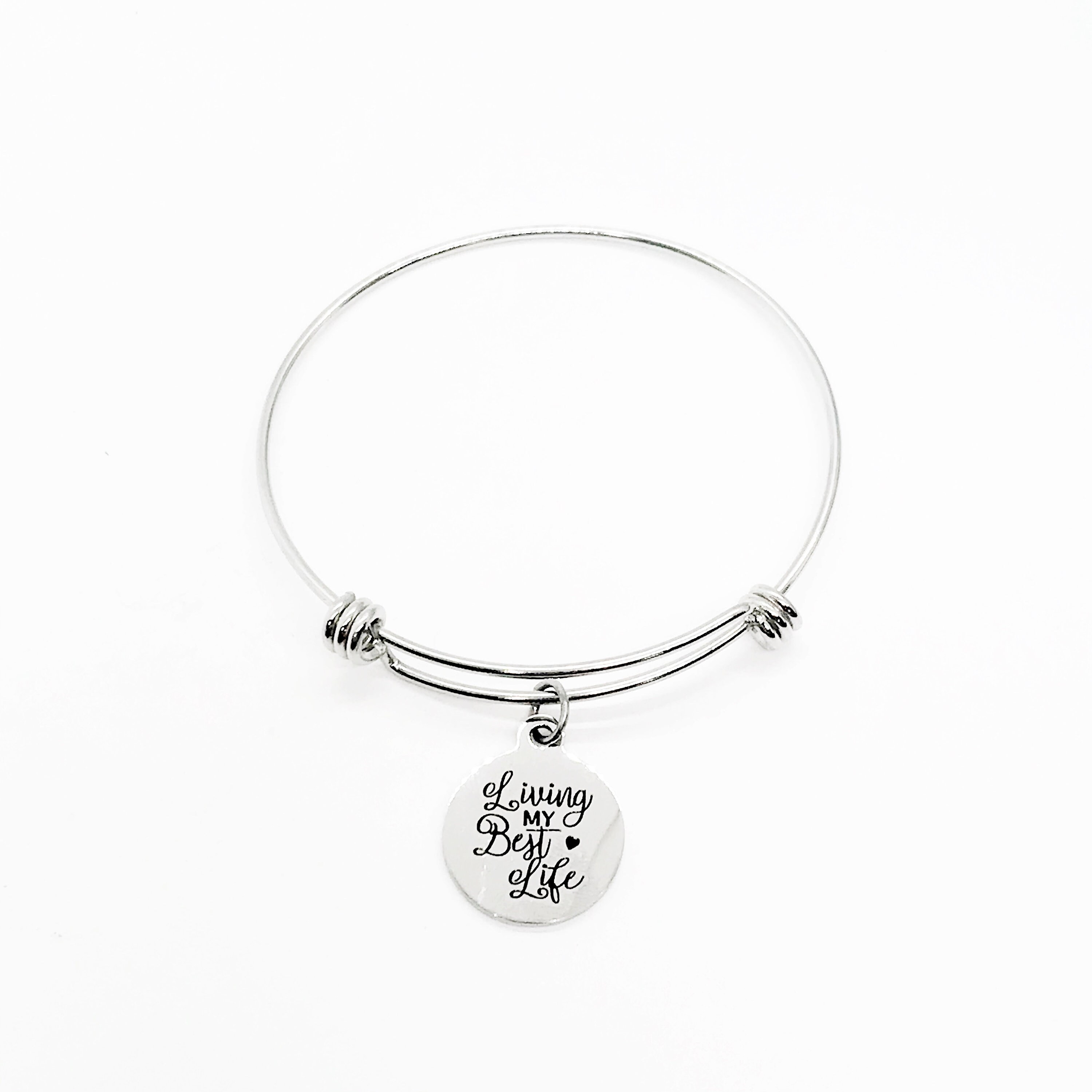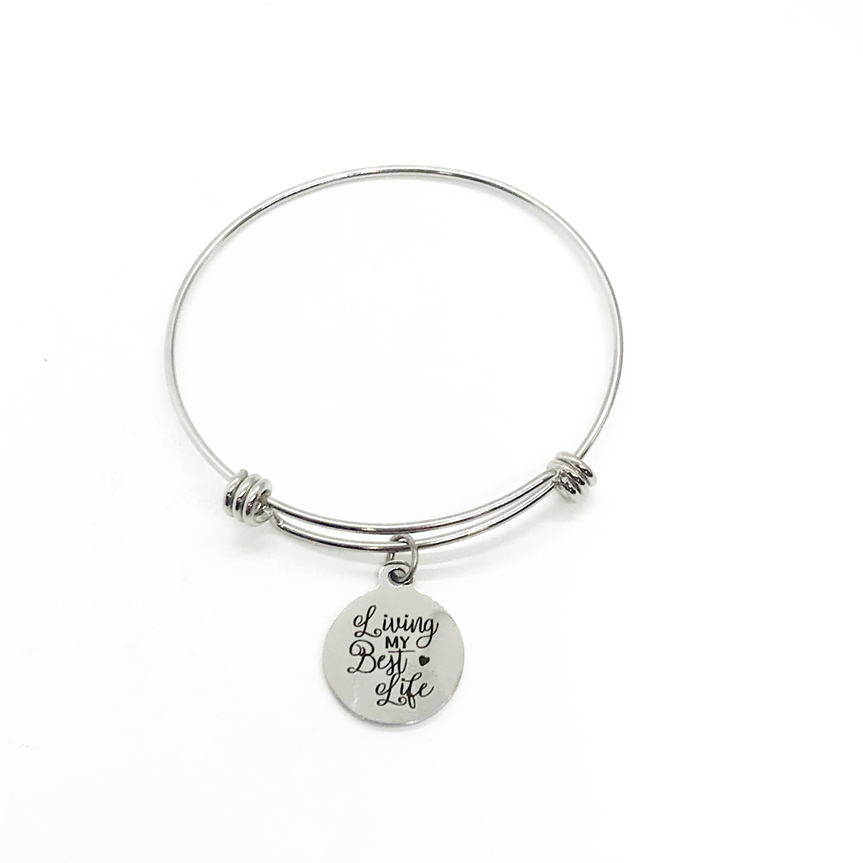 This is a beautiful bangle bracelet with a laser engraved stainless steel charm that has "Living my best life" on it.