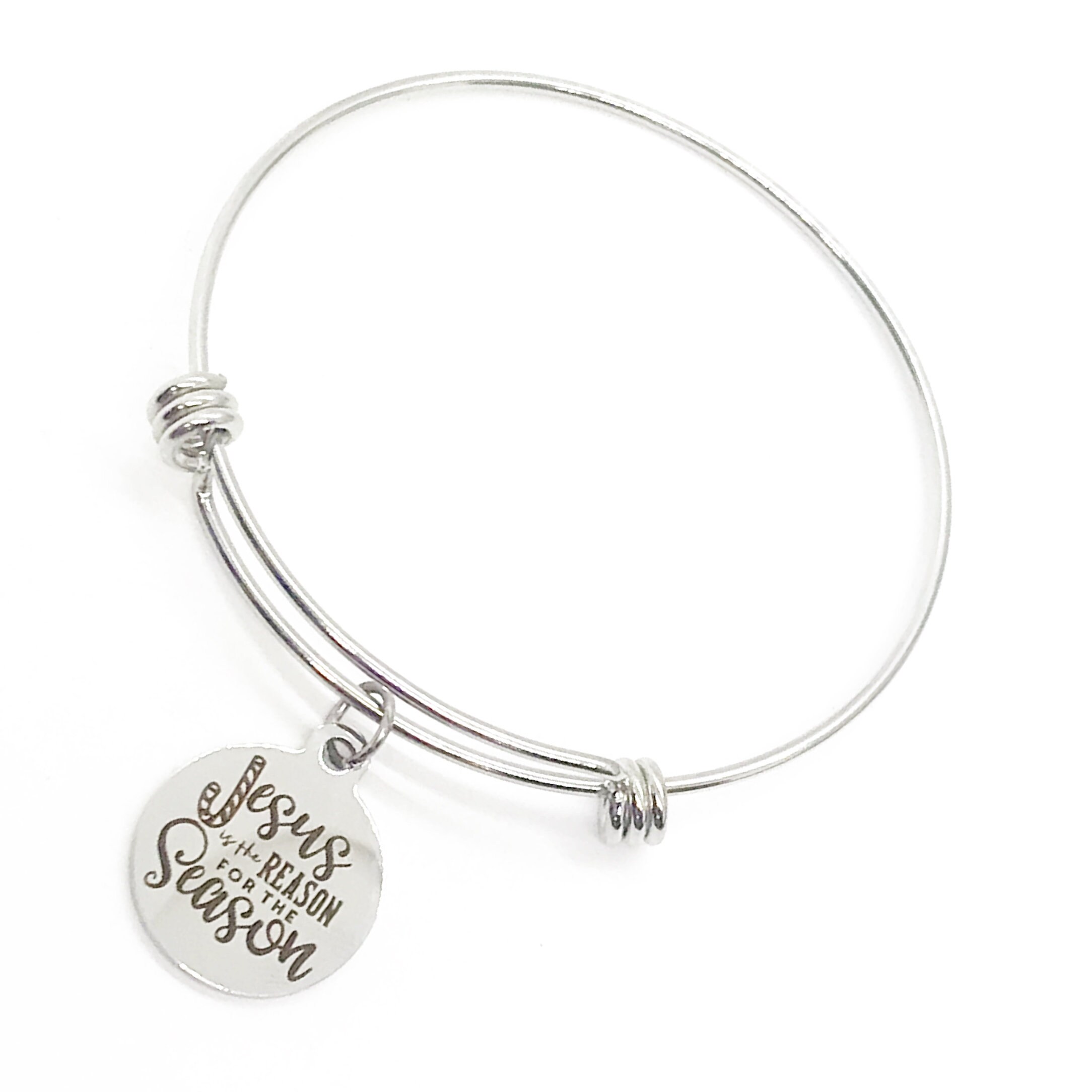 This is a beautiful bangle bracelet with a laser engraved stainless steel charm that has "Jesus is the reason for the season" on it