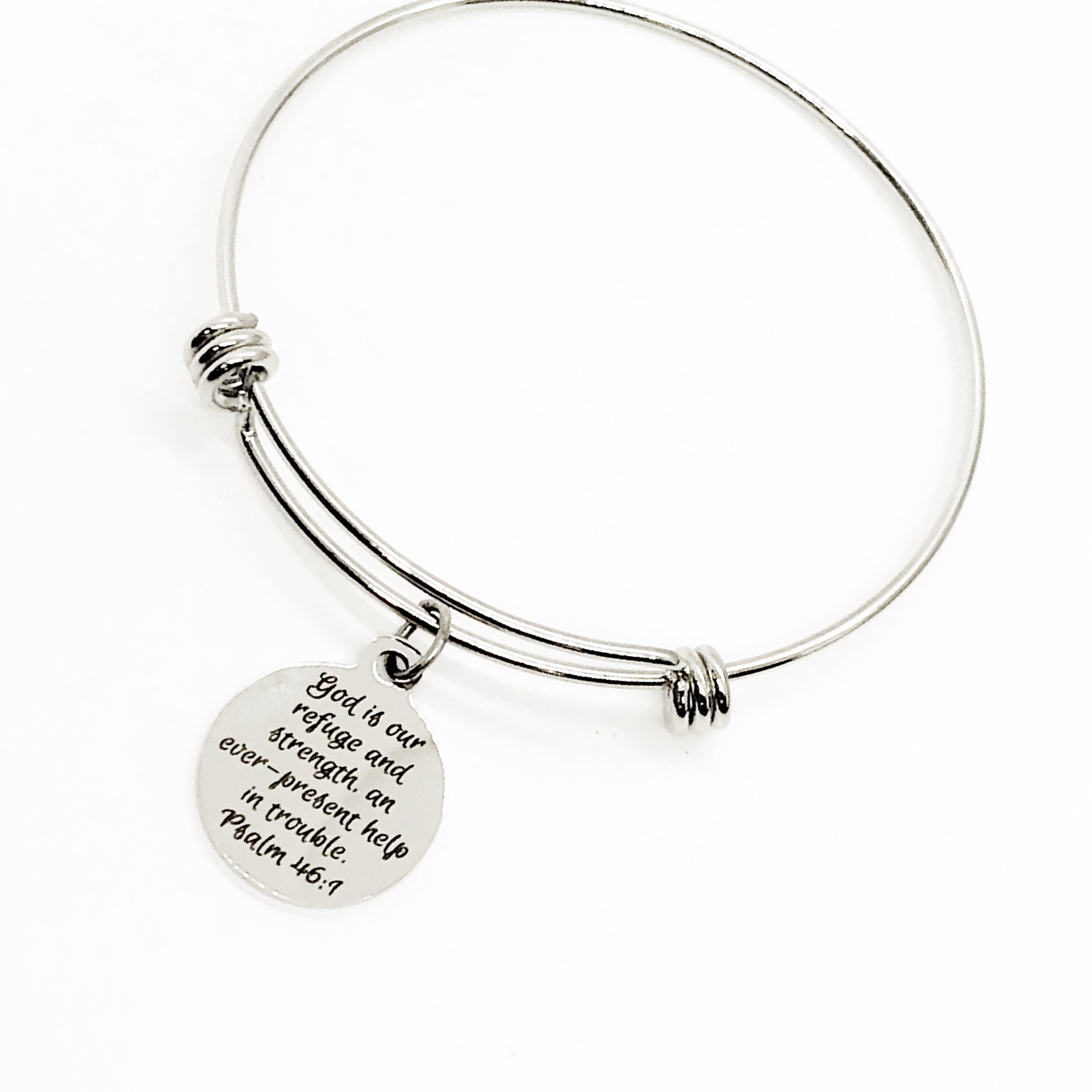 This is a beautiful bangle bracelet with a laser engraved stainless steel charm that has "God is our refuge and strength, an ever-present help in trouble" from Psalm 46:1 on it.