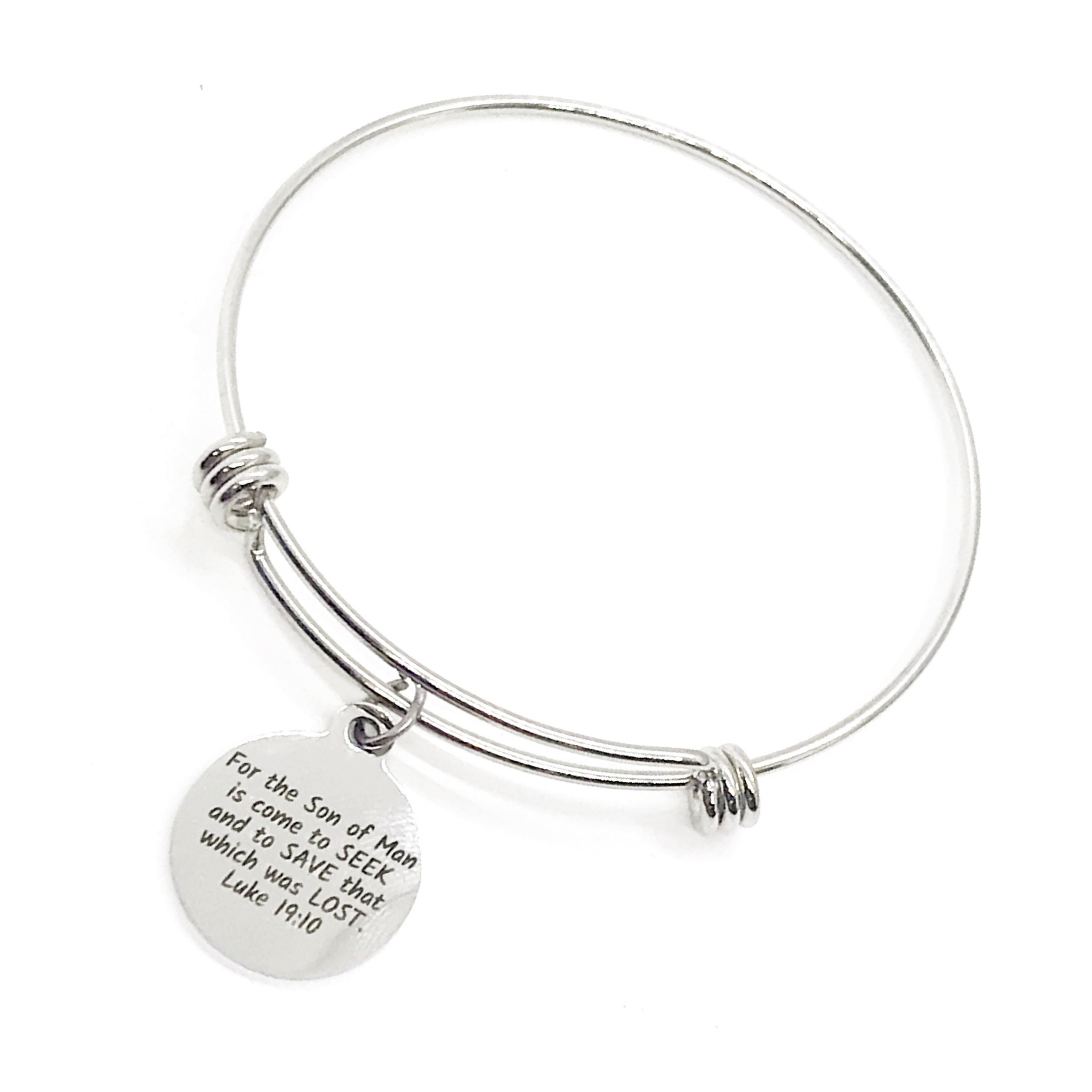 This is a beautiful bangle bracelet with a laser engraved stainless steel charm that has "For the Son of Man is come to SEEK and to SAVE that which was LOST" from Luke 19:10 on it.