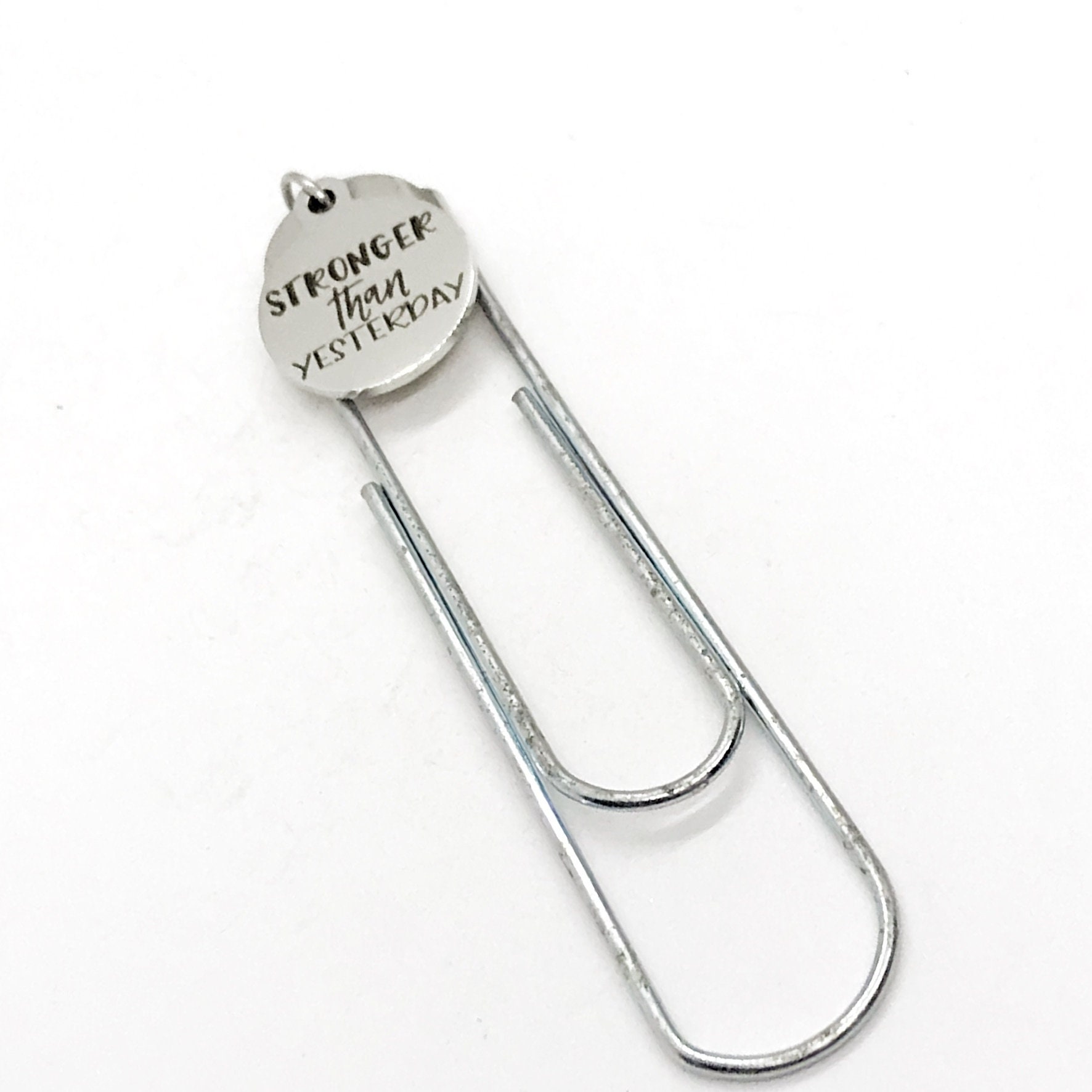 This is a great bookmark to encourage someone to keep working to get stronger each day. It has a stainless steel laser engraved charm with “Stronger than yesterday” on it.