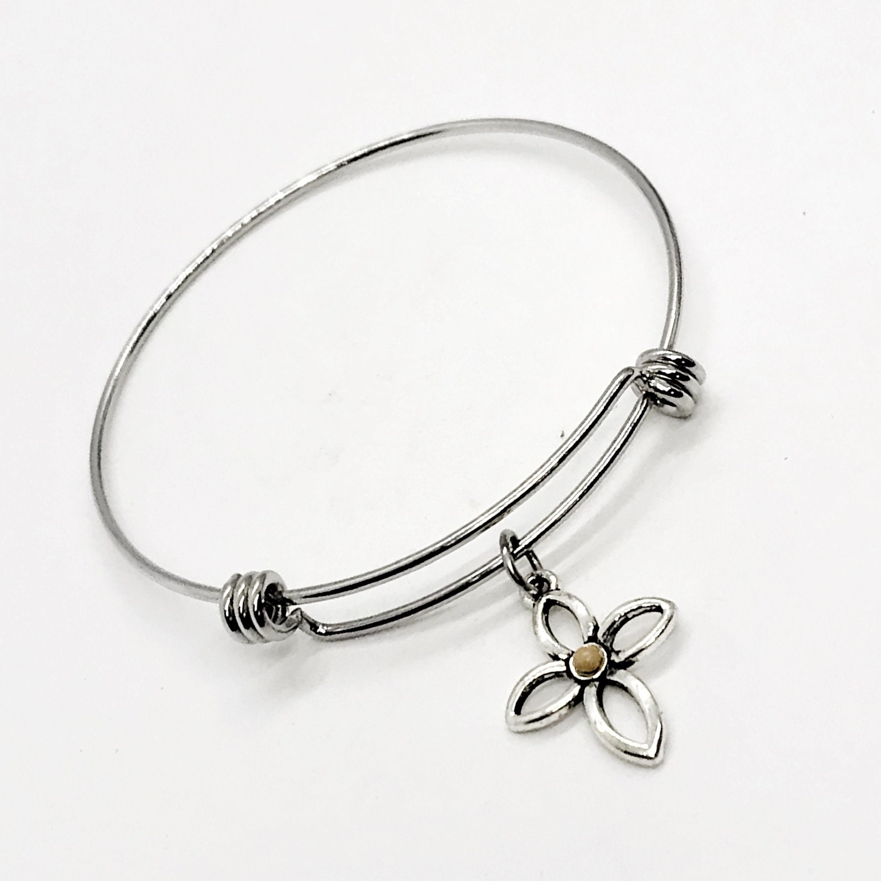 The bracelet is made of stainless steel and will withstand regular wear without tarnishing or changing colors. The bracelet come in three available sizes. It expands to easily slide on to any wrist size. The charm is 3/4 inch.