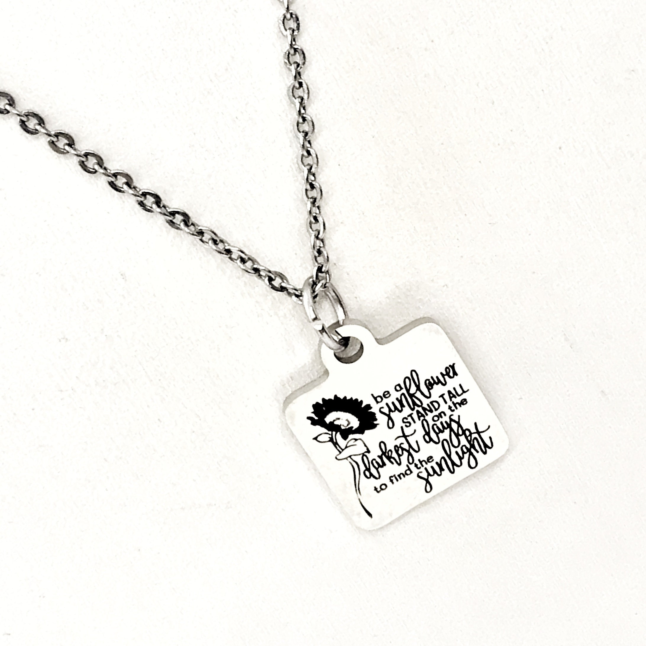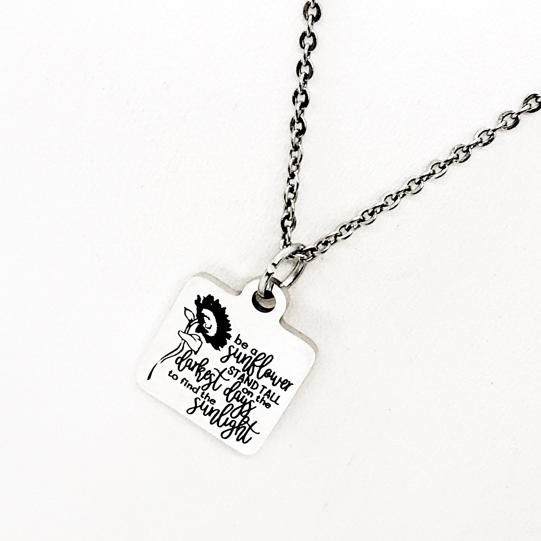This necklace would be a great jewelry gift to remind the wearer to always stand tall and look for the sunshine. The pendant is a stainless steel laser engraved pendant with “Be a sunflower. Stand tall on the darkest days to find the sunlight” on it.