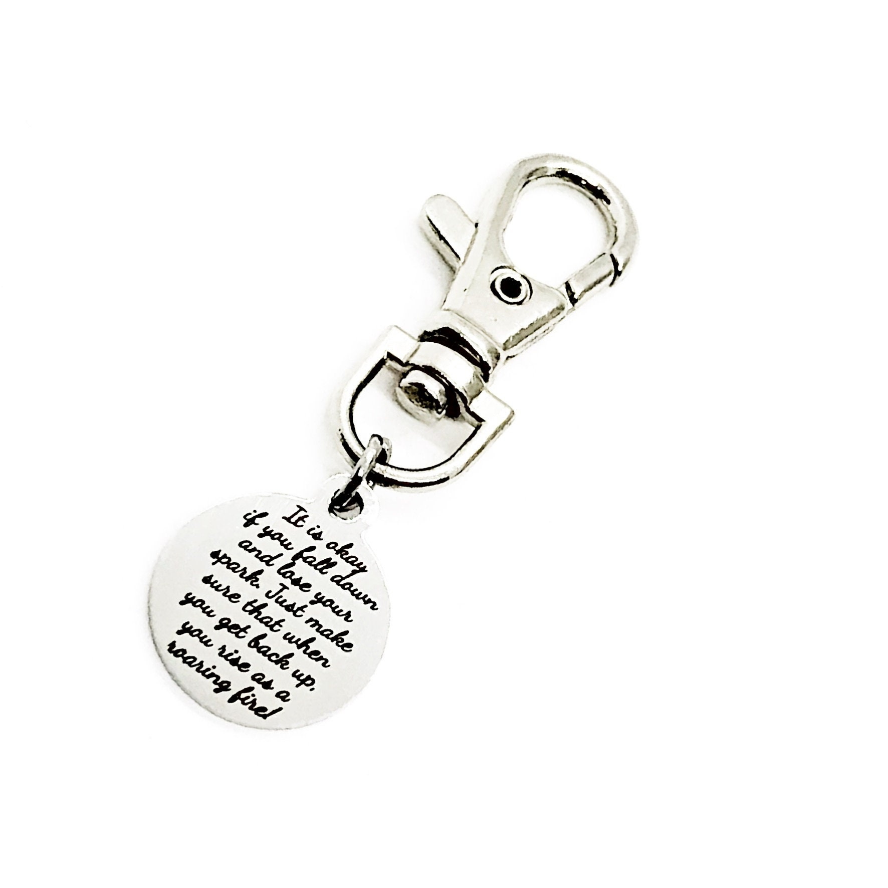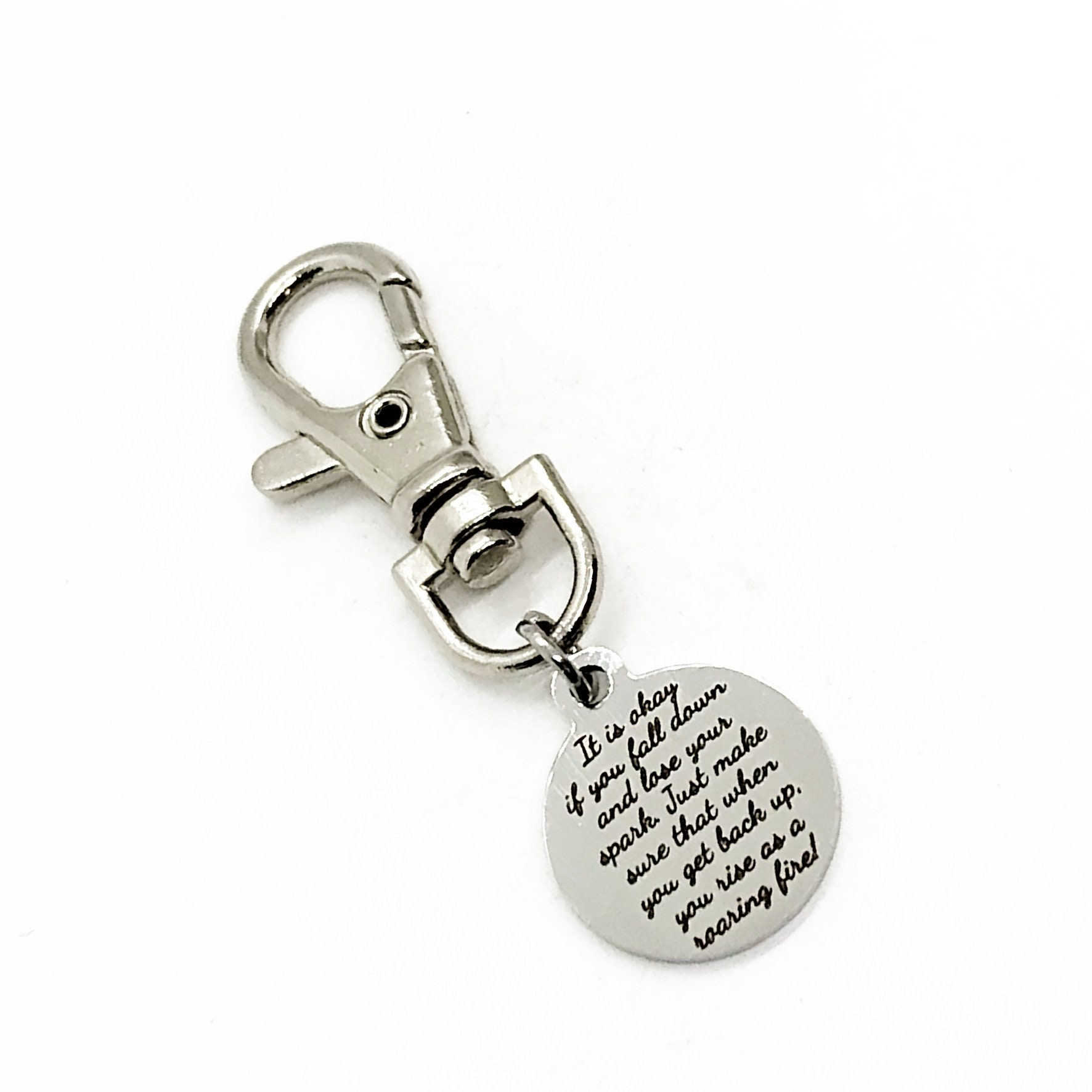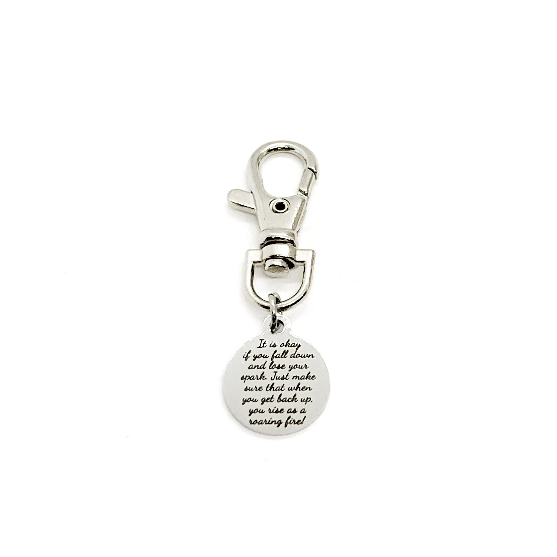 This is a great zipper pull or bag charm clip gift that would be a perfect gift for yourself or someone you love. It would be a great charm to clip onto a tote, purse, sports bag, book bag or keychain. It has a stainless steel laser engraved charm with “It is okay to fall down and lose your spark. Just make sure that when you get back up you rise as a roaring fire!” on it. The charm measures approx. 3/4 inch across.