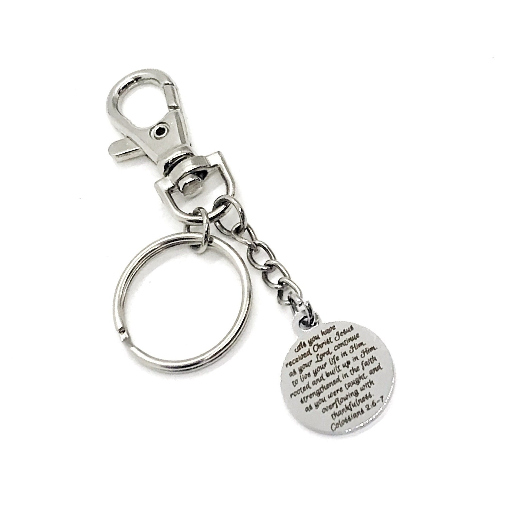 This is a great keychain gift to encourage someone in faith. It has a stainless steel laser engraved charm that has “As you have received Christ Jesus as your Lord, continue to live your life in Him, rooted and built up in Him, strengthened in the faith as you were taught and overflowing with thankfulness” from Colossians 2: 6-7 on it. Please note that this charm contains a lot of text so the writing is small. It is intended to be a reminder to the owner, but can also be a way for others to ask you what it says so that you can share your faith.