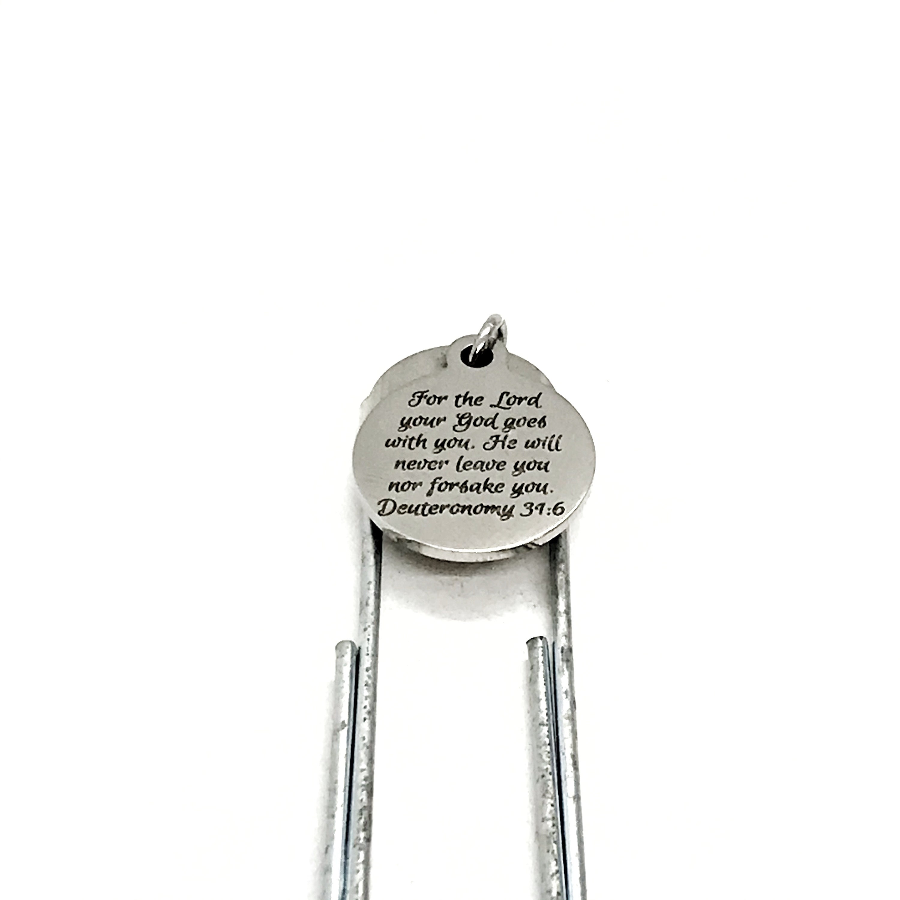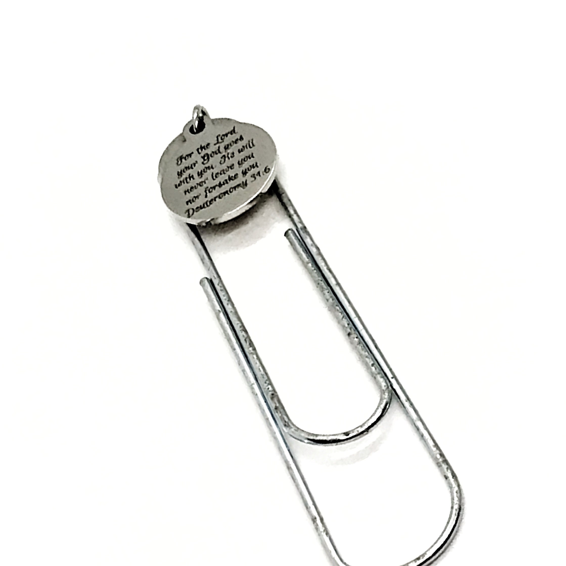 This bookmark has a stainless steel laser engraved charm with "For the Lord your God goes with you. He will never leave you nor forsake you" from Deuteronomy 31:6 on it. It can be used as a bookmark, page marker, or planner book mark.