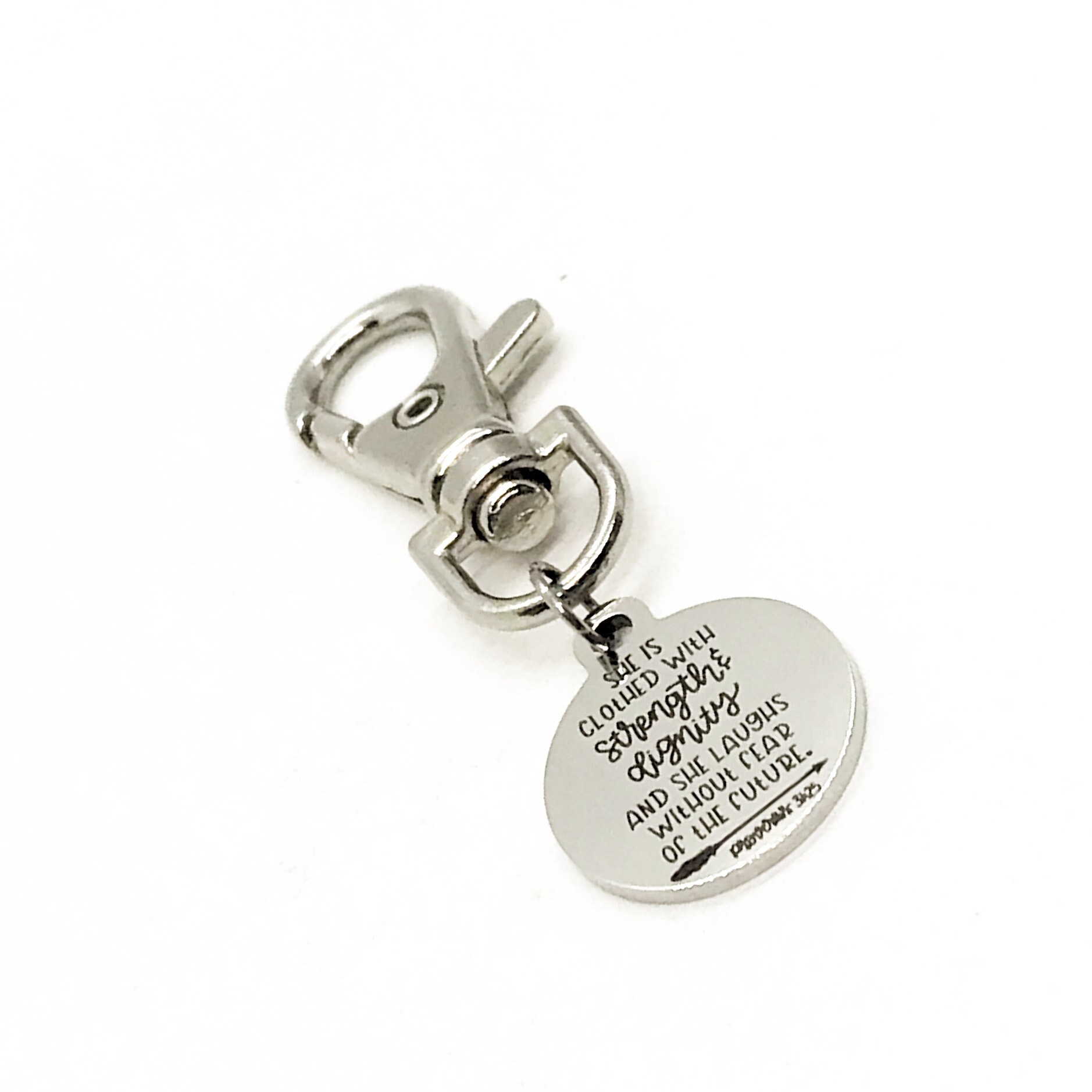 This is a great zipper pull or bag charm clip gift that would be a great gift. It would be a great charm to clip onto a tote, purse, sports bag, book bag or keychain. It has a engraved charm with “She is clothed in strength and dignity and laughs without fear of the future” from Proverbs 31:25 on it.