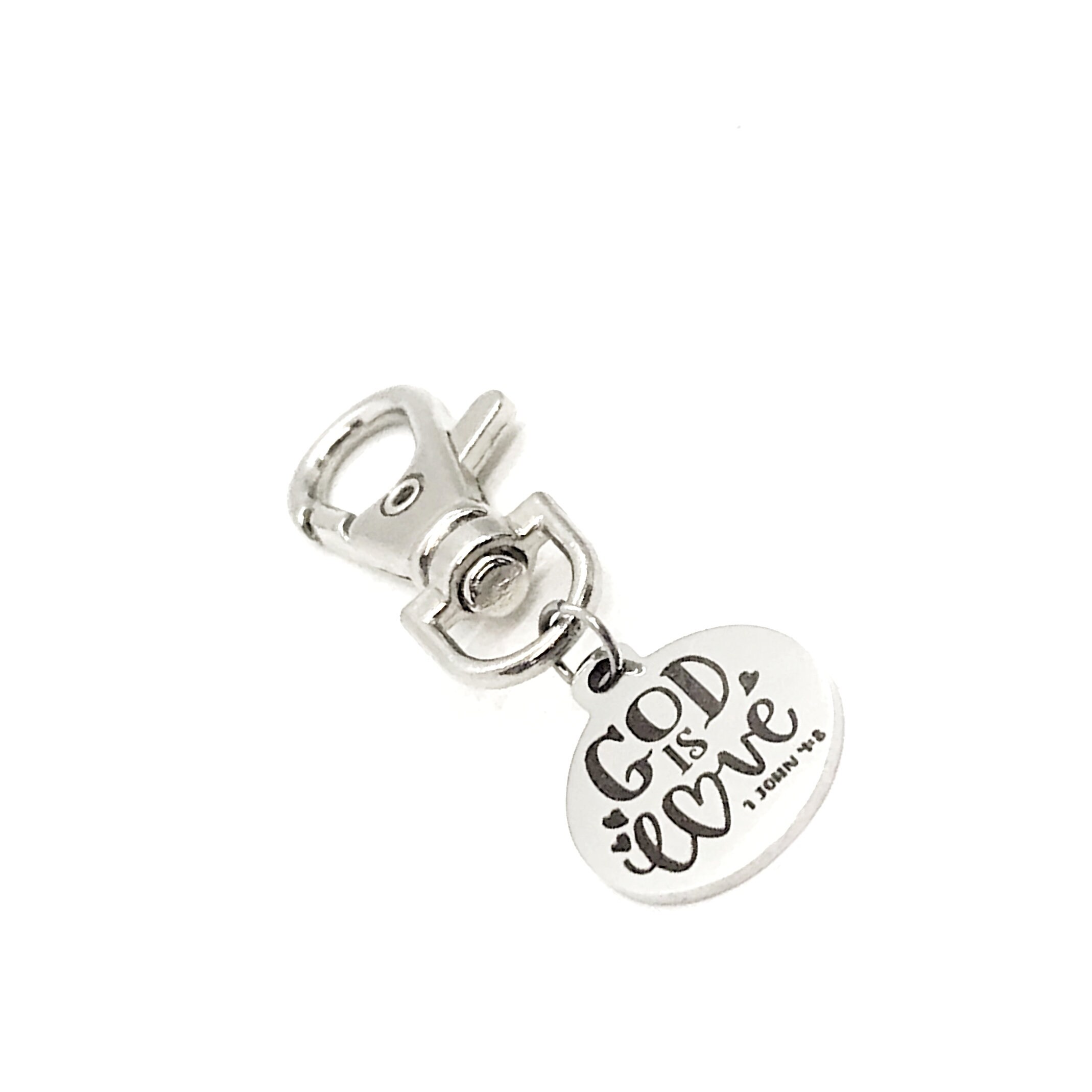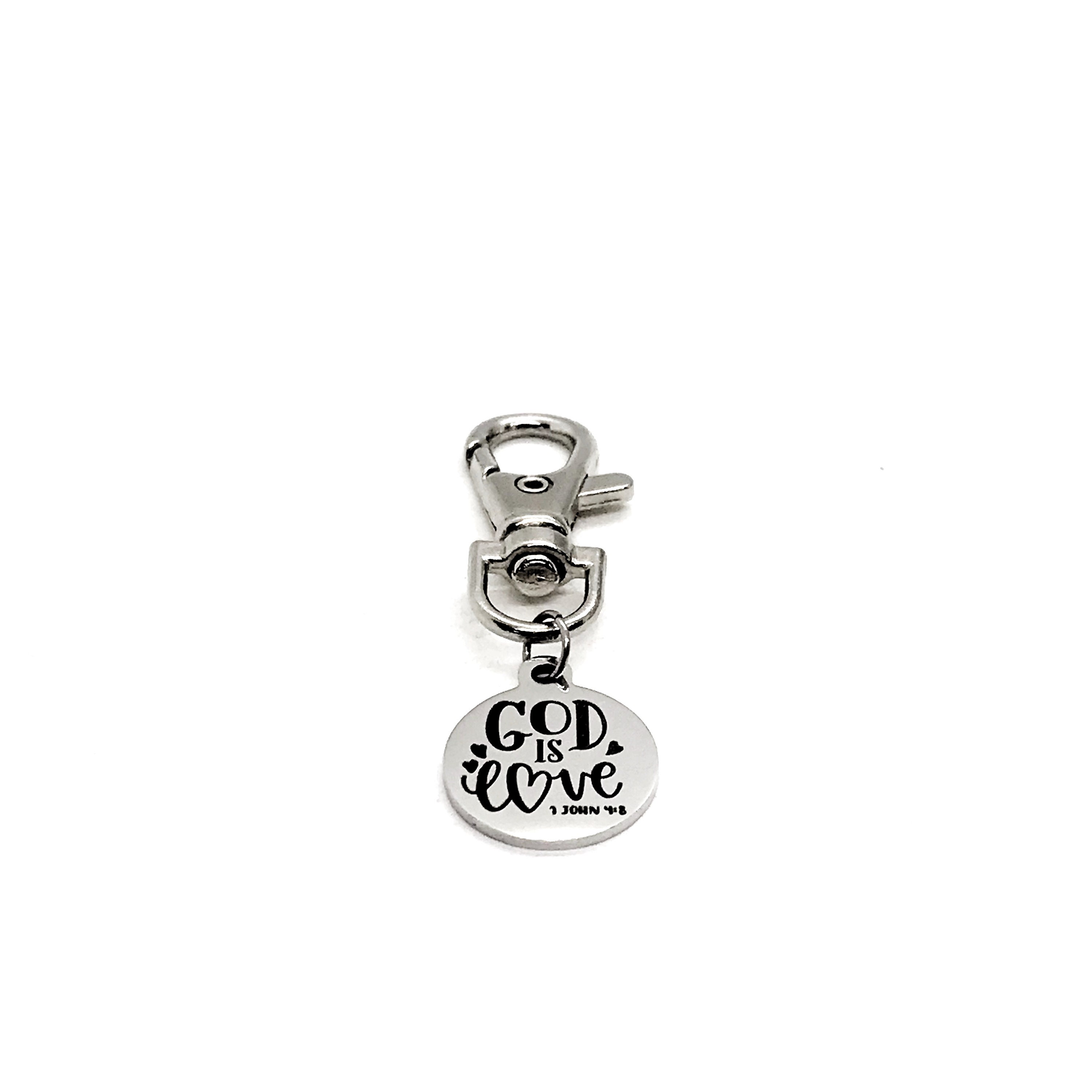 This is a great zipper pull or bag charm clip gift that would be a great gift. It would be a great charm to clip onto a tote, purse, sports bag, book bag or keychain. It has a engraved charm with “God is love” from 1 John 4:8 on it.