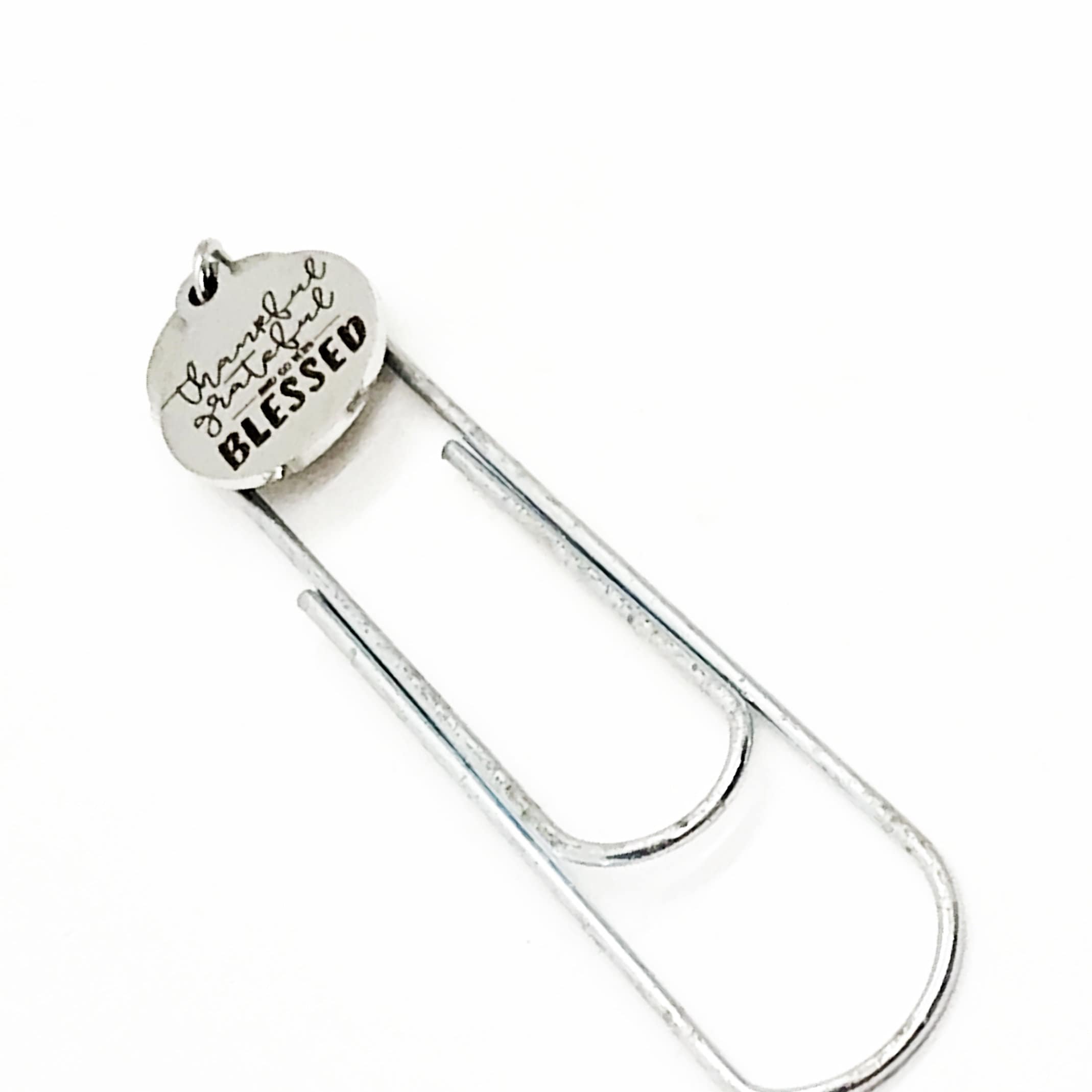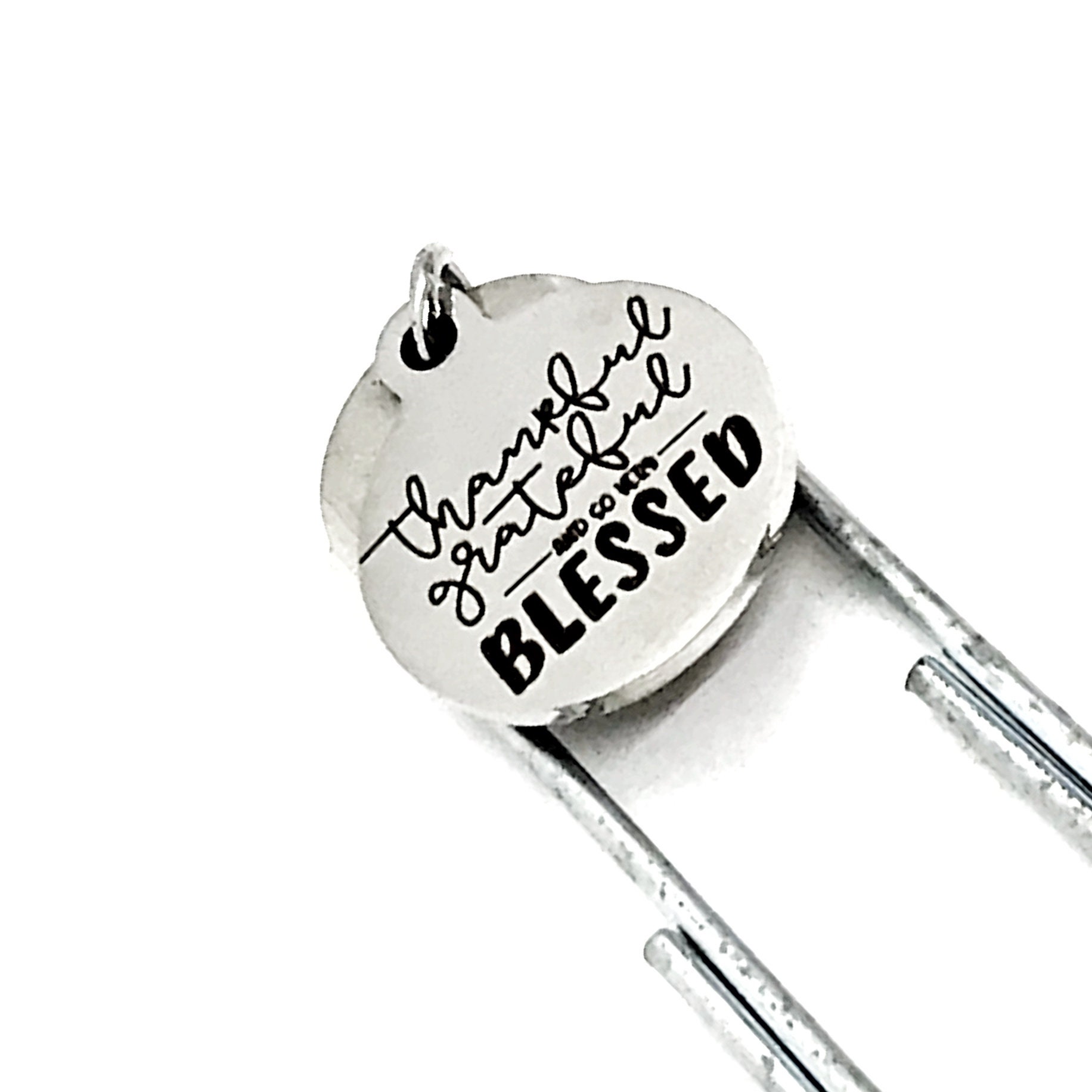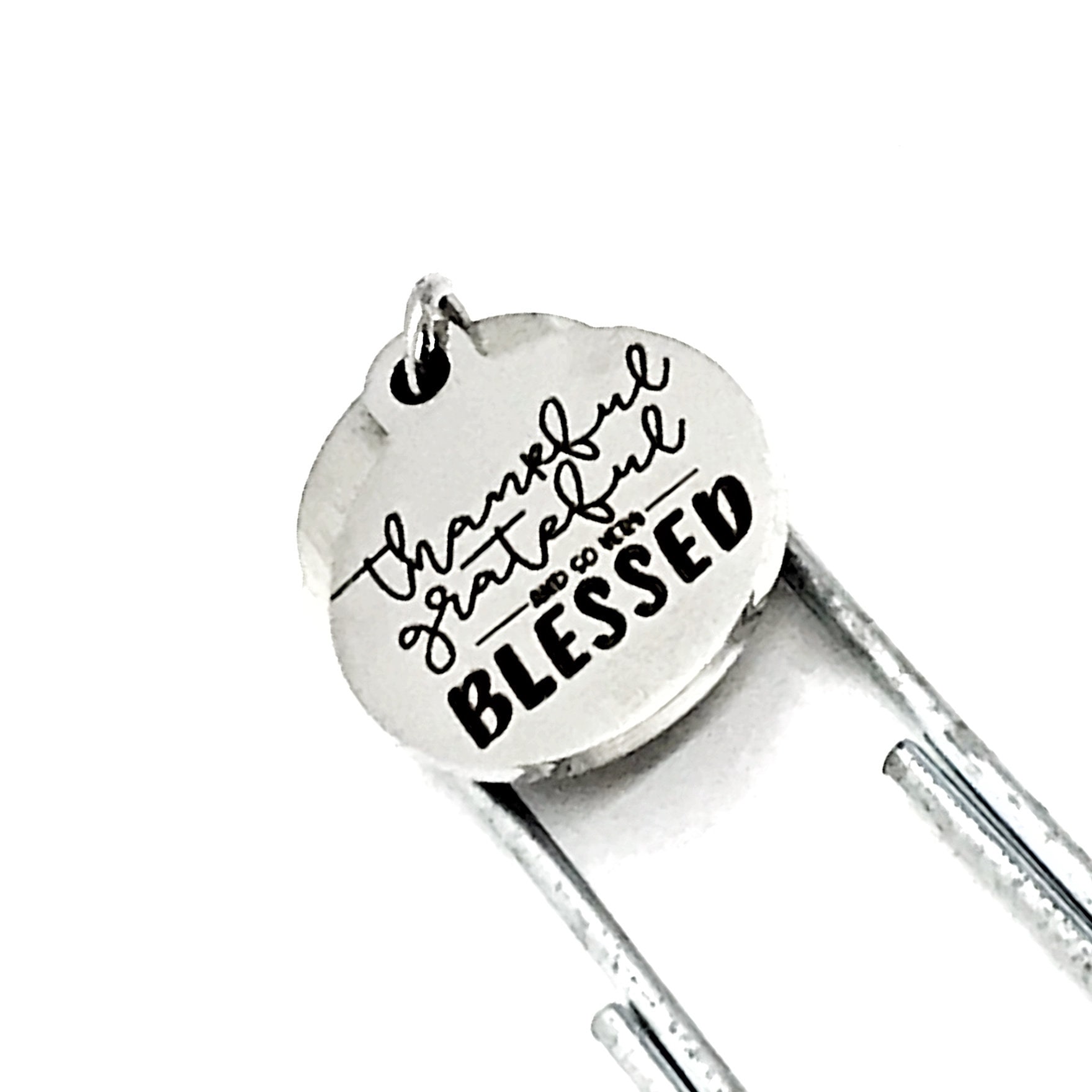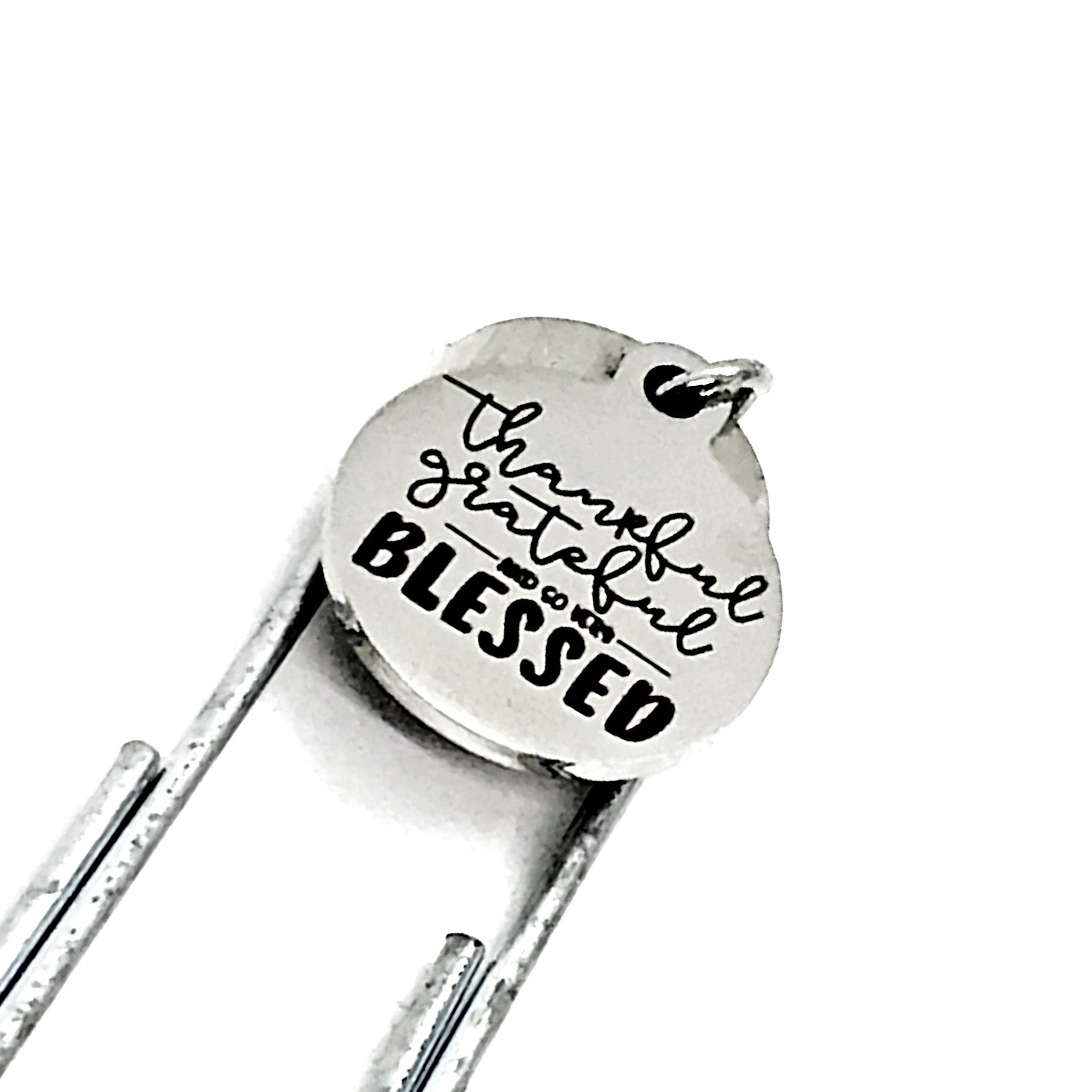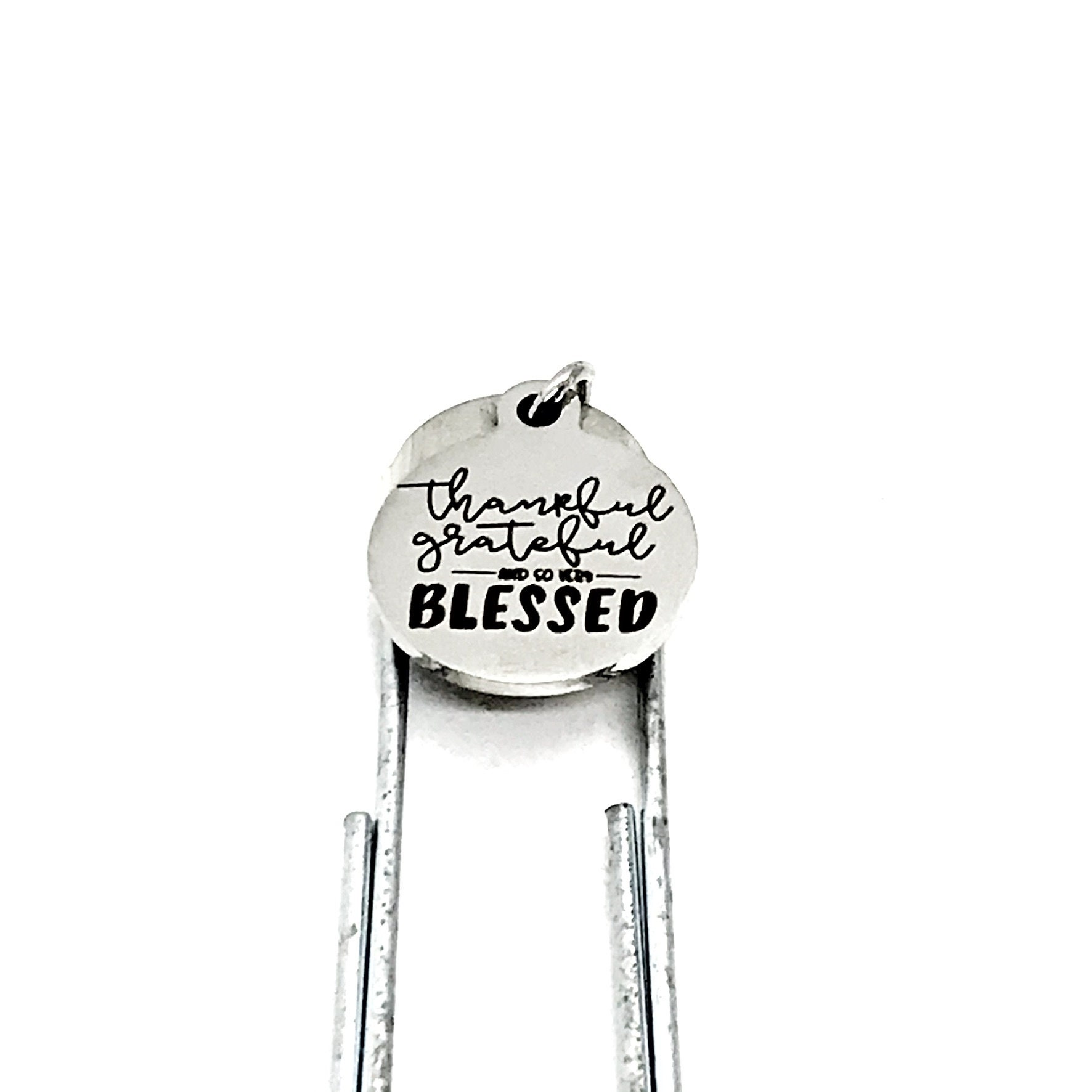 This bookmark has a stainless steel laser engraved charm with “Thankful Grateful and so very Blessed” on it. It can be used as a bookmark, page marker, or planner book mark.