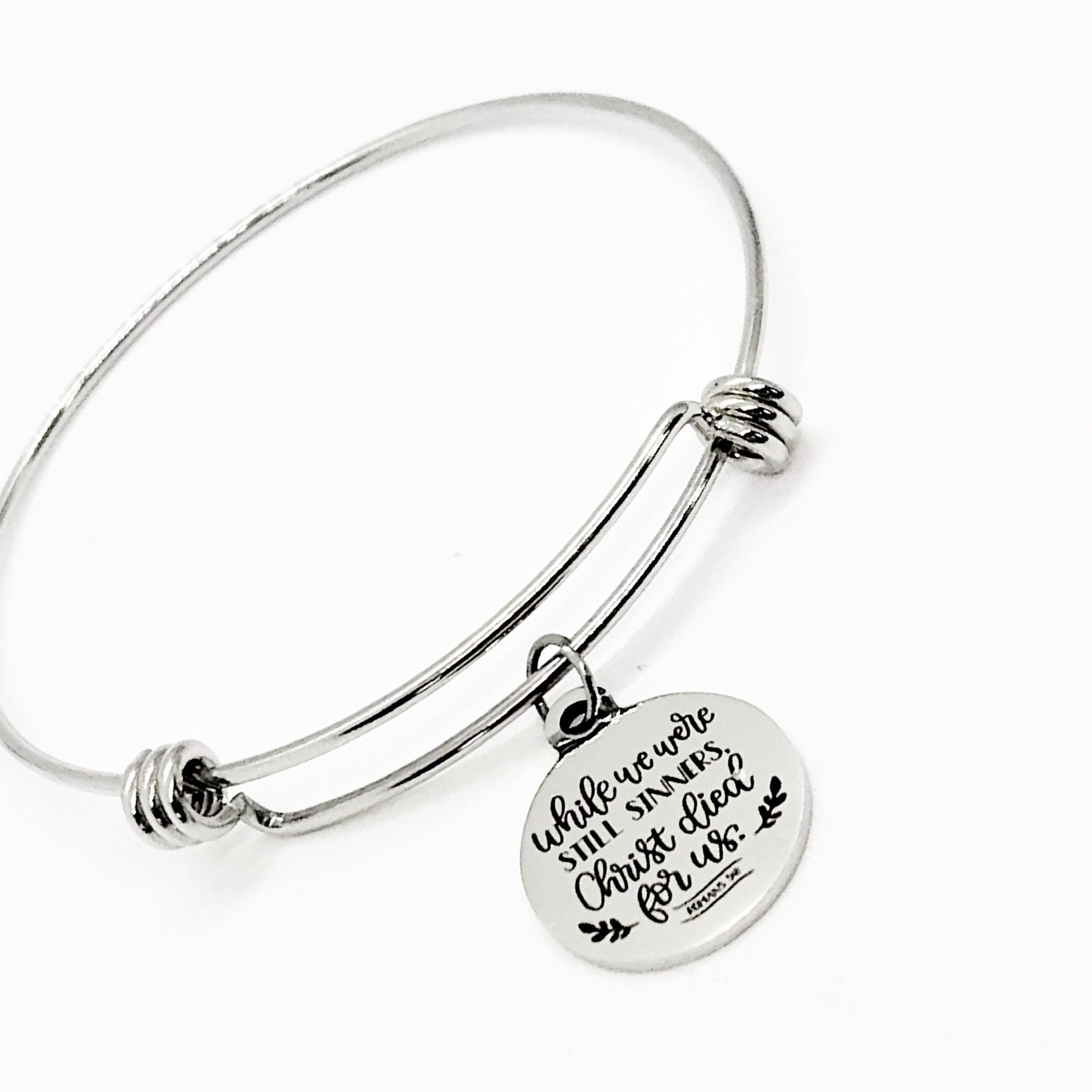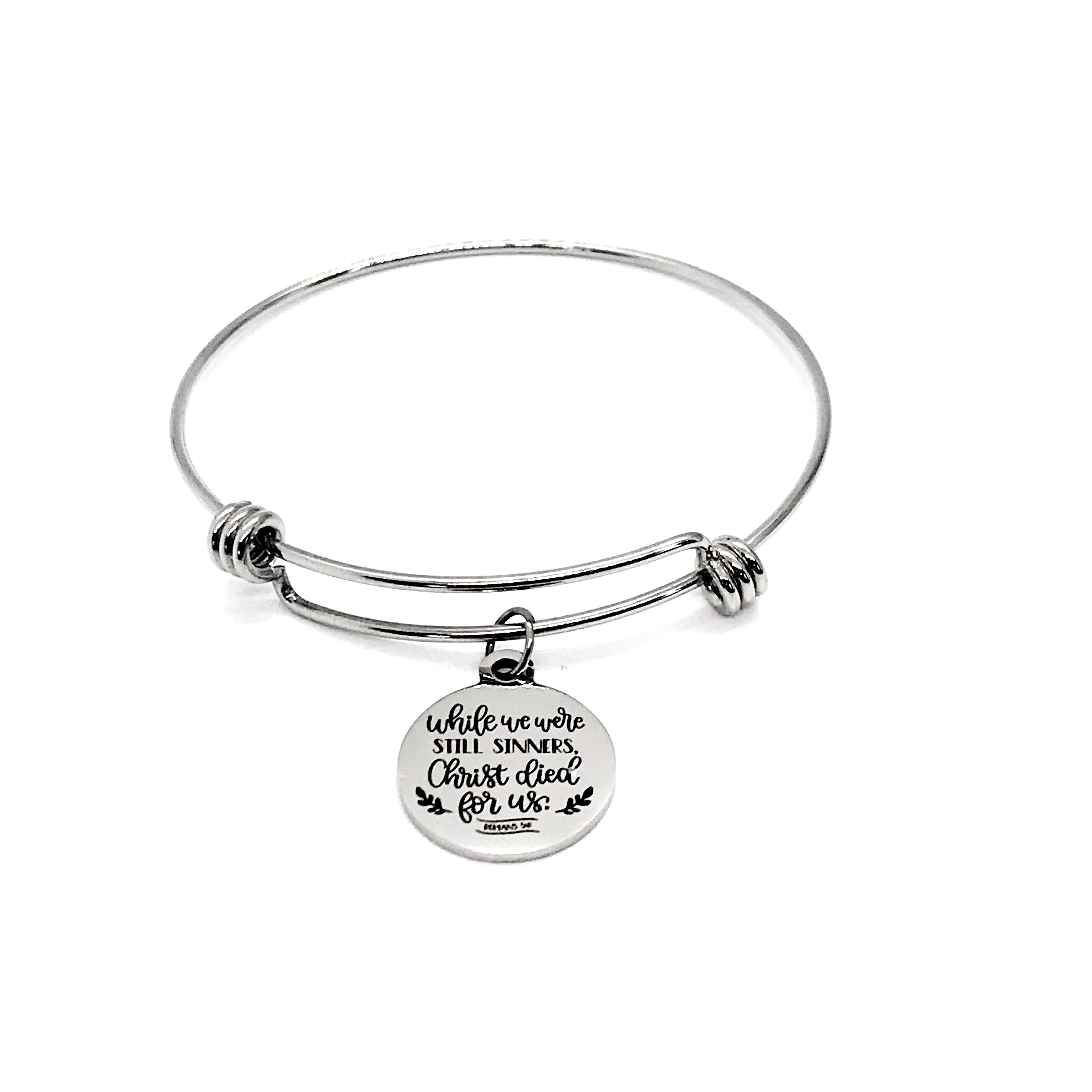 This is a beautiful bangle bracelet with a laser engraved stainless steel charm that has "While we were still sinners, Christ died for us" from Romans 5:8 on it