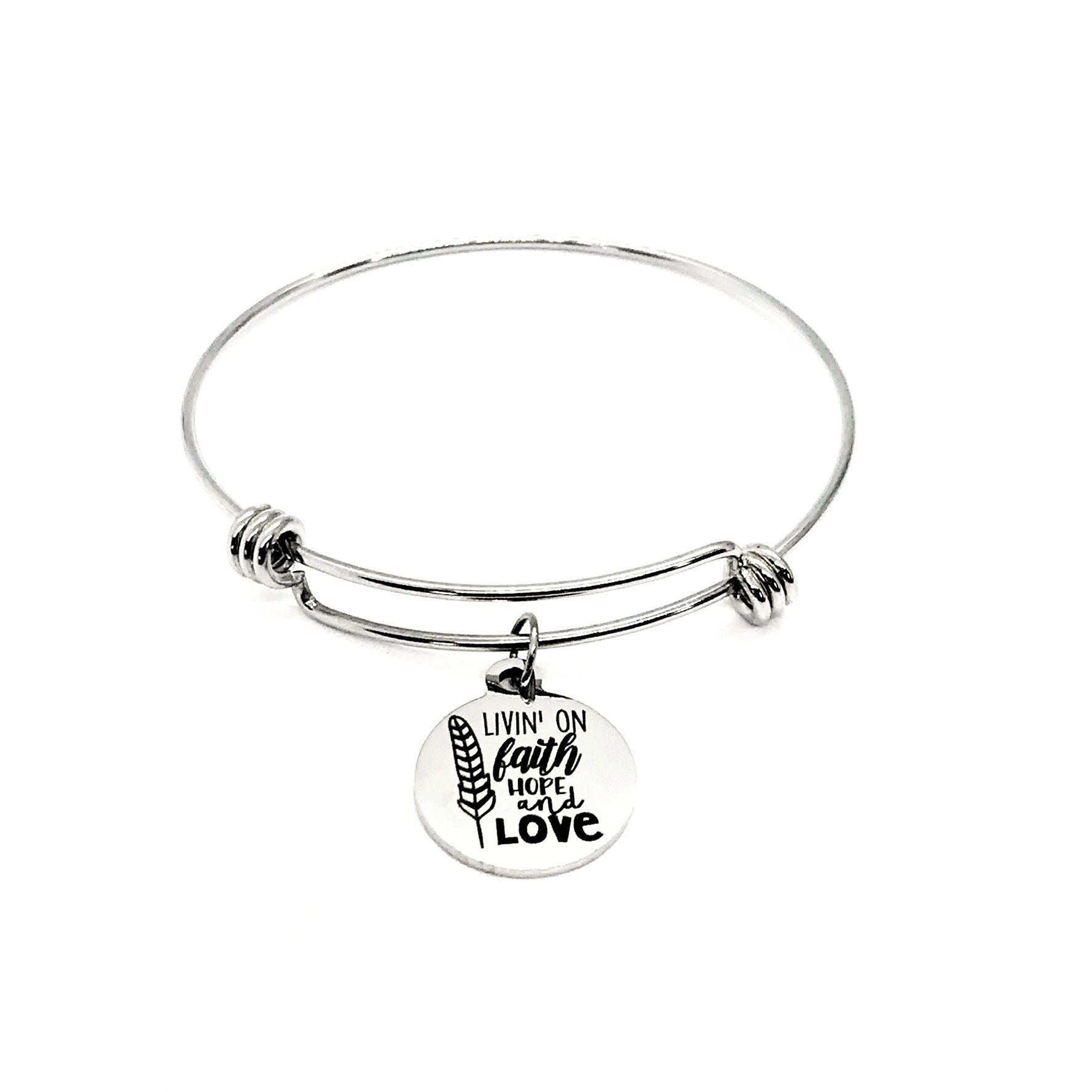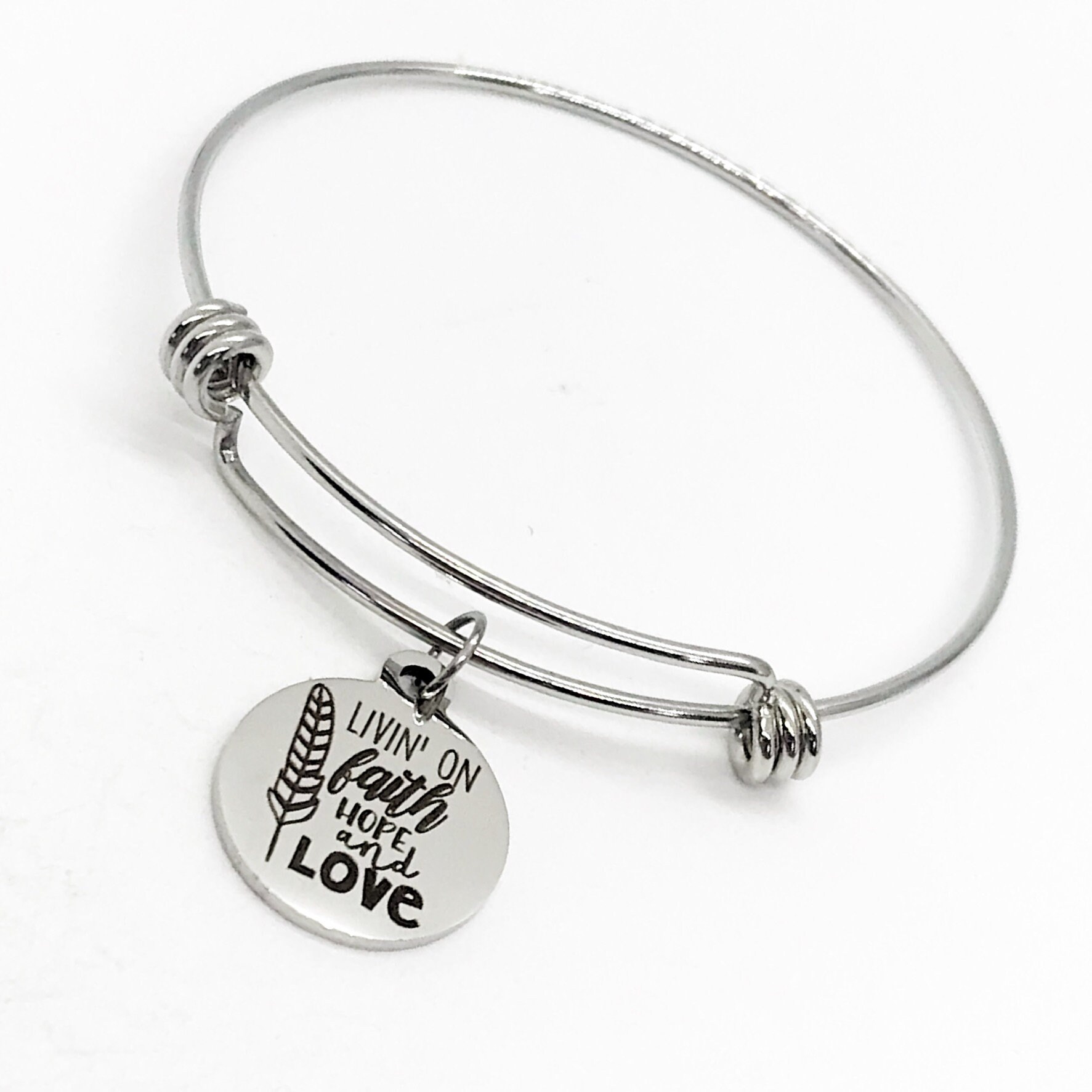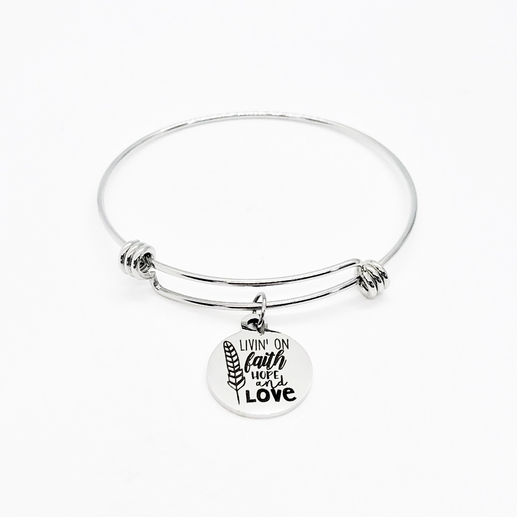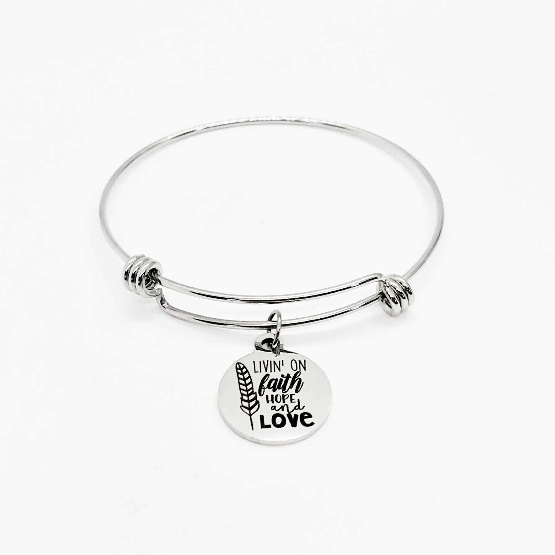 This is a beautiful bangle bracelet with a laser engraved stainless steel charm that has "Livin’ on faith hope and love" on it